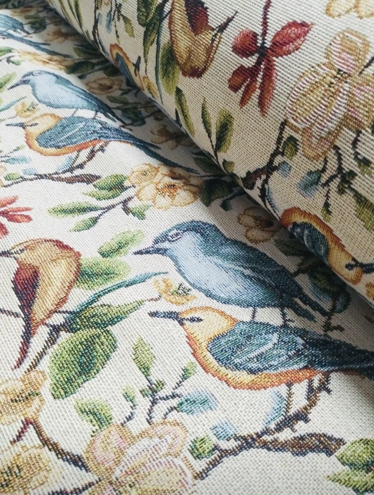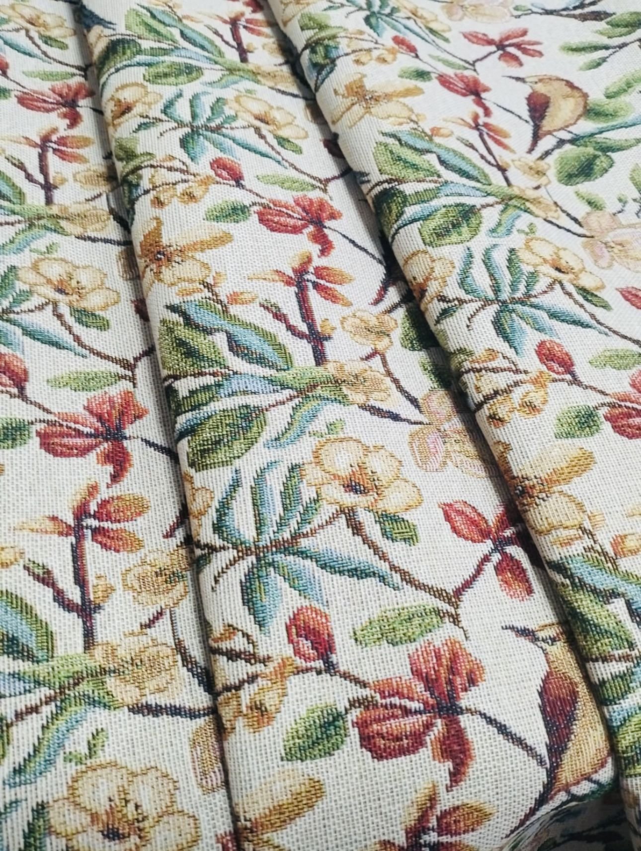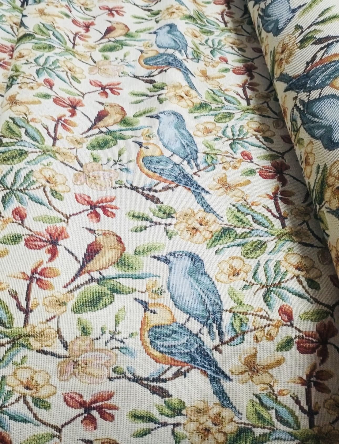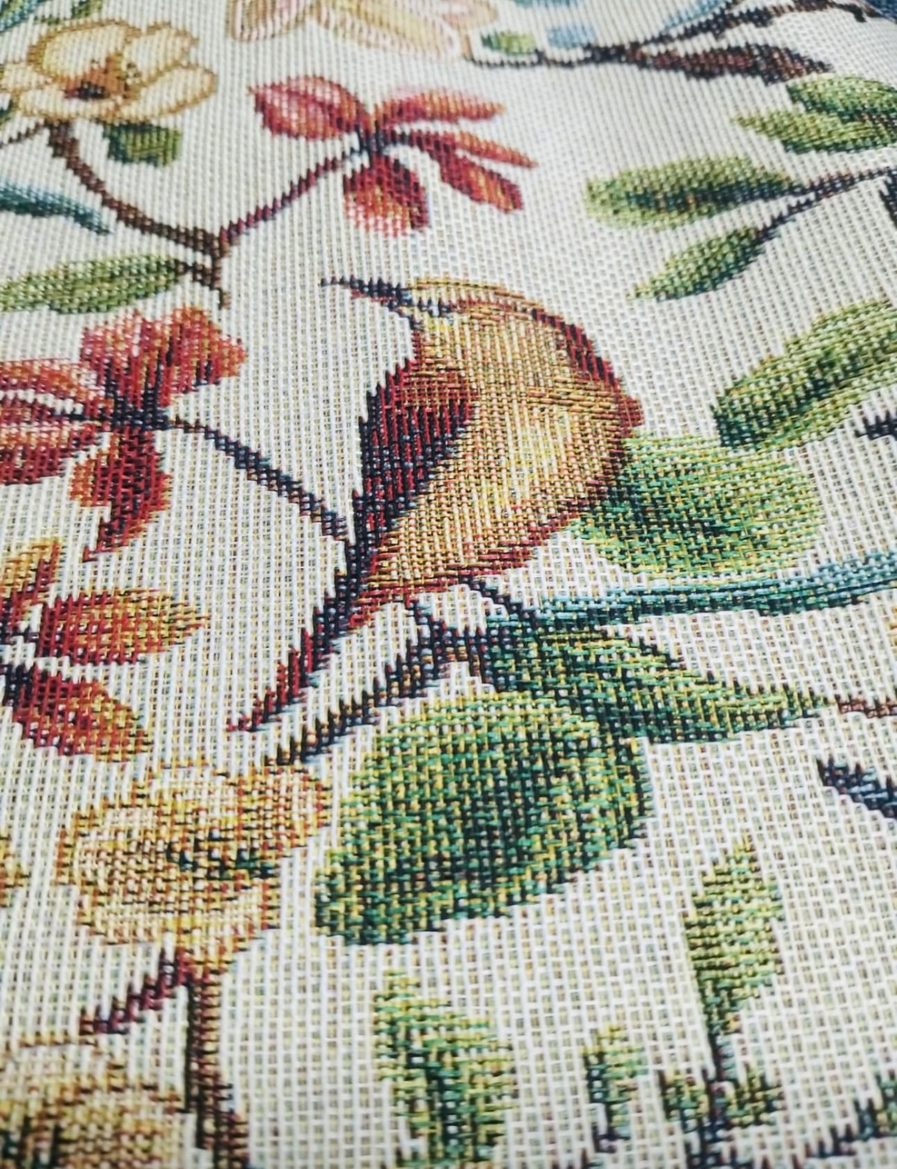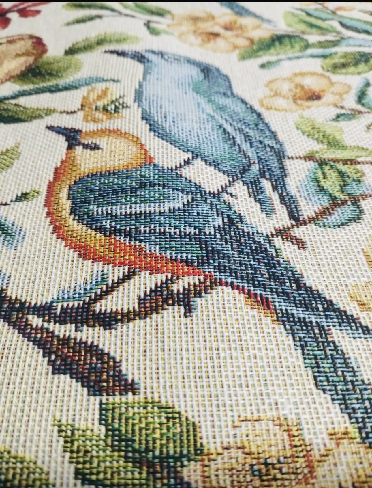 Tela de Loneta Jacquard estilo gobelino de colores muy vistosos toda en mosaico de figuras de flores y pájaros multicolor.