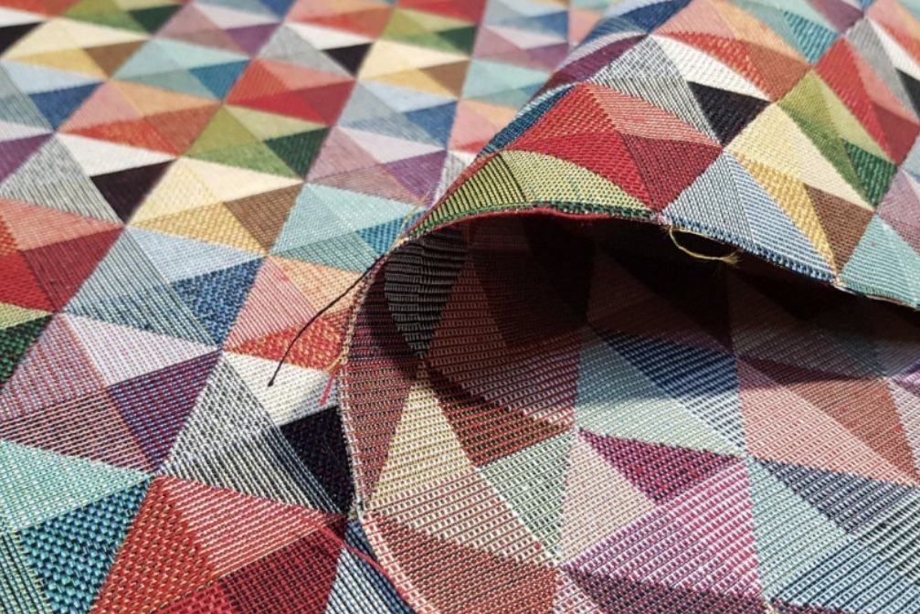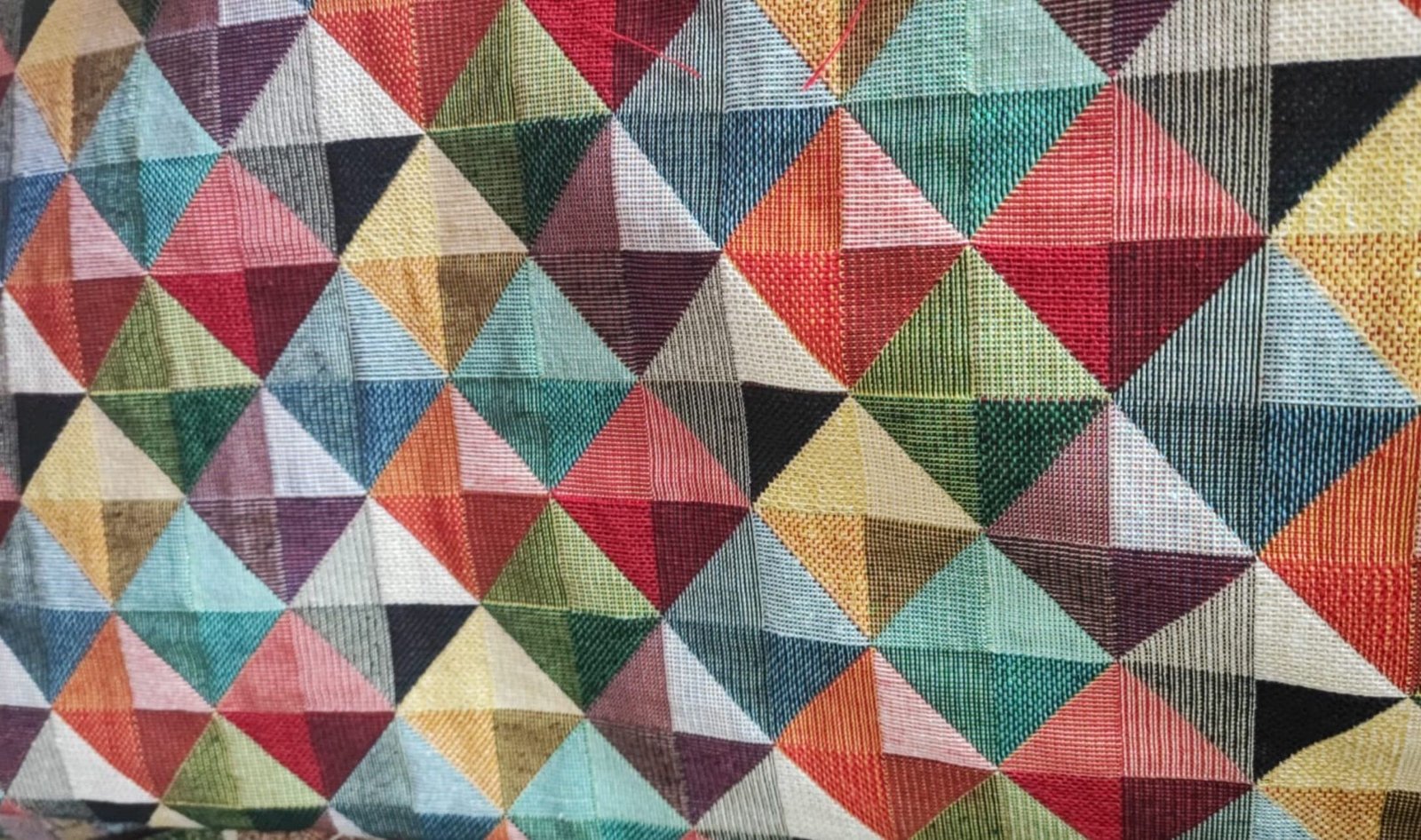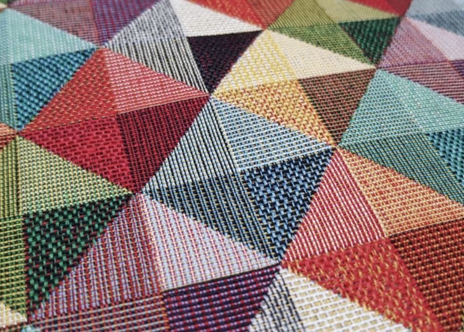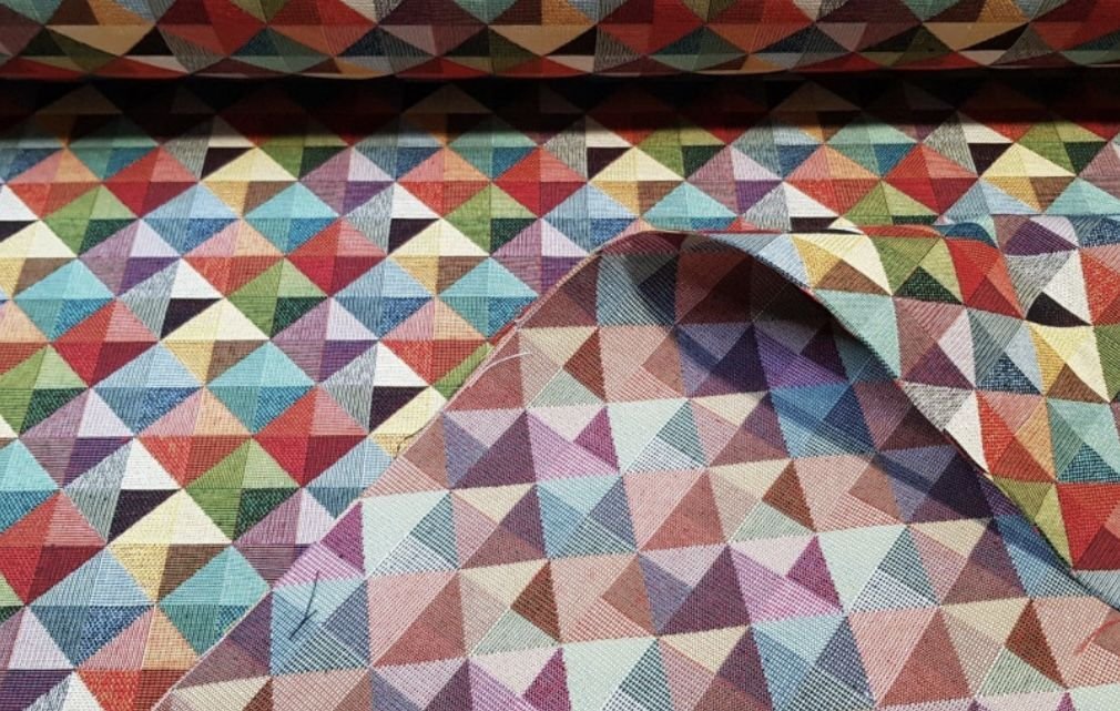 Tela de Loneta jacquard estilo gobelino de colores muy vistosos toda en mosaico de figuras de rombos multicolor.