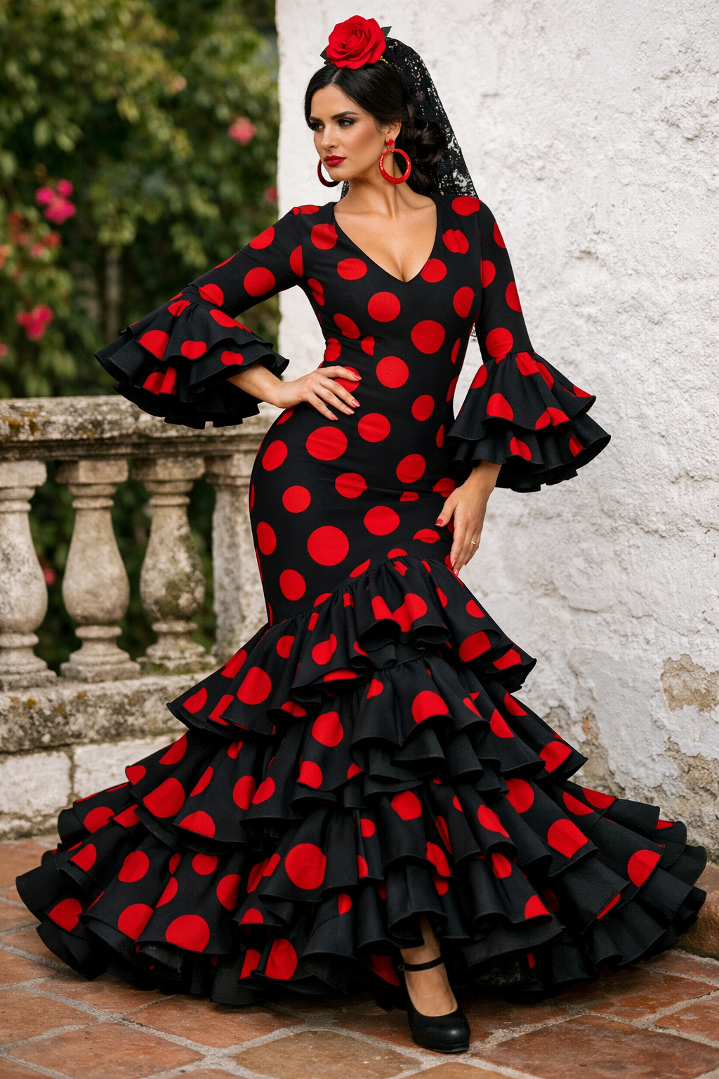Tejido Natasha Flamenco Lunares Rojos y Fondo Negro