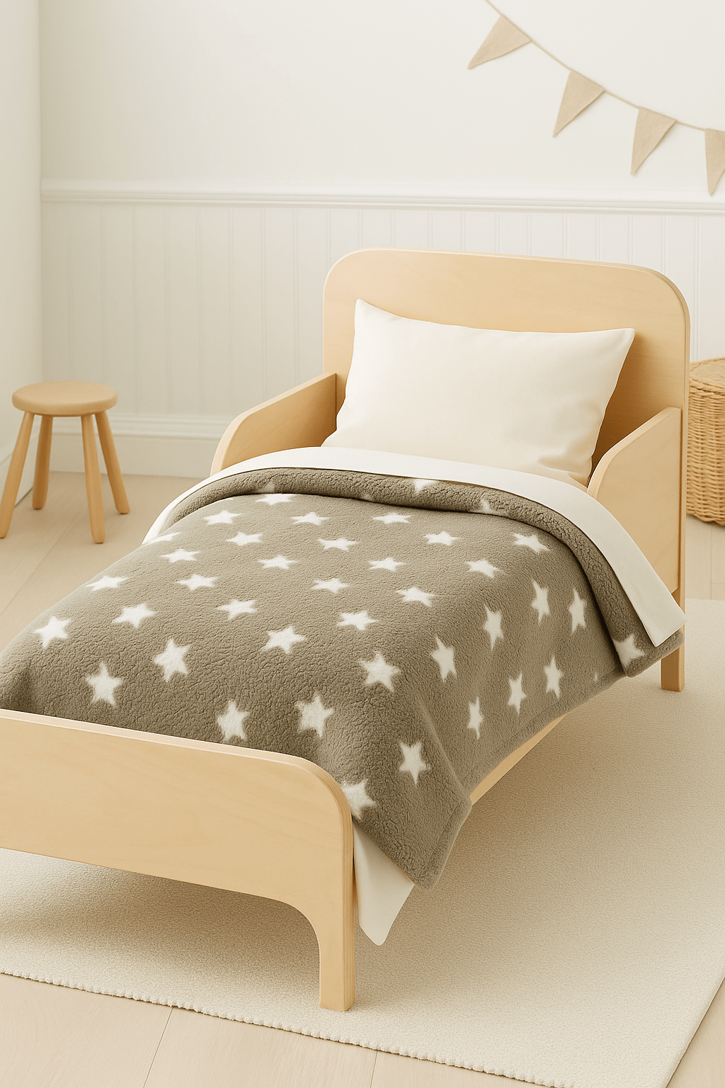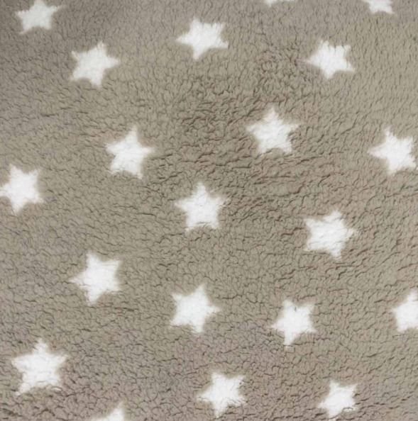 La tela Polar Sherpa Fleece color visón con Motivo de estrellas Pequeñas es perfecta para proyectos que requieren calidez, suavidad y un toque encantador.