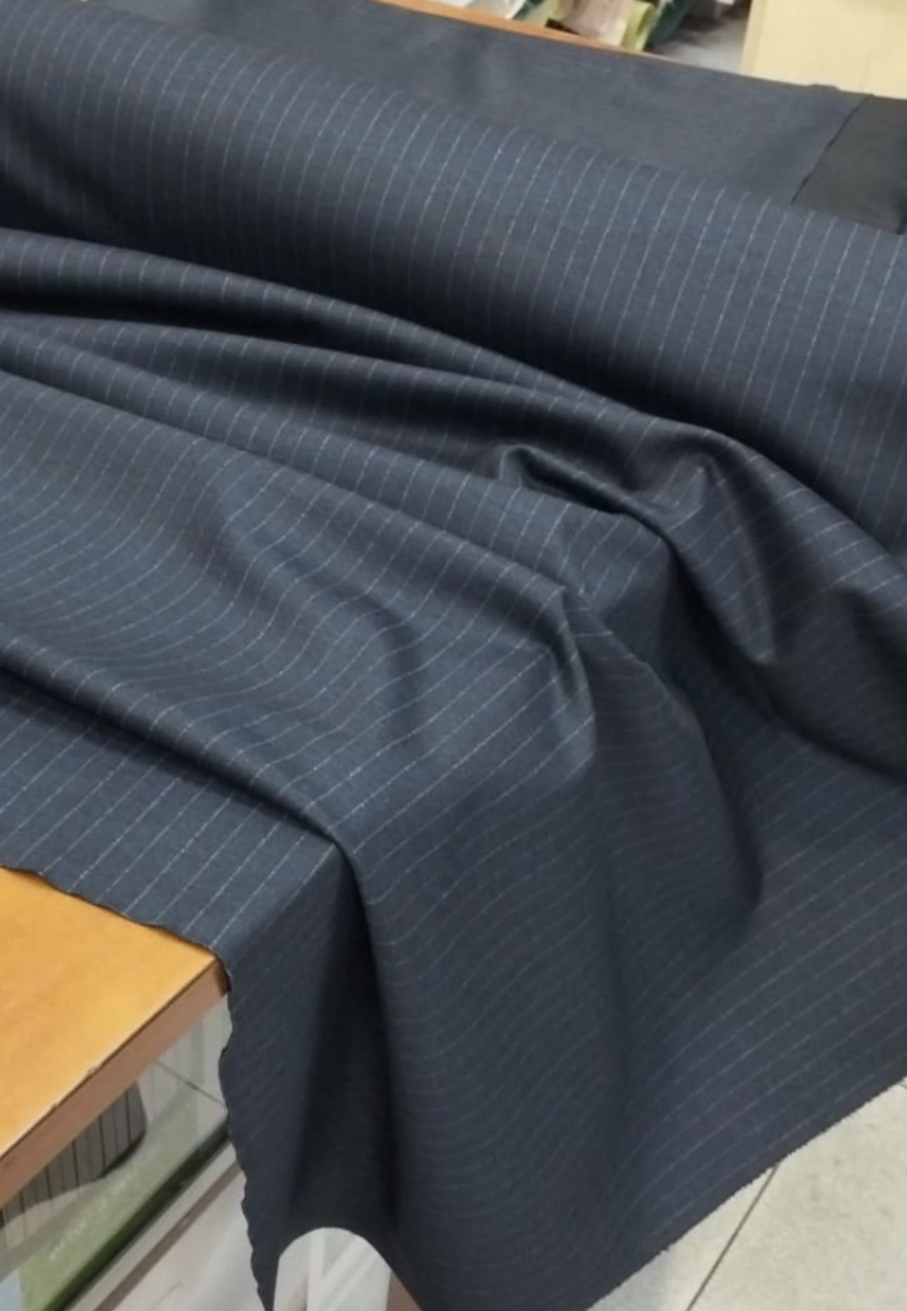 Tejido de vestir azul marino con raya diplomática en gris de poliéster, viscosa y elastómero, es una tela que se caracteriza por el vuelo y fluidez, proporcionando gran movimiento en las prendas confeccionadas. Tejido con una delicada caída y textura muy suave, es muy similar a la bambula, pero de calidad superior. Tela ideal para vestidos, faldas con movimiento y muy fluidas, kimonos e incluso para blusas y pantalones. No se arrugan.