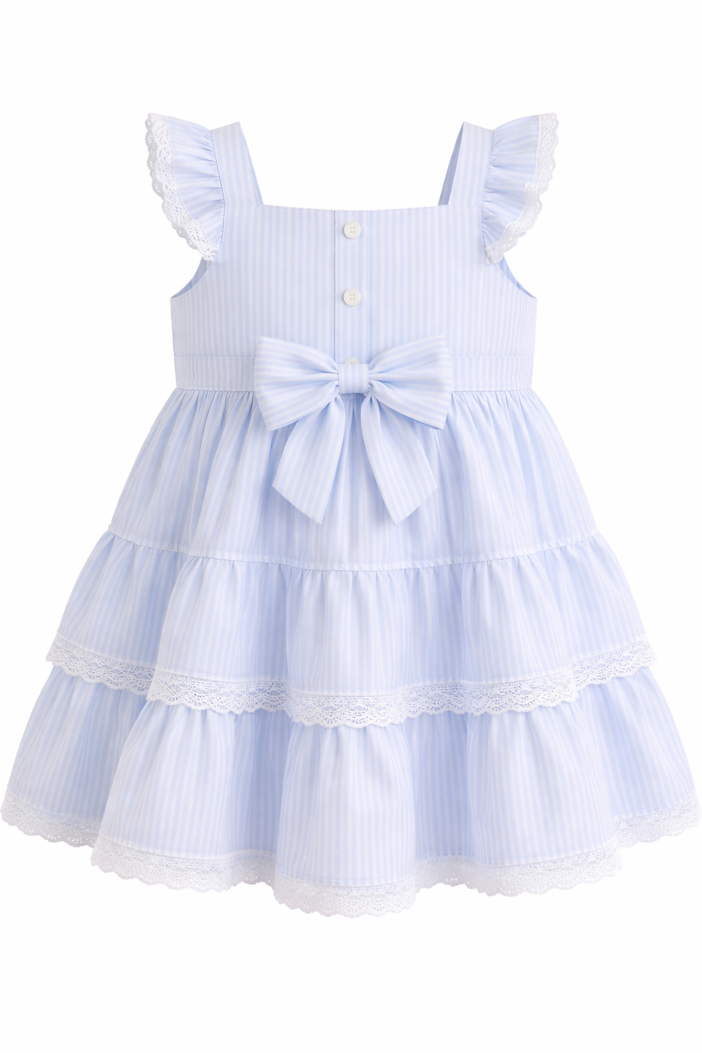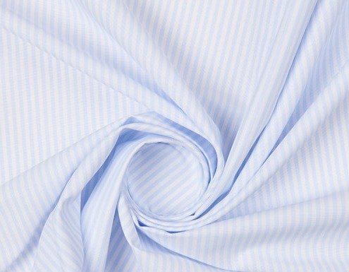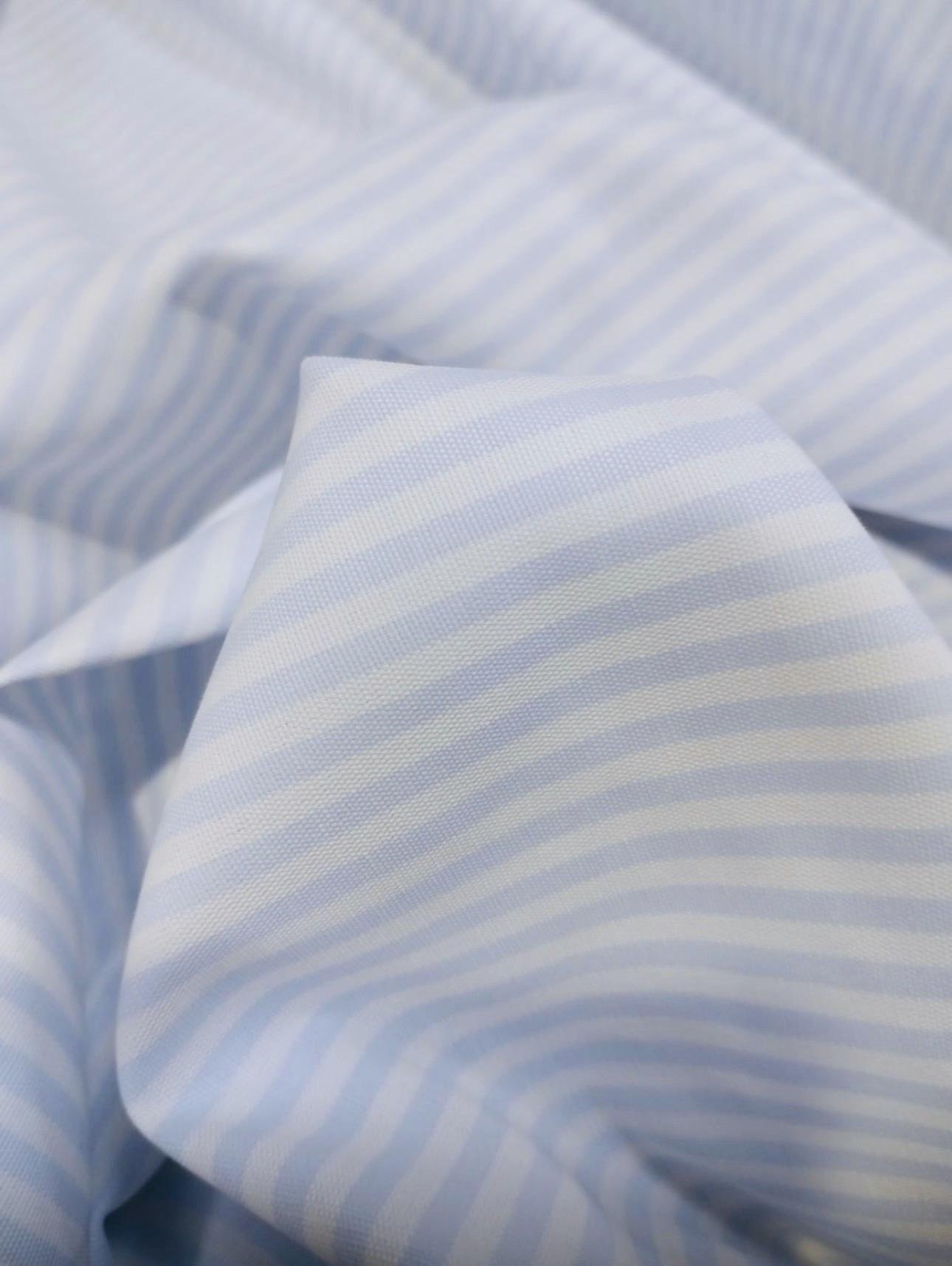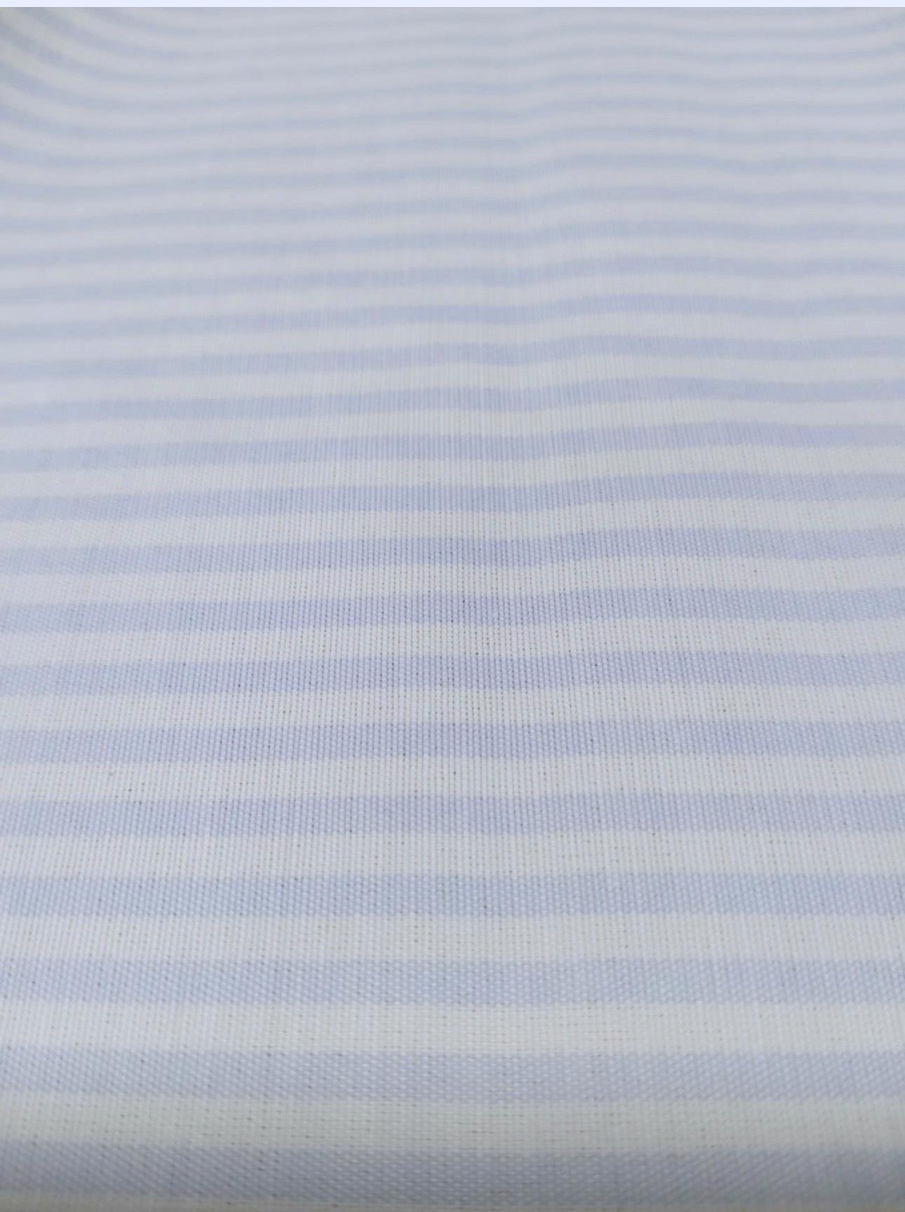 Tejido vichy de rayas finas (3 mm) en color celeste bebé, de aspecto suave y ligero. Está compuesto por 70% algodón y 30% poliéster, lo que combina transpirabilidad con resistencia y fácil mantenimiento.