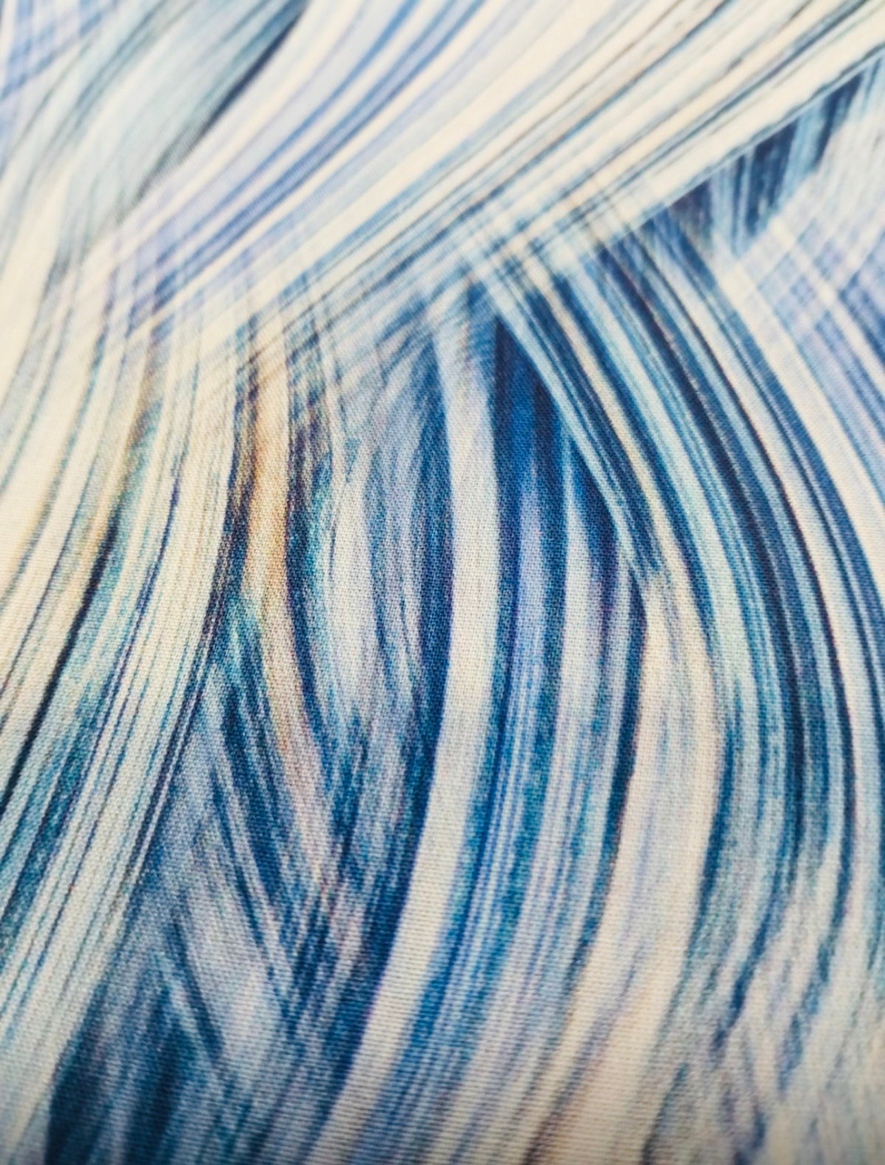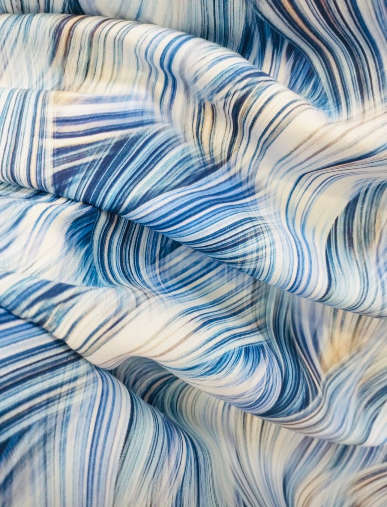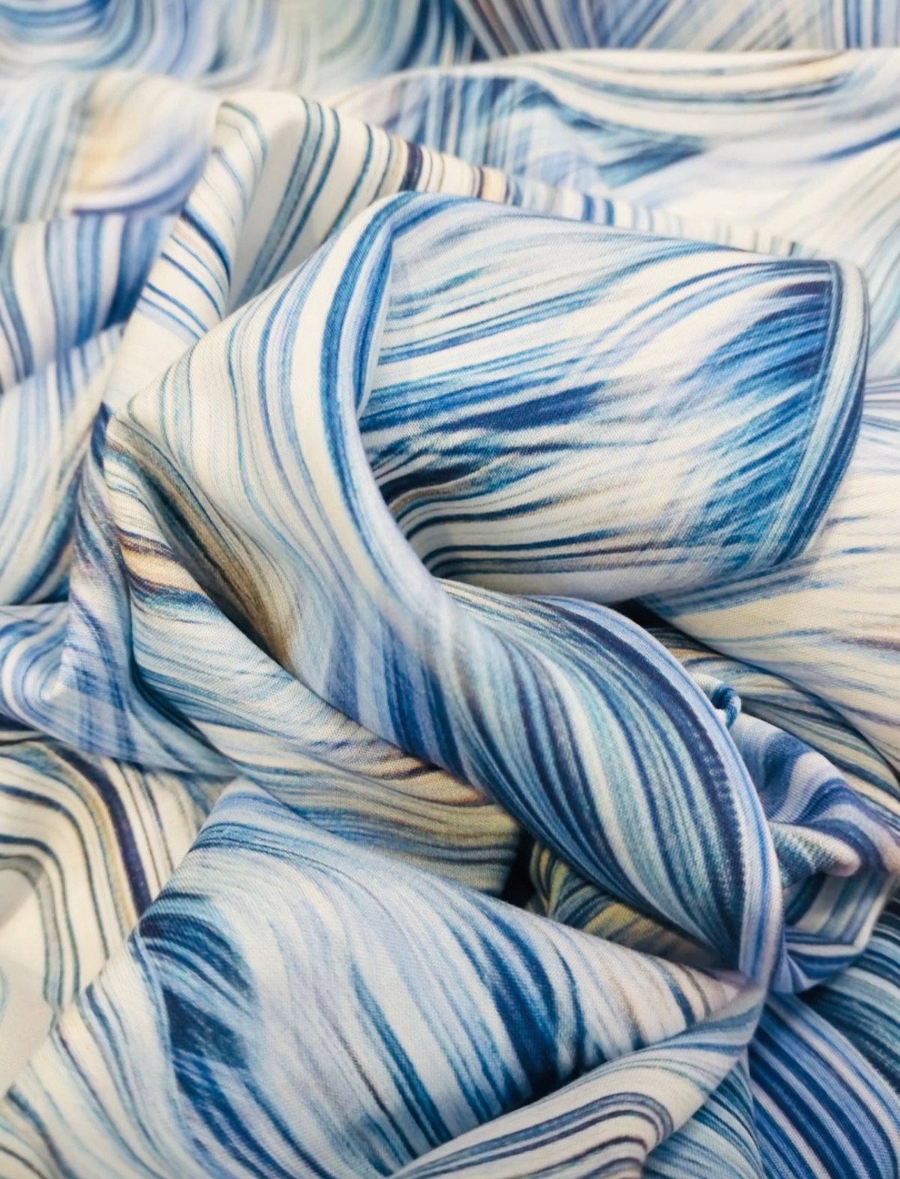 Tejido suave estampado con mucha caída. Estampado abstracto. Es una tela que se caracteriza por el vuelo y fluidez, proporcionando gran movimiento en las prendas confeccionadas. Tejido con una delicada caída y textura muy suave ligeramente rugosa, es muy similar a la bambula, pero de calidad superior. Tela ideal para vestidos, faldas con movimiento y muy fluidas, kimonos e incluso para blusas y pantalones. No se arrugan.