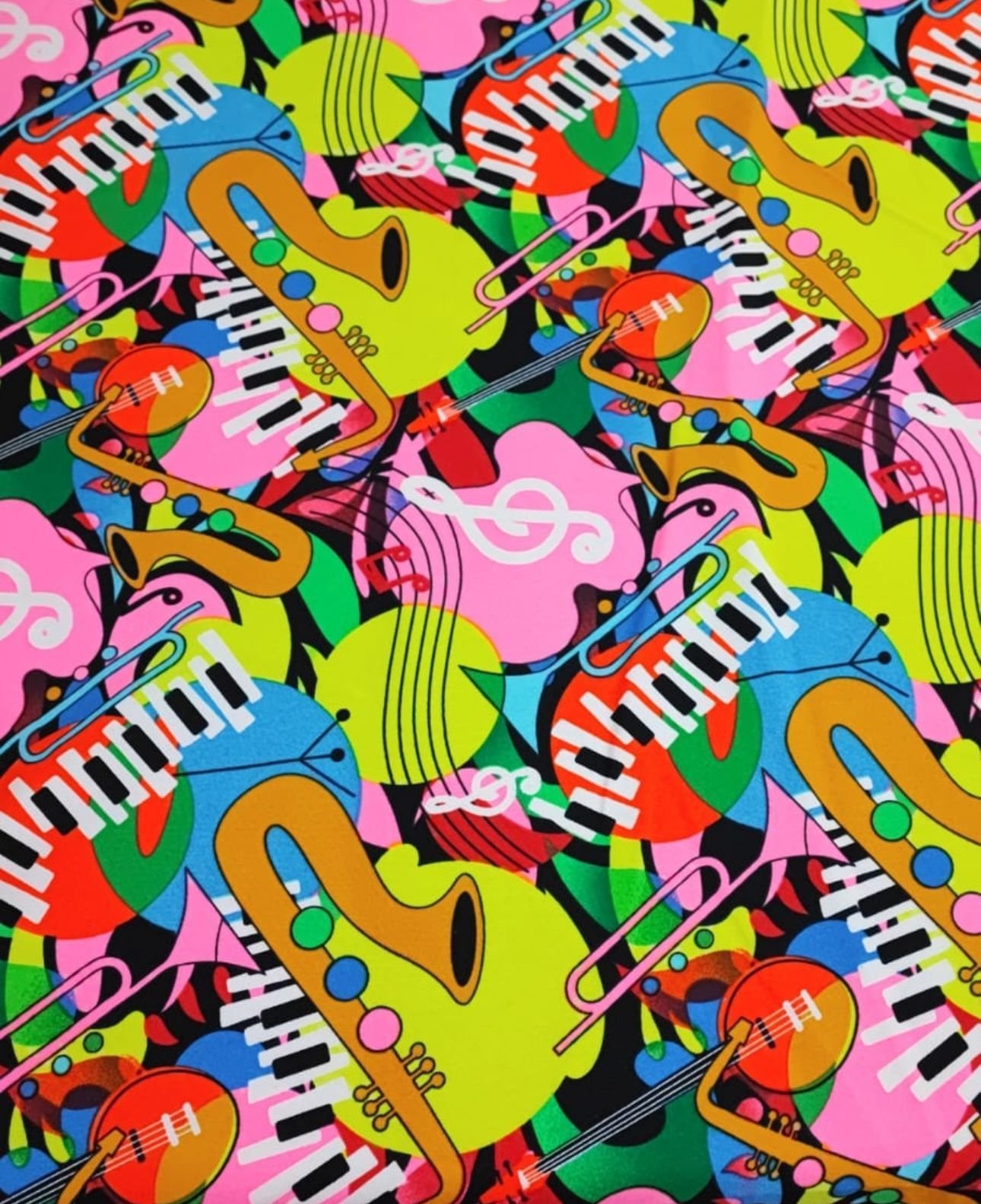 Tejido de poliéster (strech) con estampado musical. Tinta flúor.