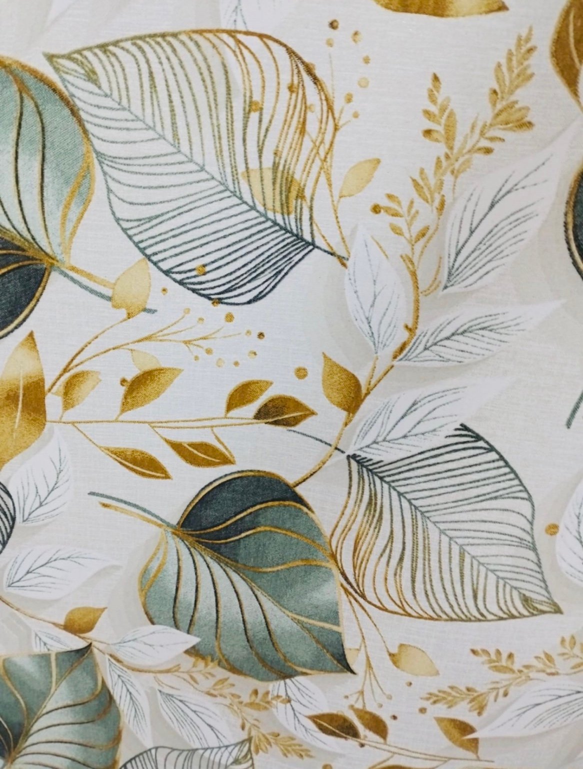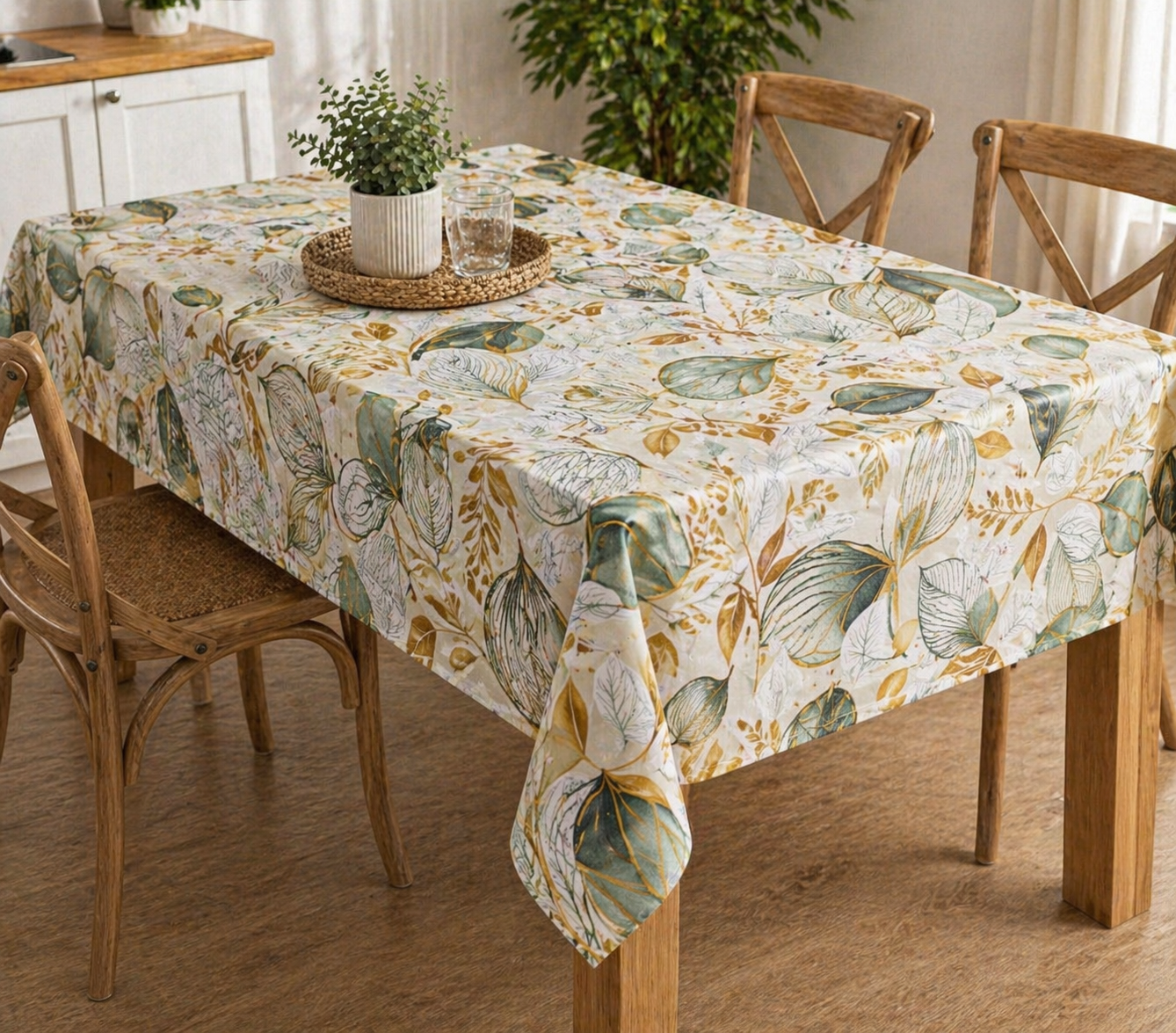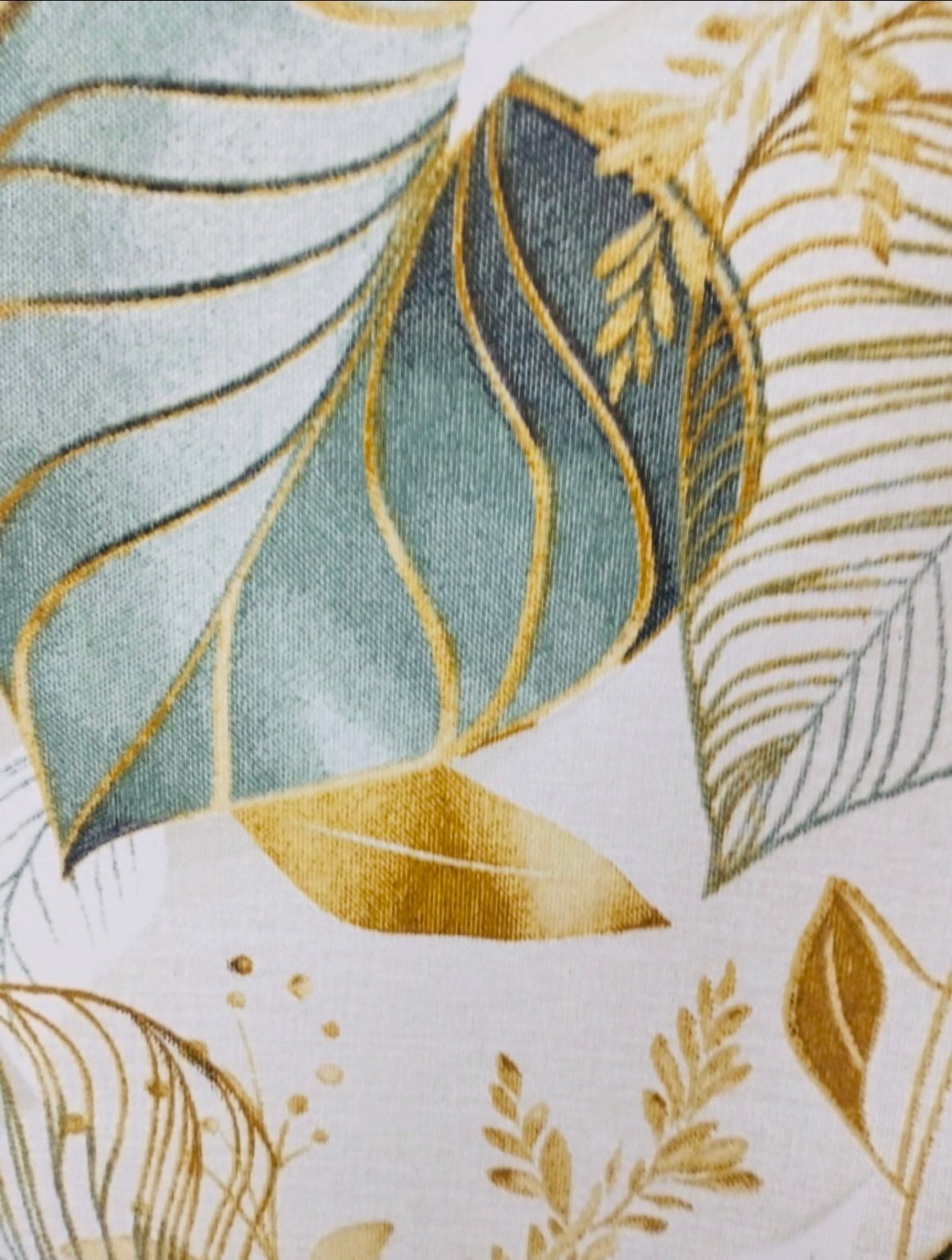 Mantel resinado de 140 cm de ancho con elegante estampado botánico de hojas en tonos verde salvia, petróleo y mostaza, sobre fondo beige natural. Un diseño sofisticado y decorativo que aporta calidez, luz y un estilo natural contemporáneo a la mesa.