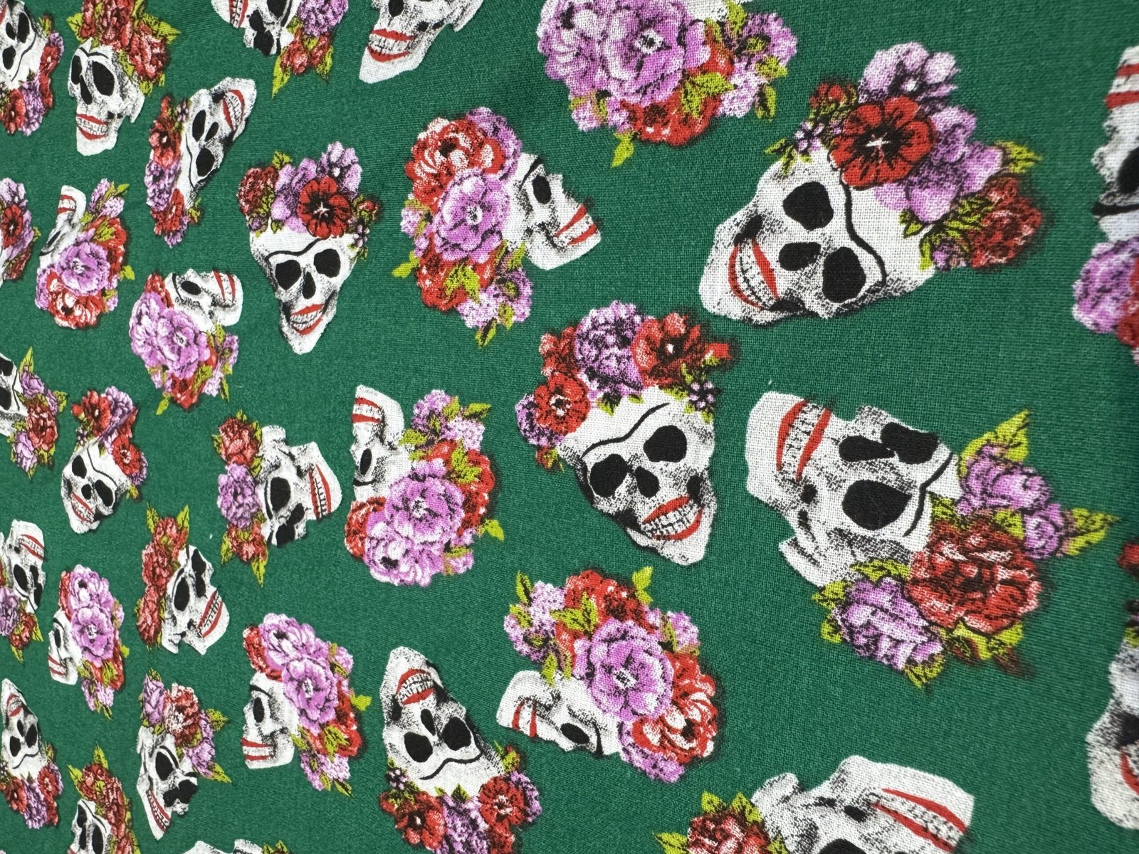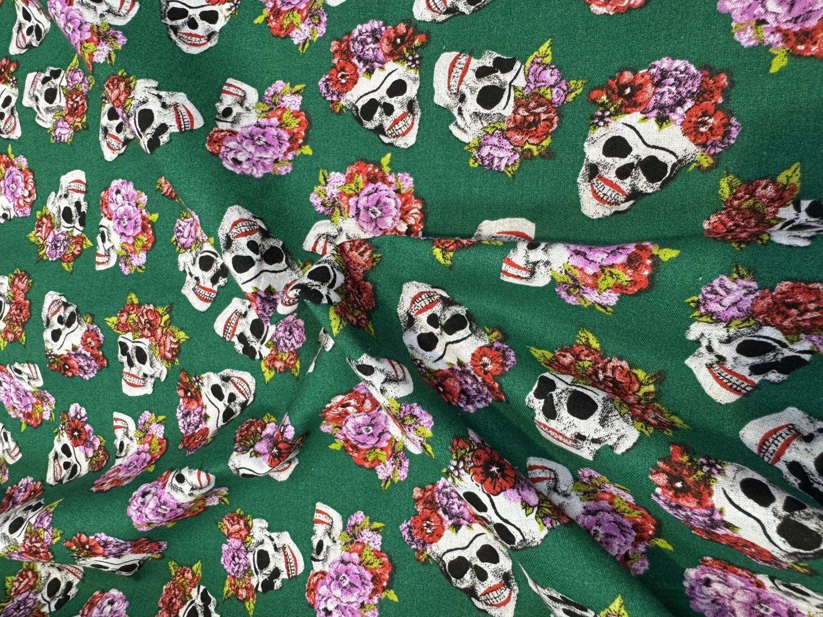 Tela de popelín de algodón con estampado digital de dibujos “terroríficos” característicos de Halloween, un estampado con leve sombreado para un efecto 3D vivo en multicolores.