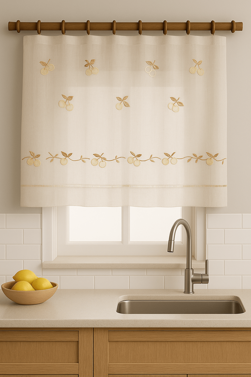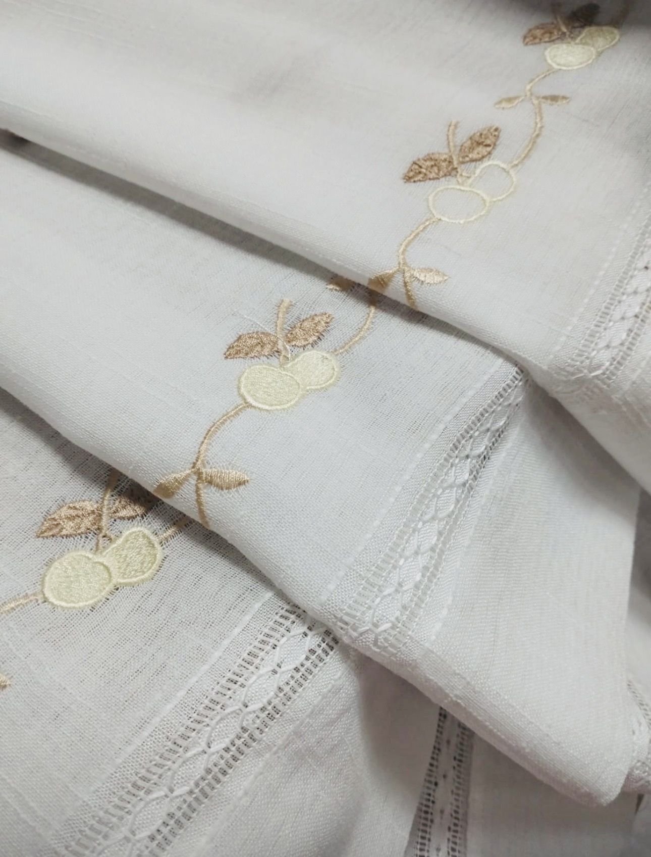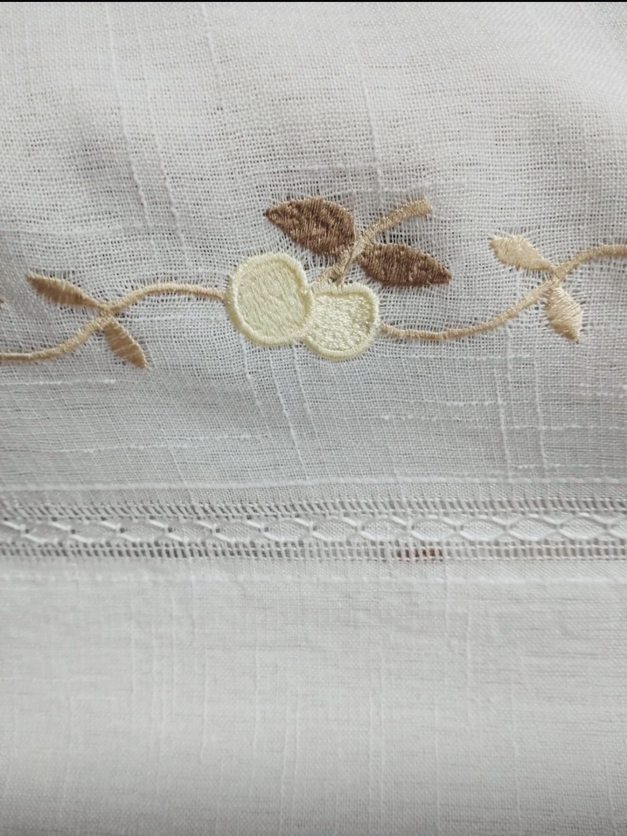 Tela de poliéster 100% con una caída y un tacto exquisito con una altura de 280cm. Con estampación arriba y abajo, ideal para aprovechar el tejido, dando opción a dos ventanas cortas o volante y puerta. Bajo doble con vainica.