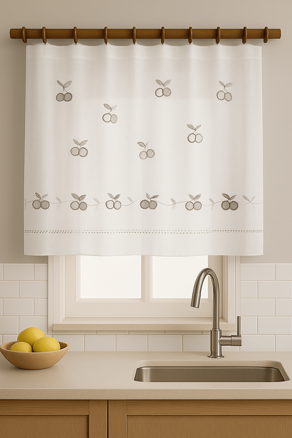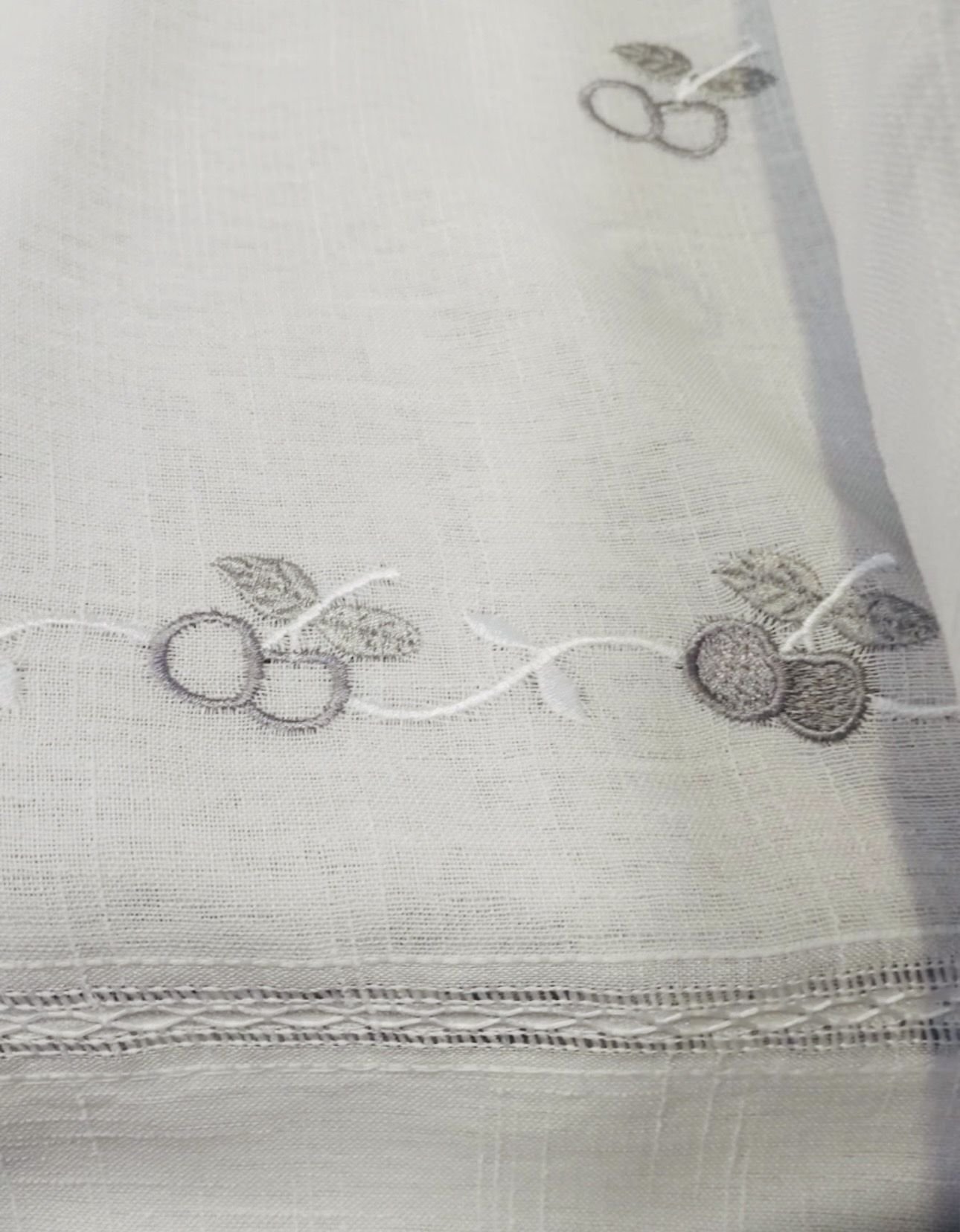 Tela de poliéster 100% con una caída y un tacto exquisito con una altura de 280cm. Con estampación arriba y abajo, ideal para aprovechar el tejido, dando opción a dos ventanas cortas o volante y puerta. Bajo doble con vainica.