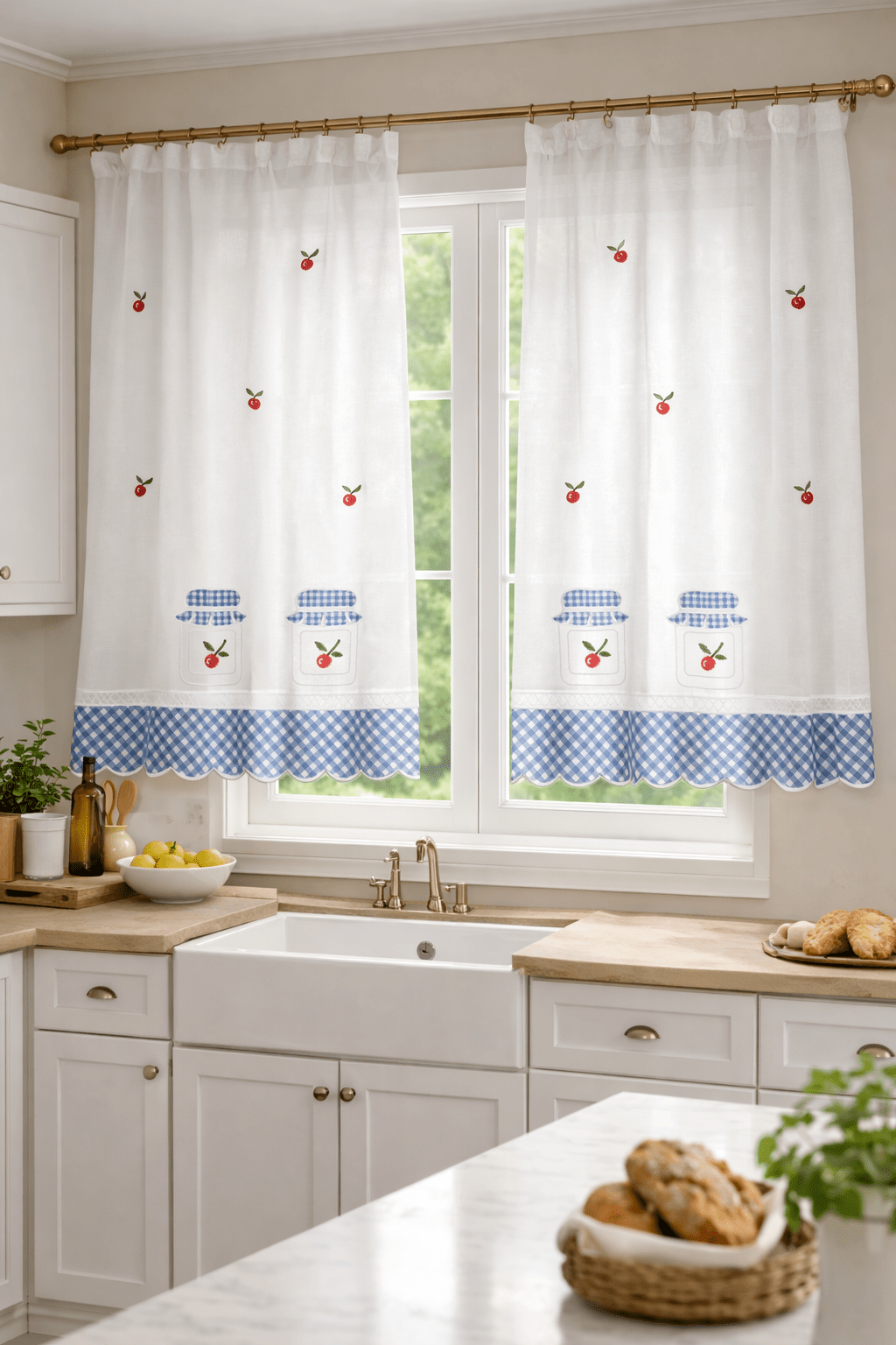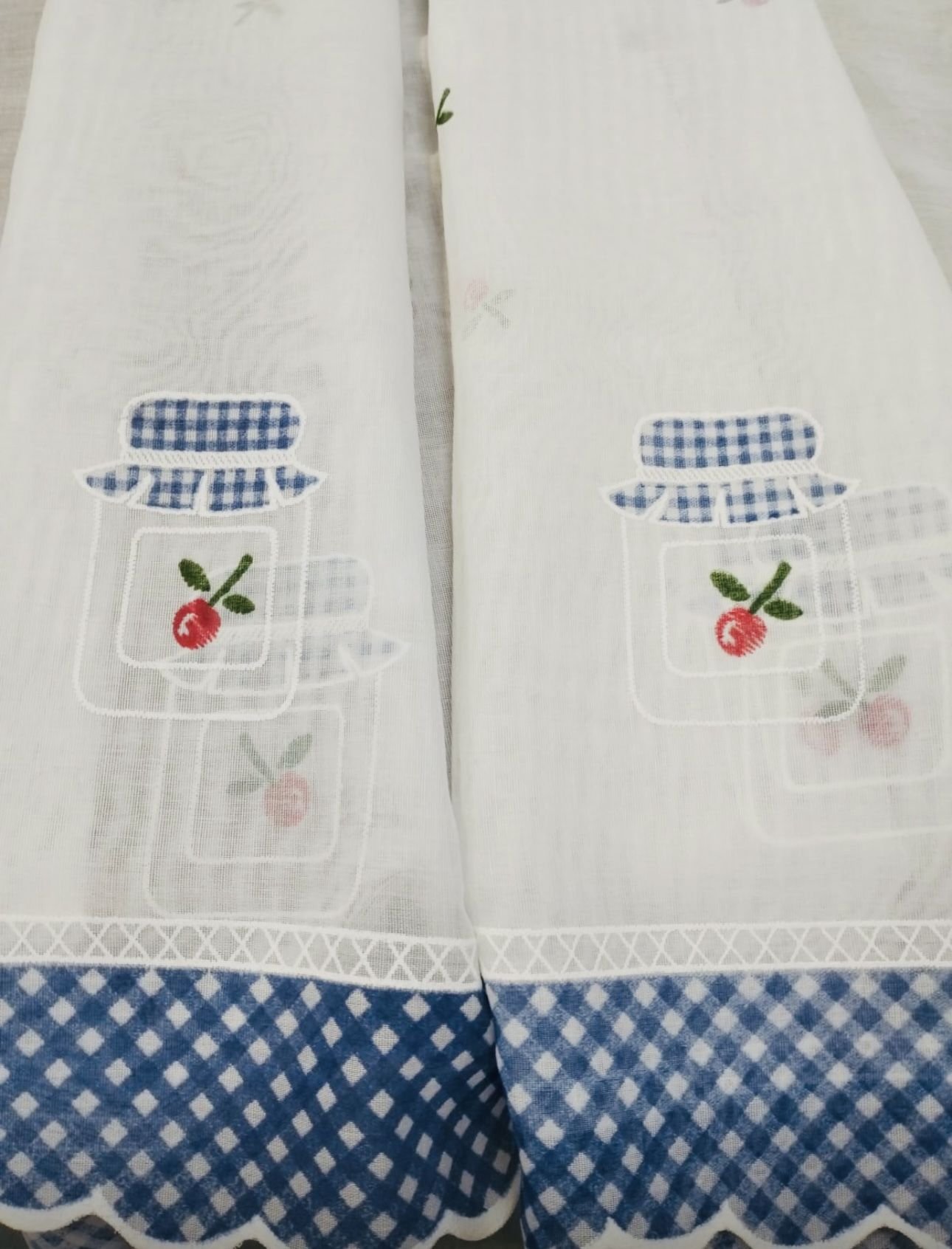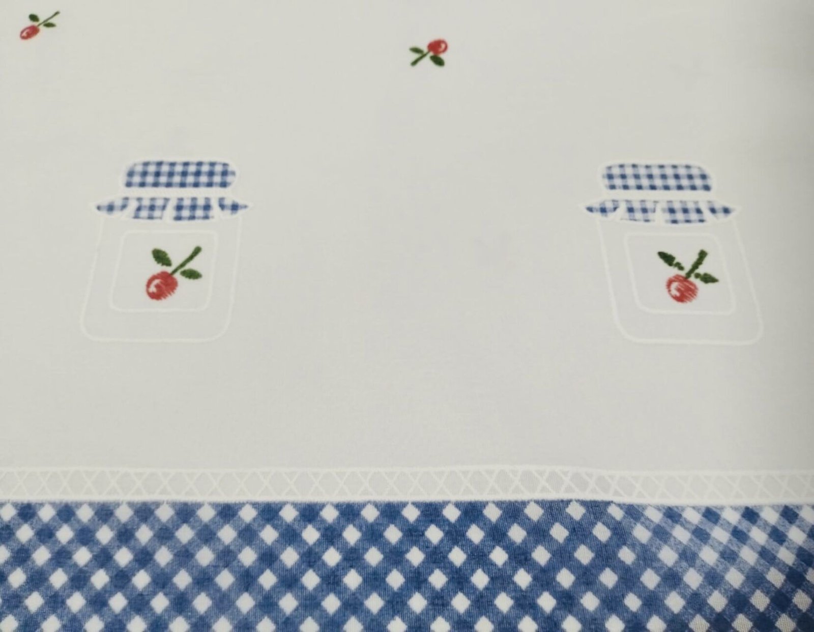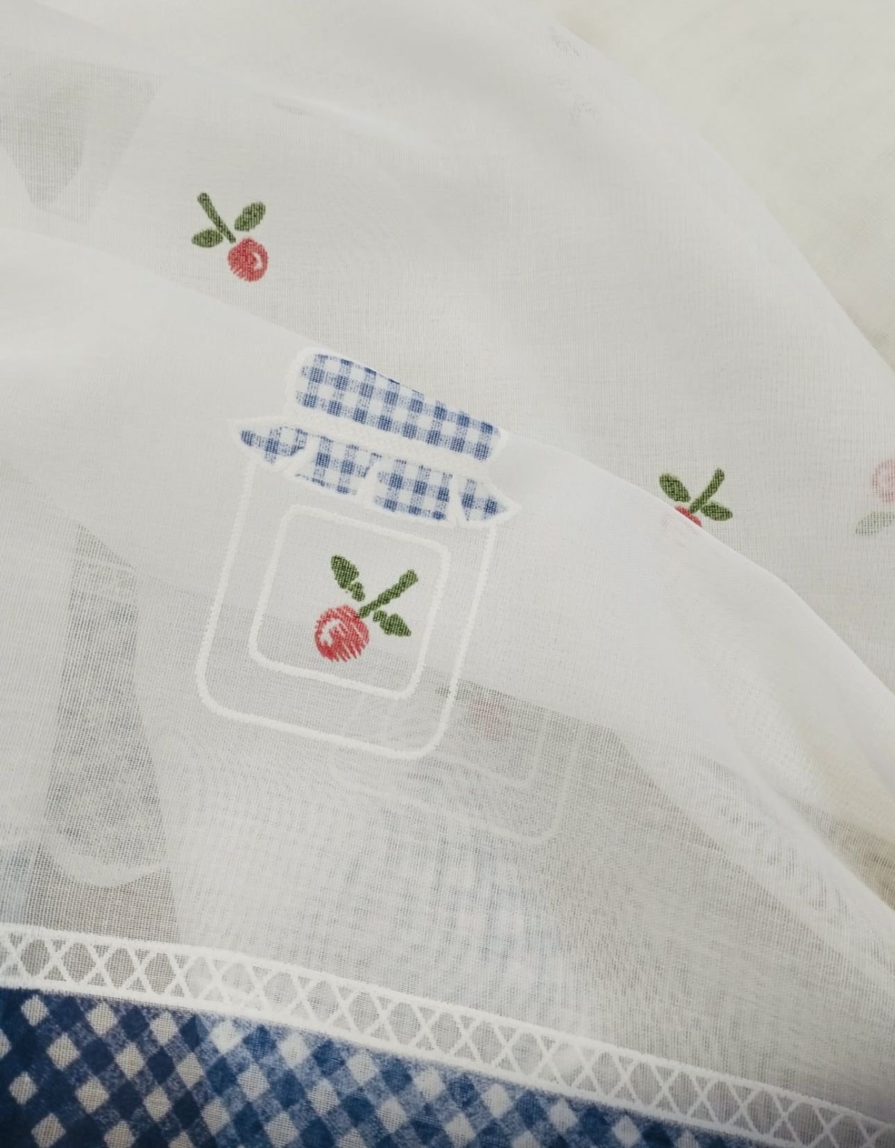 Tela de poliéster 100% con una caída y un tacto exquisito con una altura de 300cm. Con estampación arriba y abajo, ideal para aprovechar el tejido, dando opción a dos ventanas cortas o volante y puerta. Bajo con cuadros de Vichy azules.