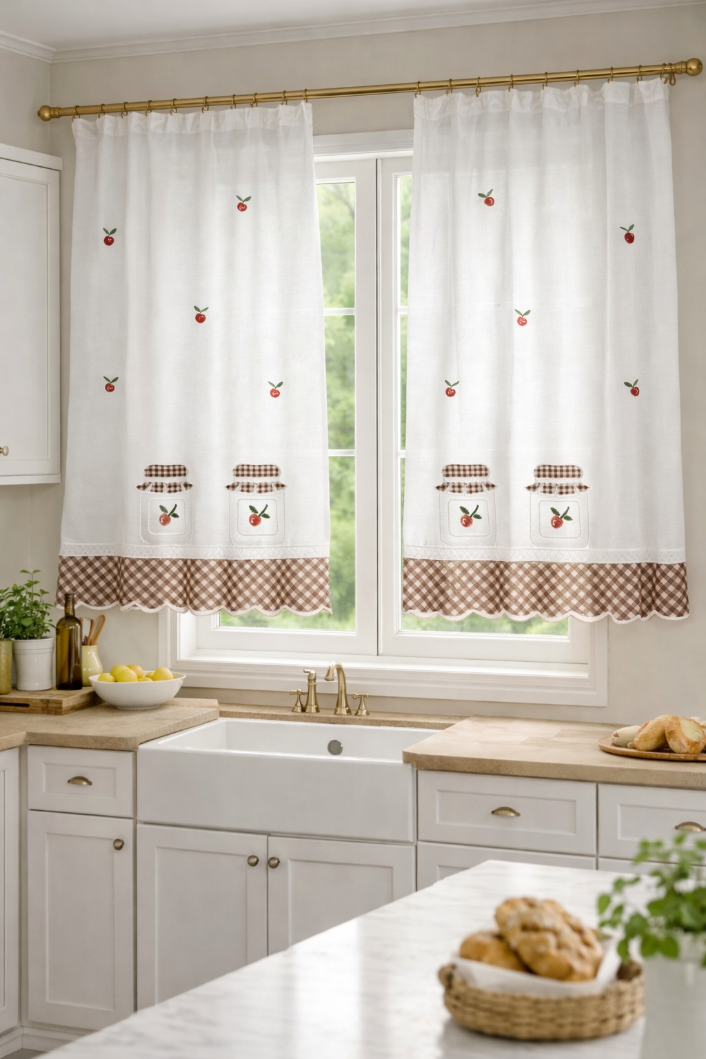 Tela de poliéster 100% con una caída y un tacto exquisito con una altura de 300cm. Con estampación arriba y abajo, ideal para aprovechar el tejido, dando opción a dos ventanas cortas o volante y puerta. Bajo con cuadros de Vichy marrón.