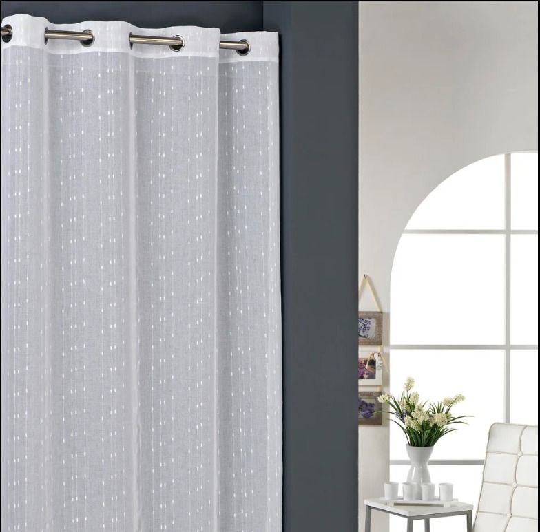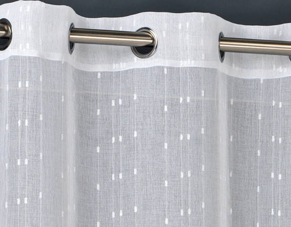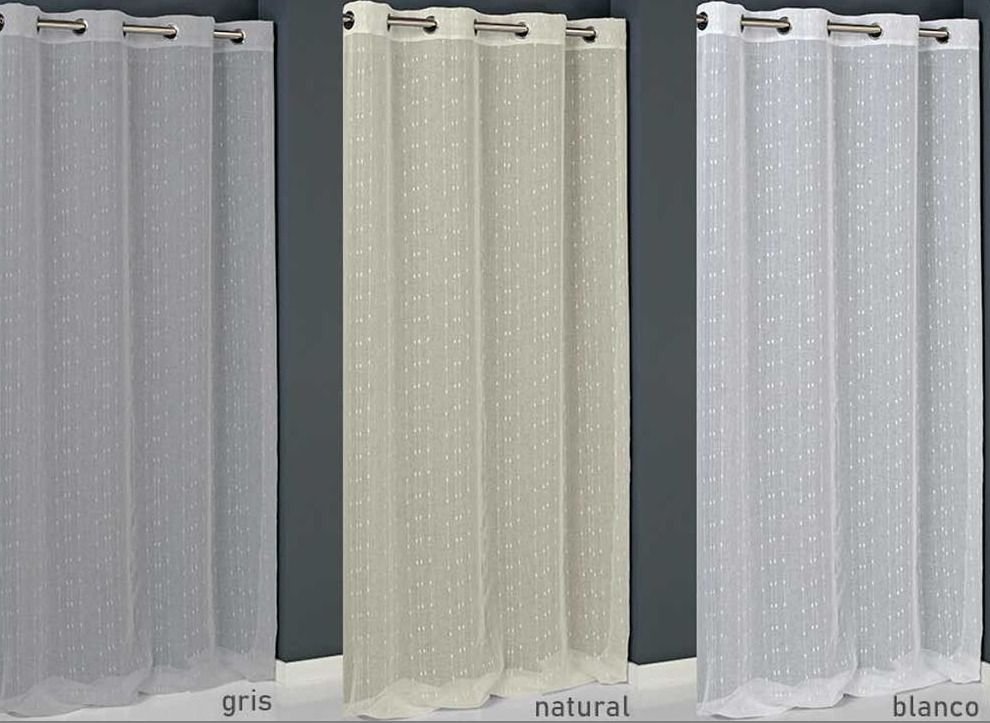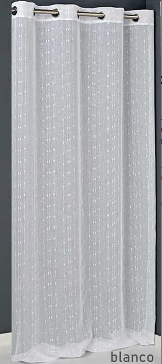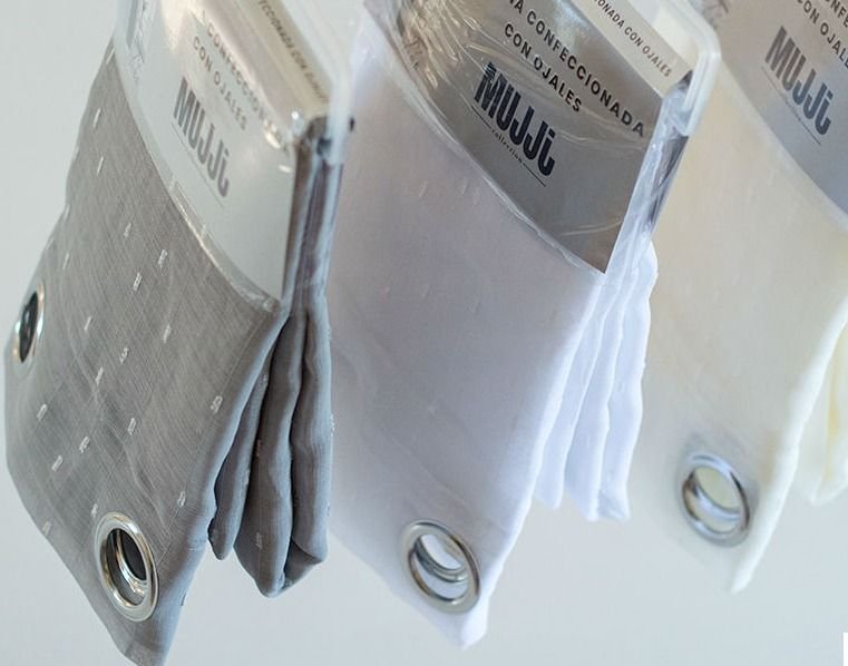 Cortina confeccionada modelo Alba en blanco, de la marca Mujji. Con diseño muy moderno y actual. Cortina perfecta para dar un ambiente diferente al dormitorio, o al salón comedor. Con sistema de ollaos para fácil colocación. Permite el paso de la luz. Caída de la cortina elegante, con ojales metálicos para colgarla en casa con facilidad.