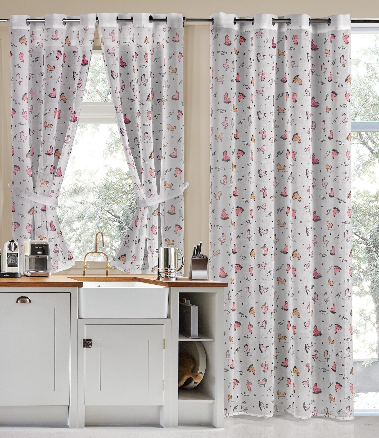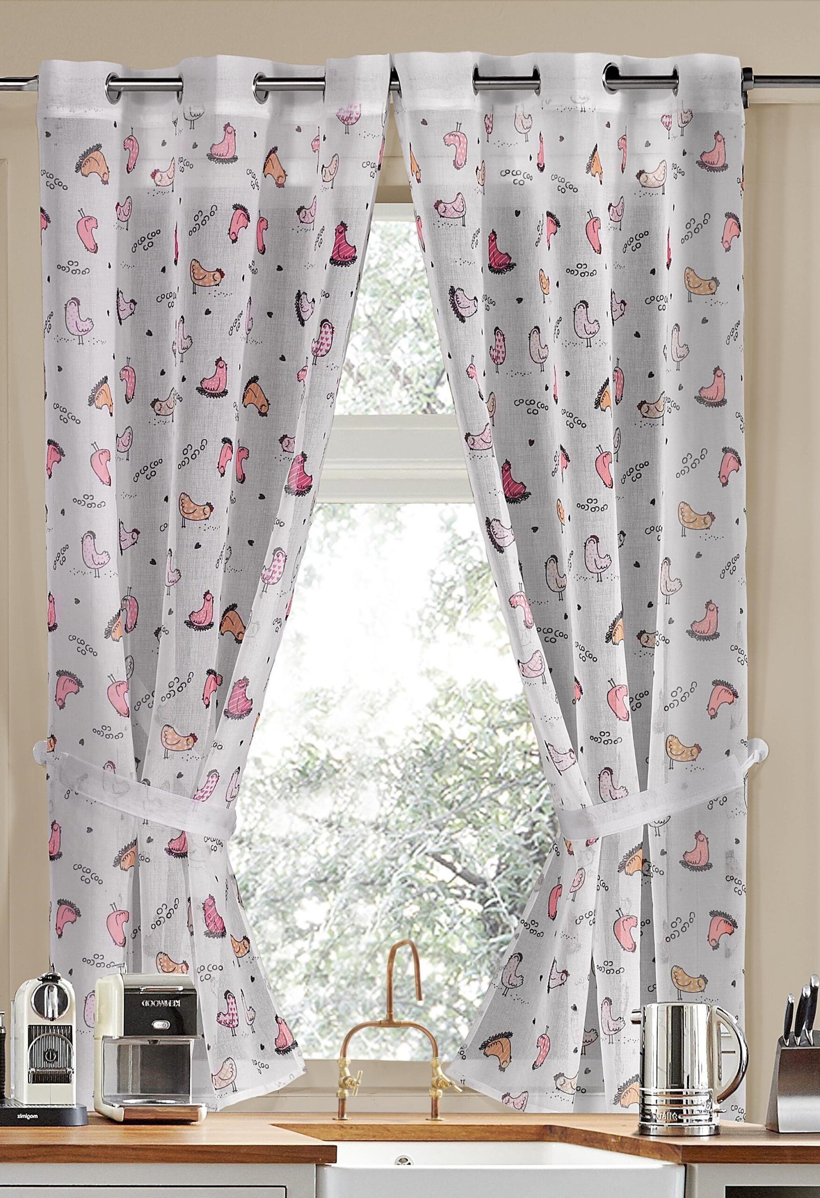 VISILLO COCINA ESTAMPADO «GALLINAS» CON OLLAOS PARA VENTANA