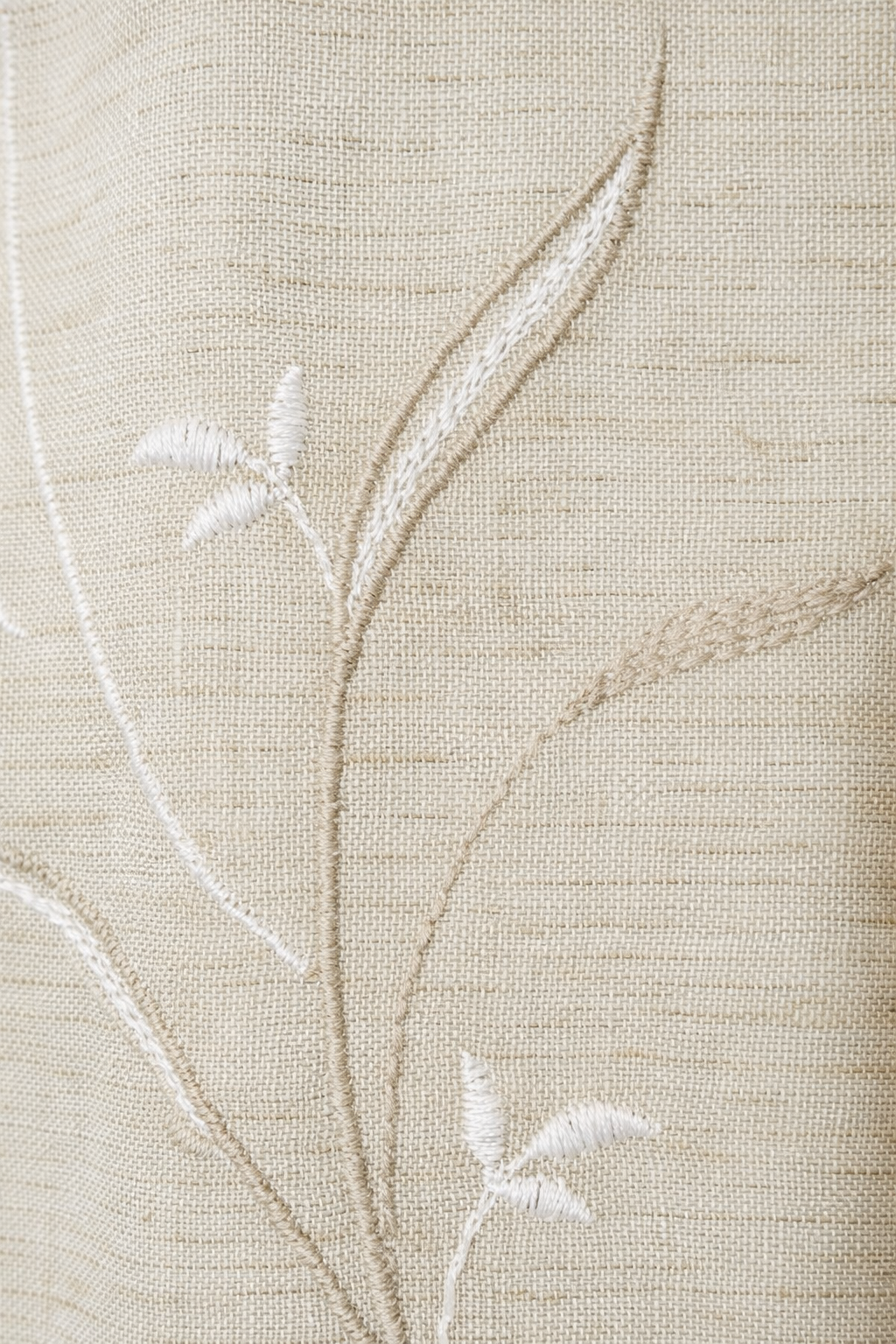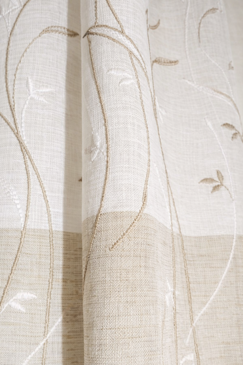 Tela de visillo a metros modelo Lugo con flores bordadas en tonos naturales  y tostados. Tela de poliéster 100% con una caída y un tacto exquisito con una altura de 300cm. Es una tela de visillo translúcida con buena caída para confección de cortinas. No encoje y puedes lavarla a máquina a 30º con un centrifugado suave. La tela ya viene acabada en uno de los orillos del ancho con un cordón de plomo, que sirve de peso, listo para utilizar como final del bajo de tus visillos. para decoraciones de Hogar.