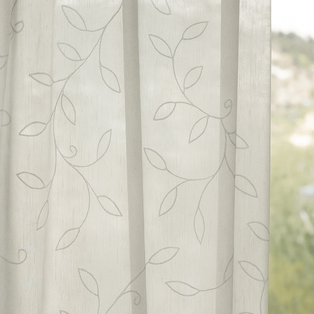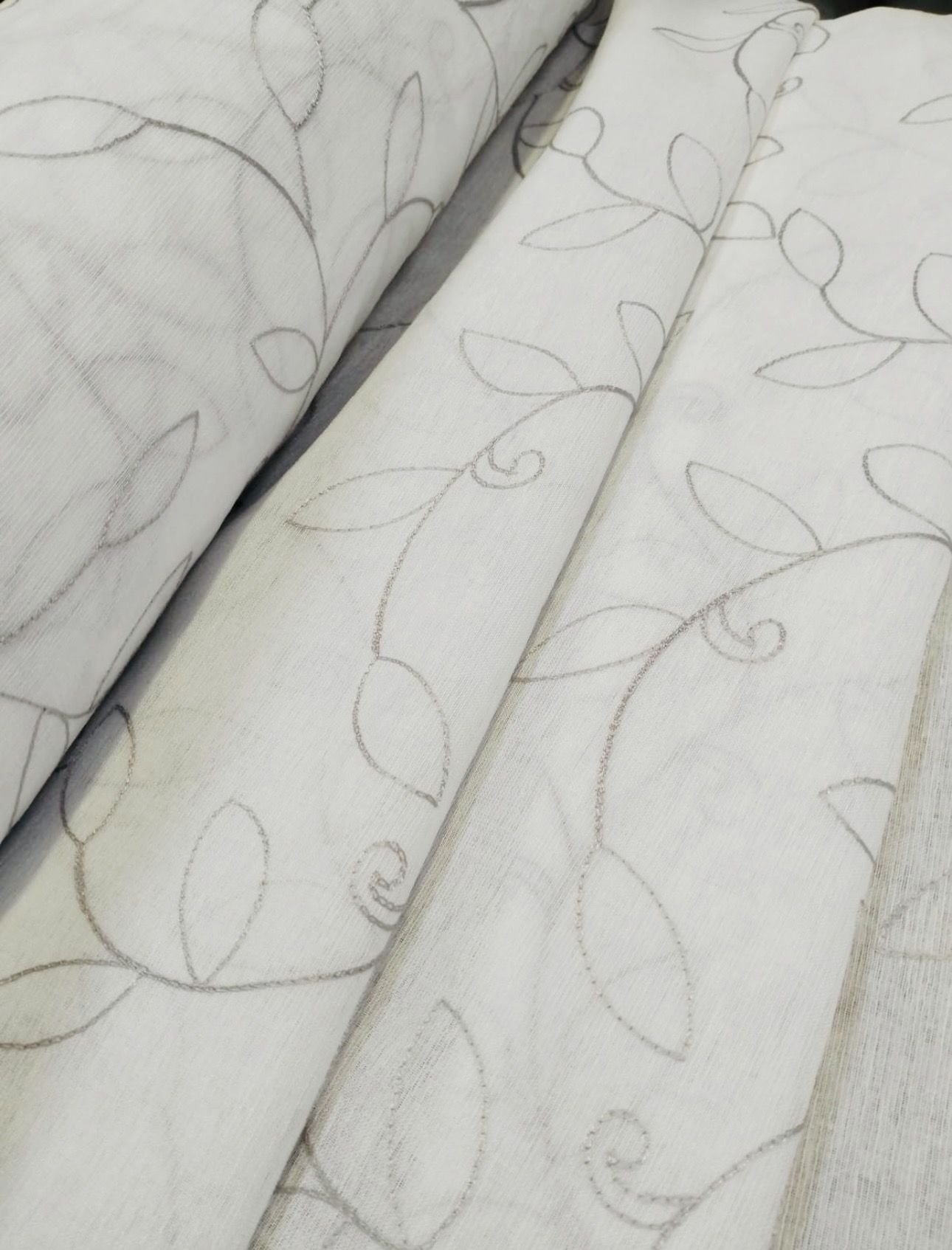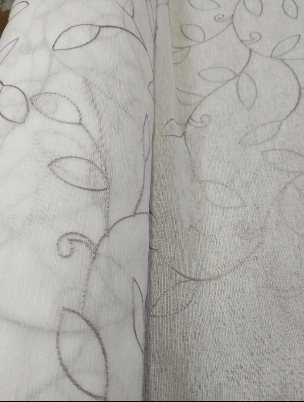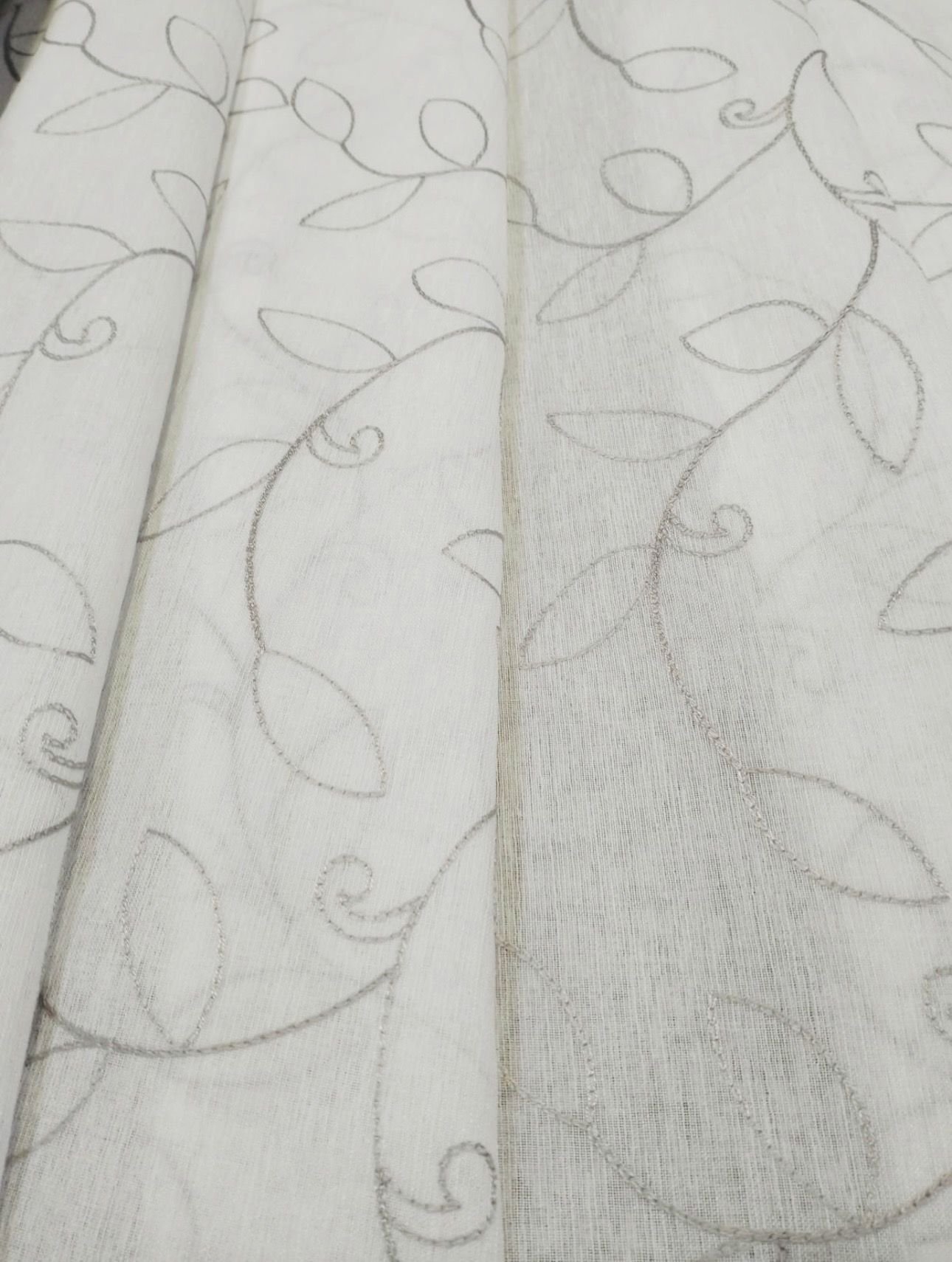 Tela de visillo a metros modelo 33K clásico en blanco natural con un estampado de hojas bordadas en gris claro. Tela de poliéster con una caída y un tacto exquisito con una altura de 280 cm. El dibujo del bordado llega hasta 230 cm aproximadamente de altura, hay unos 50 cm en la parte de arriba que va sin bordado en liso. Es una tela de visillo translúcida con buena caída para confección de cortinas. No encoje y puedes lavarla a máquina a 30º con un centrifugado suave. La tela ya viene acabada en uno de los orillos del ancho con un cordón de plomo, que sirve de peso, listo para utilizar como final del bajo de tus visillos, para decoraciones de hogar.