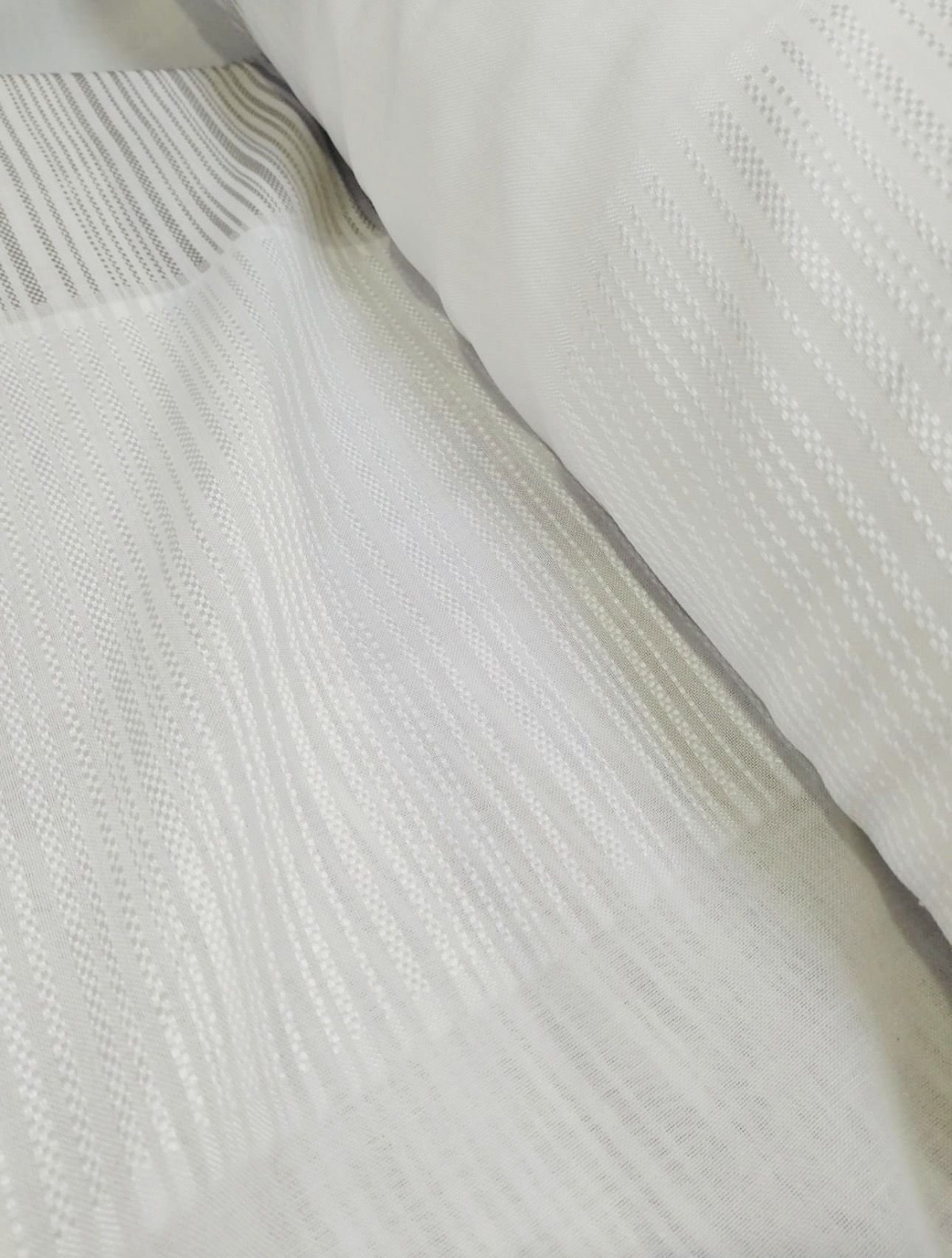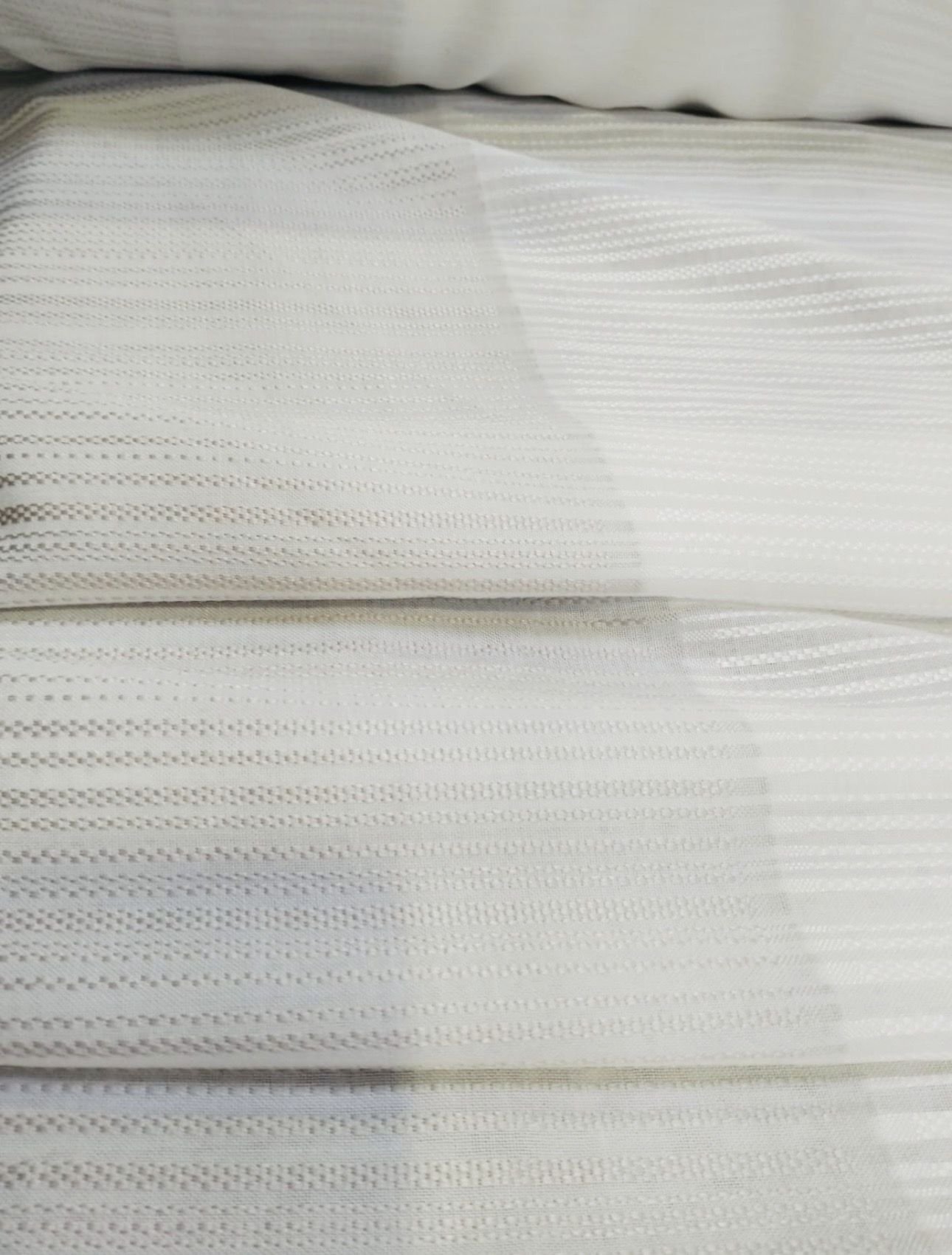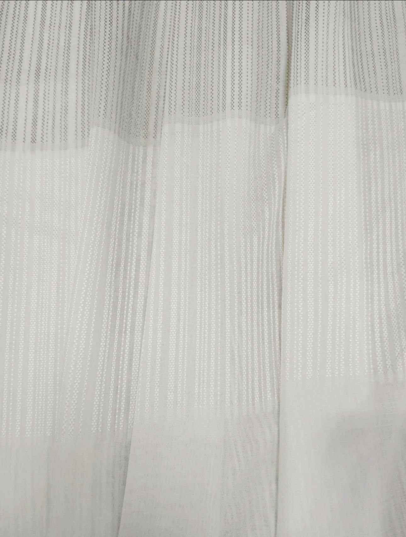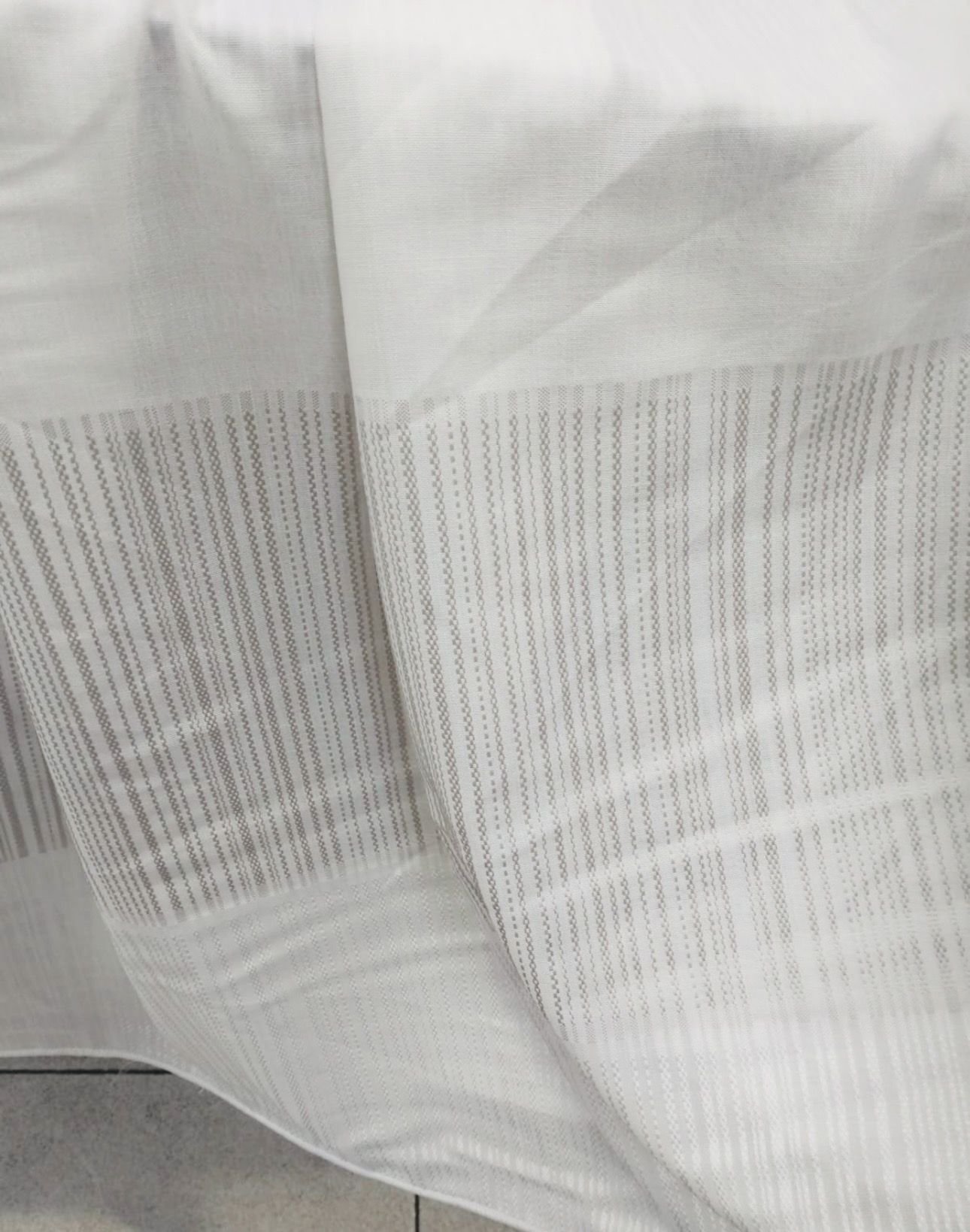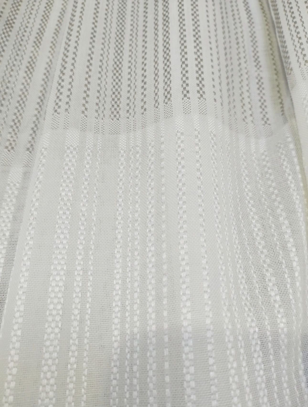 Tela de visillo a metros modelo 4436 c/24 natural clásico con un estampado liso en tono blanco natural con un dibujo de cenefas en horizontal de unos 55 cm muy fino en tonos blancos y gris claro muy elegantes. Tela de poliéster con una caída y un tacto exquisito con una altura de 300 cm. Es una tela de visillo translúcida con buena caída para confección de cortinas. No encoje y puedes lavarla a máquina a 30º con un centrifugado suave. La tela ya viene acabada en uno de los orillos del ancho con un cordón de plomo, que sirve de peso, listo para utilizar como final del bajo de tus visillos, para decoraciones de hogar.