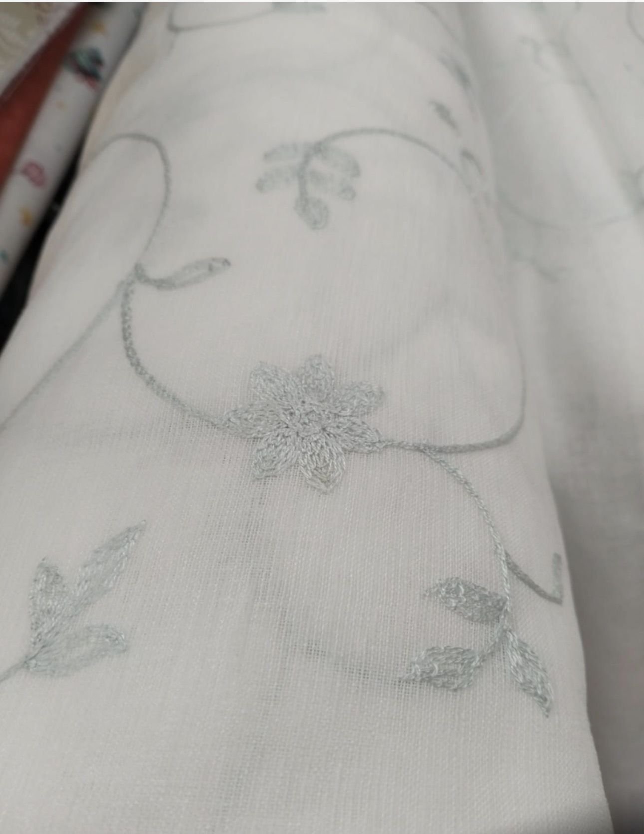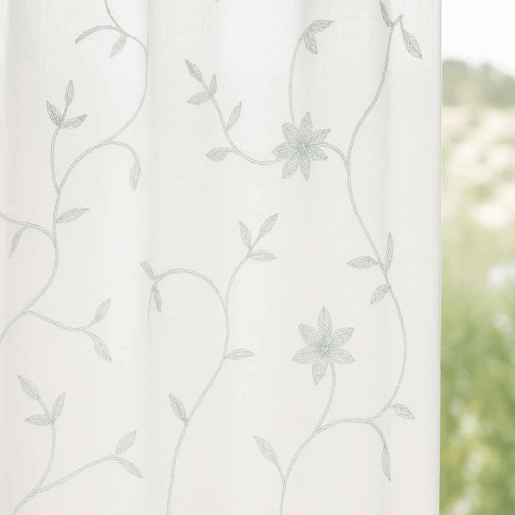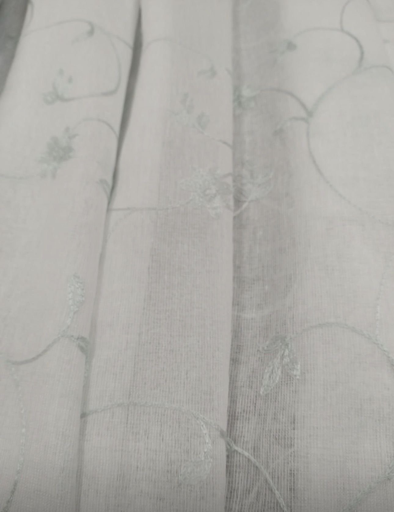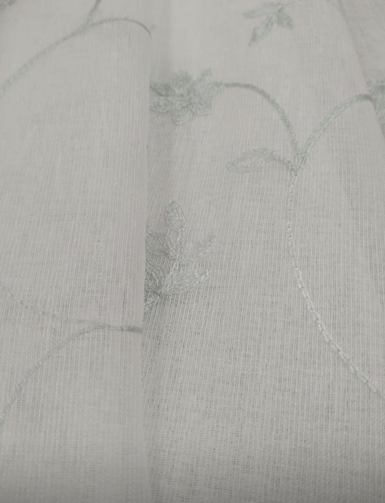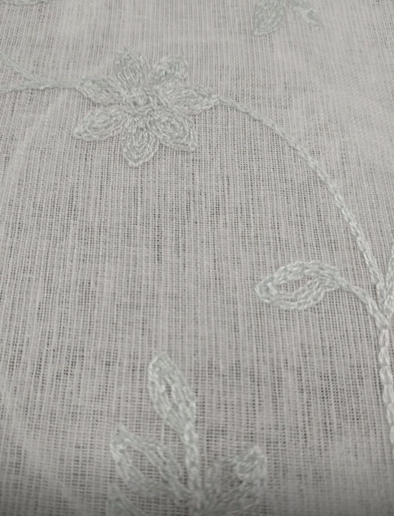 Tela de visillo a metros modelo 58 clásico en blanco natural con un estampado de hojas bordadas en verde agua claro. Tela de poliéster con una caída y un tacto exquisito con una altura de 280 cm. El dibujo del bordado llega hasta 230 cm aproximadamente de altura, hay unos 50 cm en la parte de arriba que va sin bordado en liso. Es una tela de visillo translúcida con buena caída para confección de cortinas. No encoje y puedes lavarla a máquina a 30º con un centrifugado suave. La tela ya viene acabada en uno de los orillos del ancho con un cordón de plomo, que sirve de peso, listo para utilizar como final del bajo de tus visillos, para decoraciones de hogar.