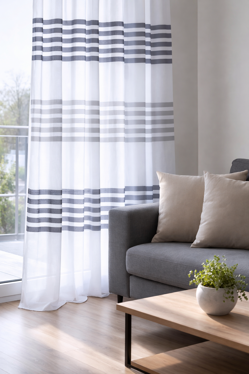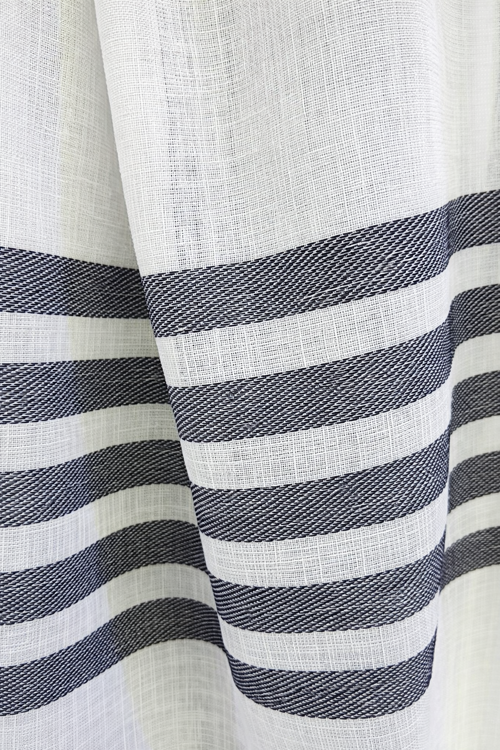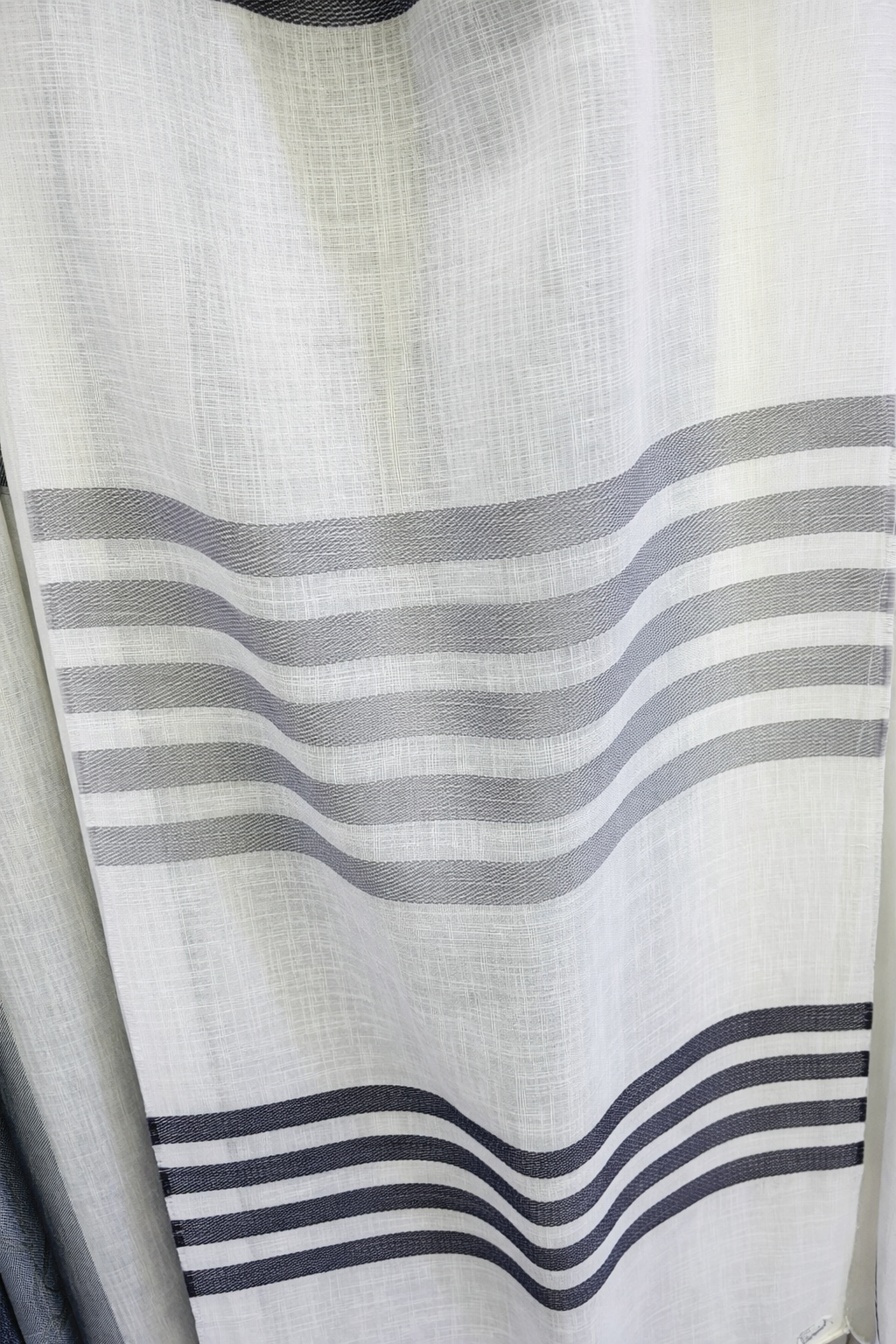 Tela de visillo a metros modelo 6268 clásico con un estampado con cenefa en tonos grises, posición separada de las cenefas a 40 cm. Tela de poliéster con una caída y un tacto exquisito con una altura de 280 cm. Es una tela de visillo translúcida con buena caída para confección de cortinas. No encoje y puedes lavarla a máquina a 30º con un centrifugado suave. La tela ya viene acabada en uno de los orillos del ancho con un cordón de plomo, que sirve de peso, listo para utilizar como final del bajo de tus visillos, para decoraciones de hogar.