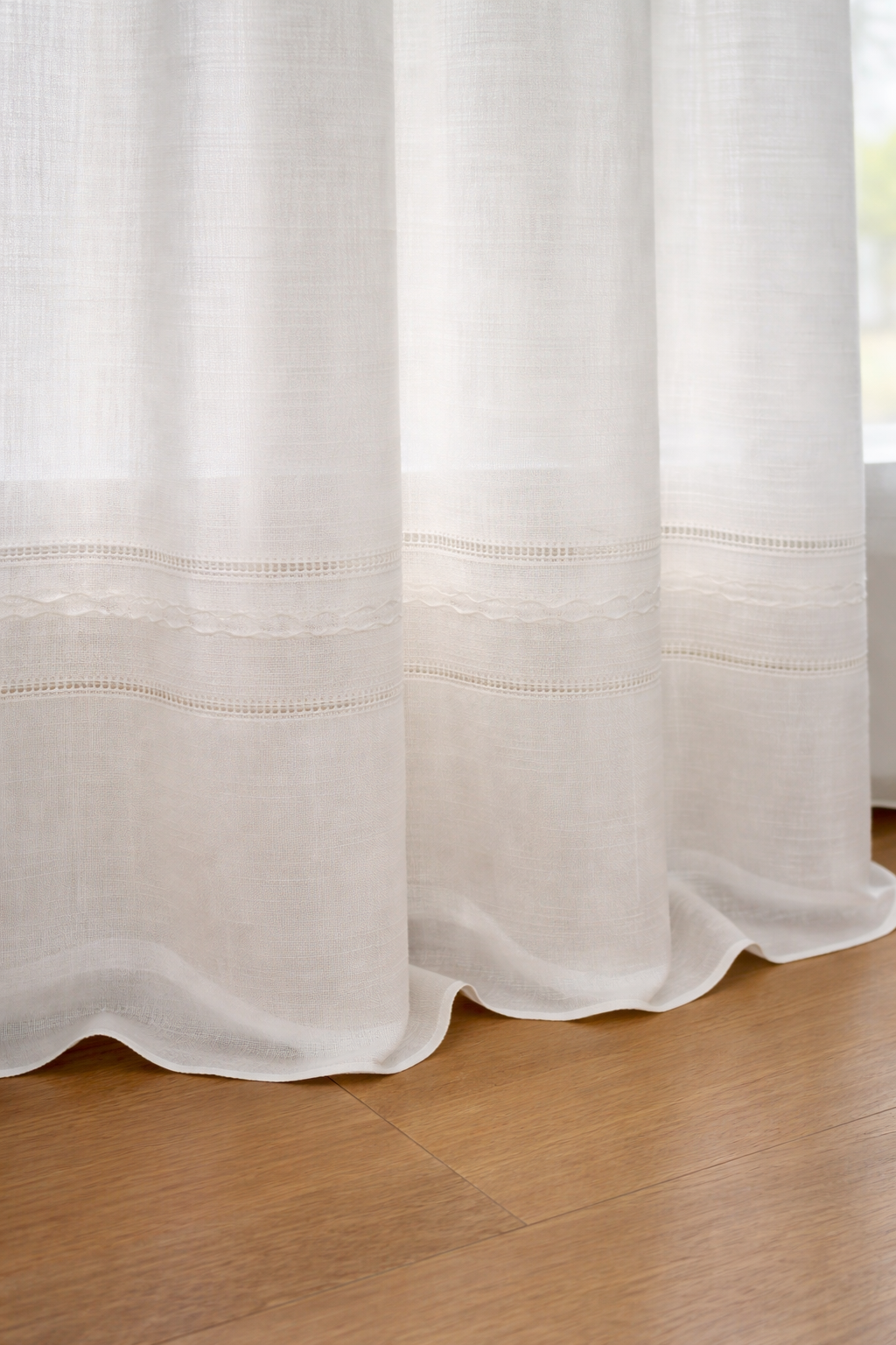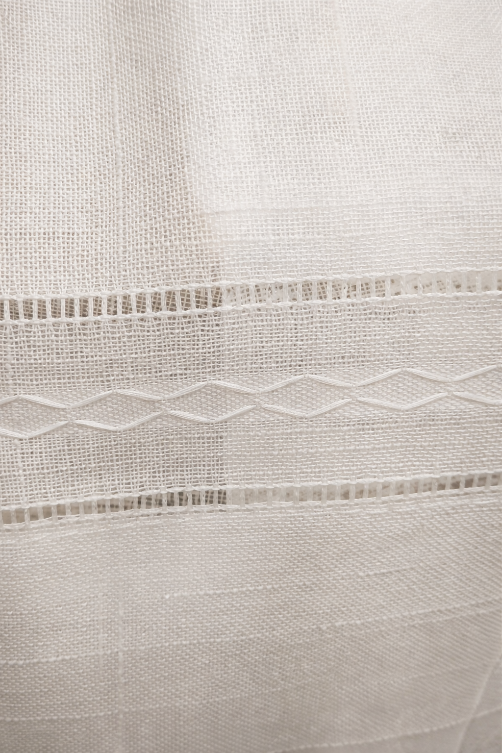 Tela de visillo a metros modelo Angela es una propuesta elegante y contemporánea que aporta luz, textura y sofisticación a cualquier estancia. El diseño destaca por una greca central bordada en relieve con motivo geométrico, enmarcada por dos delicadas vainicas que aportan un acabado artesanal y refinado.