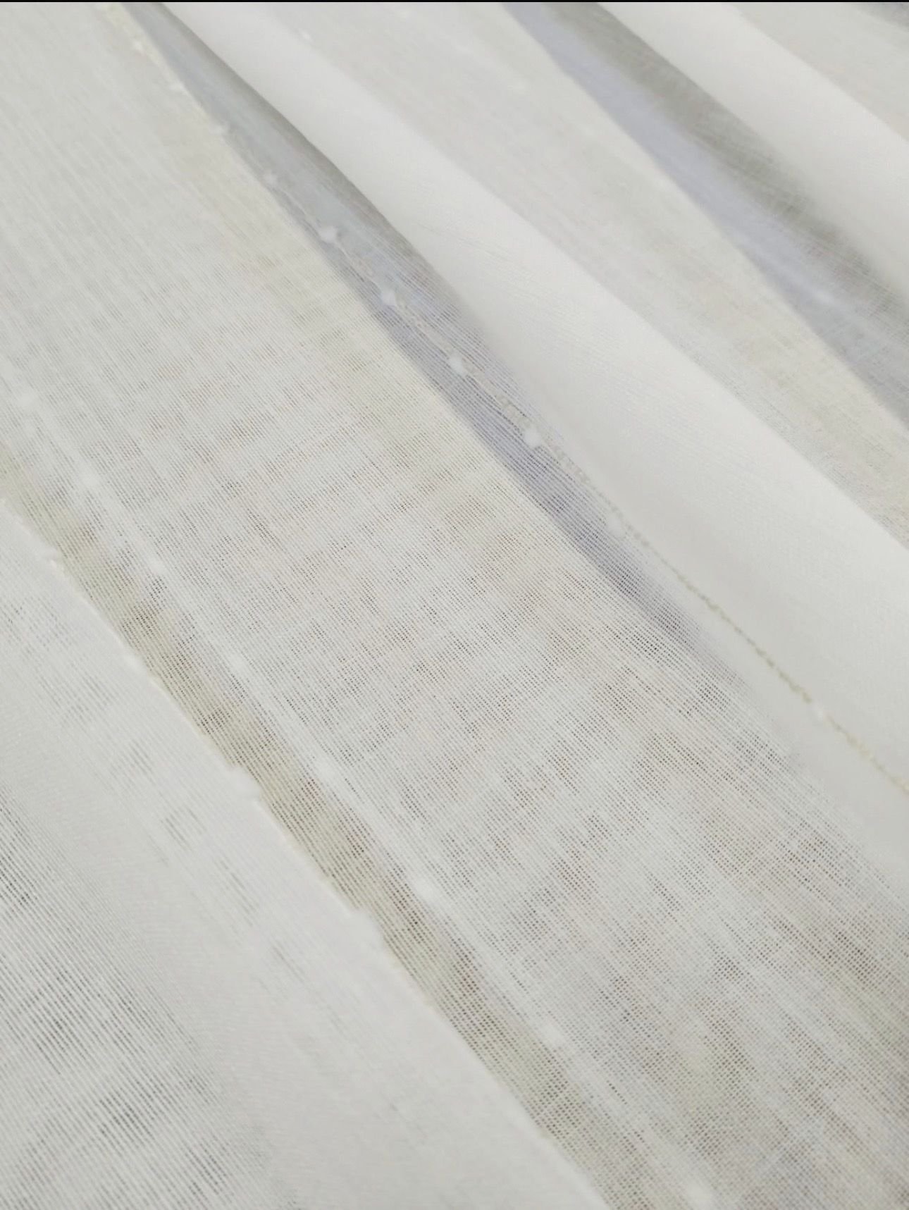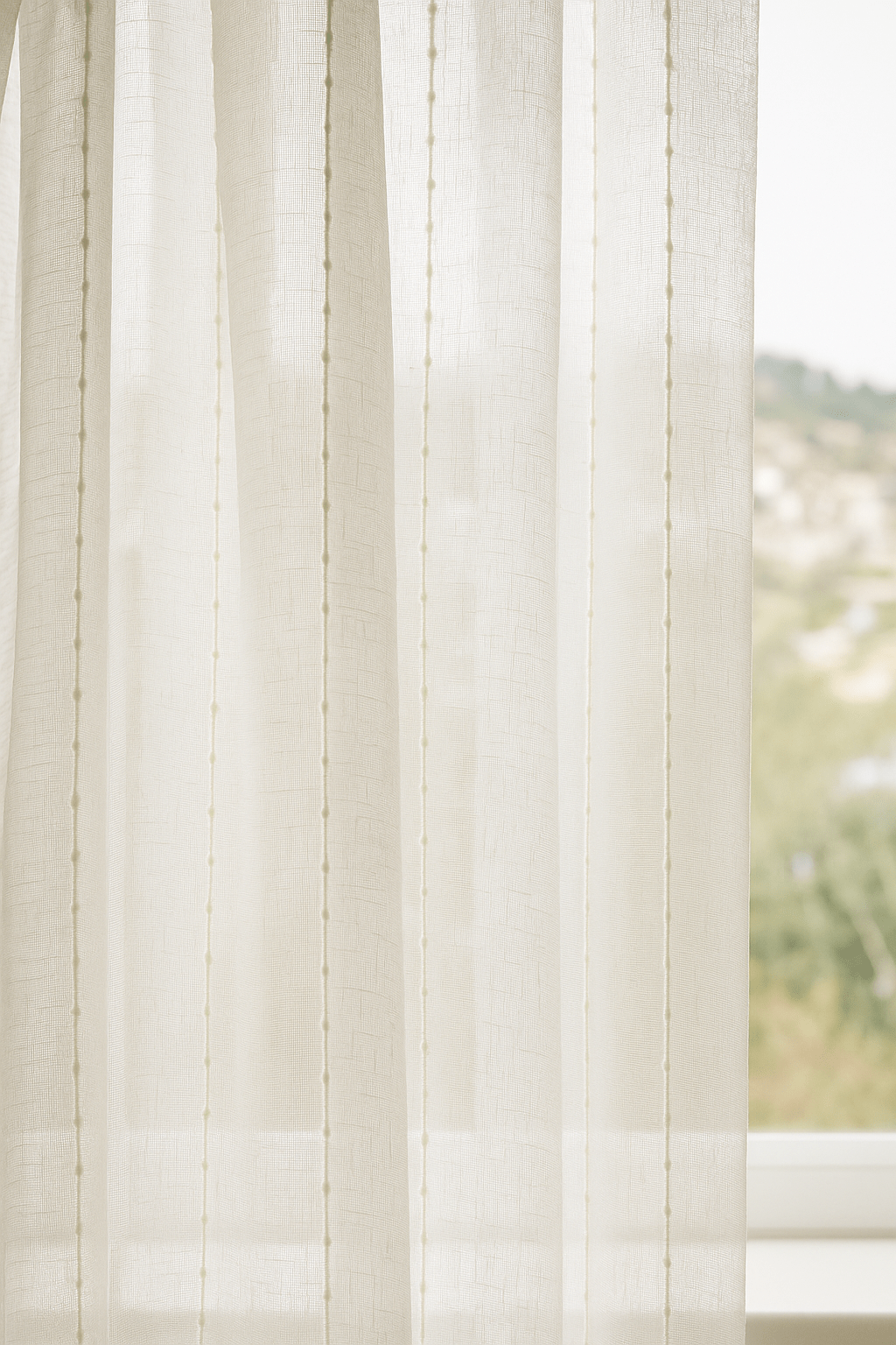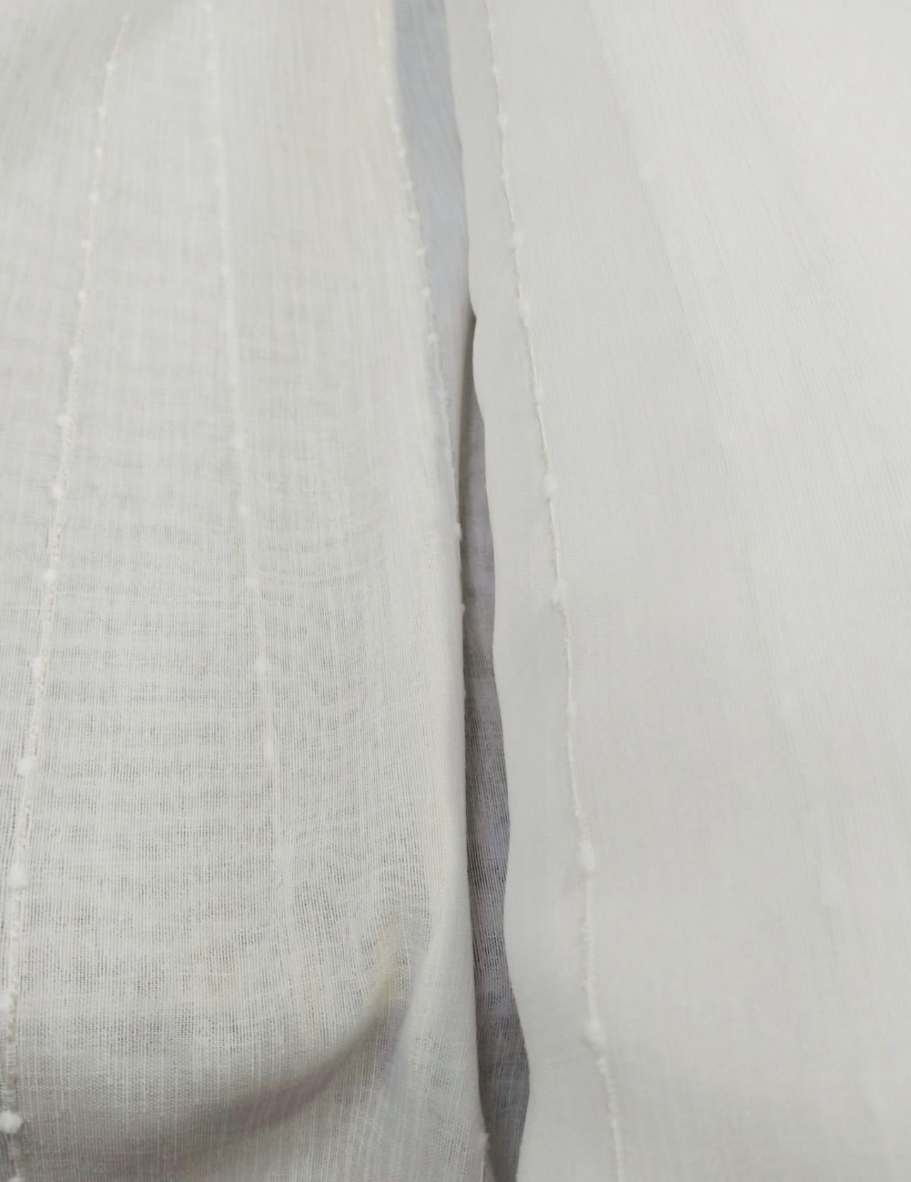 Tela de visillo a metros modelo Bueu fantasía clásico con un estampado liso con rayas y plumeti en tono blanco natural. Tela de poliéster con una caída y un tacto exquisito con una altura de 320 cm. Es una tela de visillo translúcida con buena caída para confección de cortinas. No encoje y puedes lavarla a máquina a 30º con un centrifugado suave. La tela ya viene acabada en uno de los orillos del ancho con un cordón de plomo, que sirve de peso, listo para utilizar como final del bajo de tus visillos, para decoraciones de hogar.