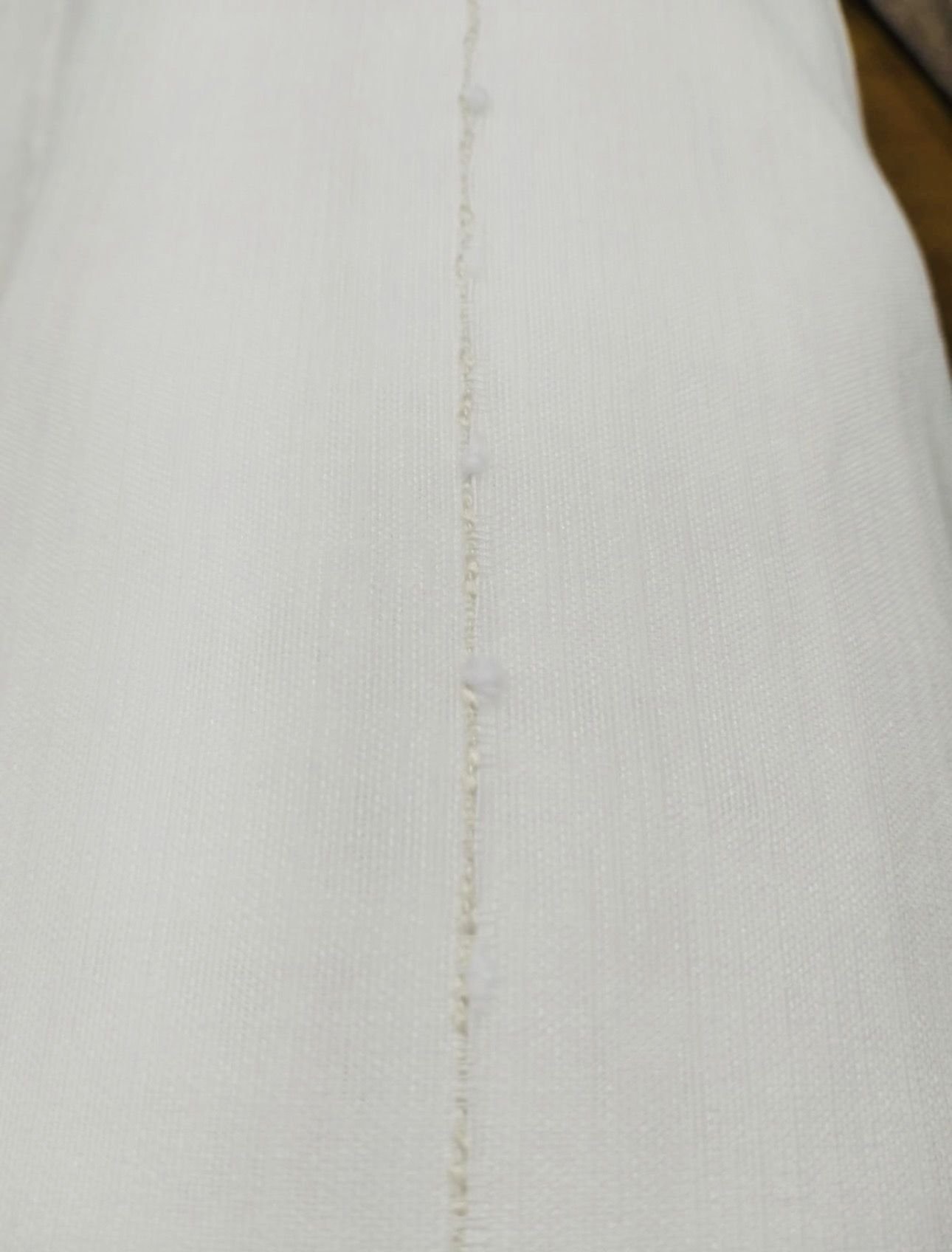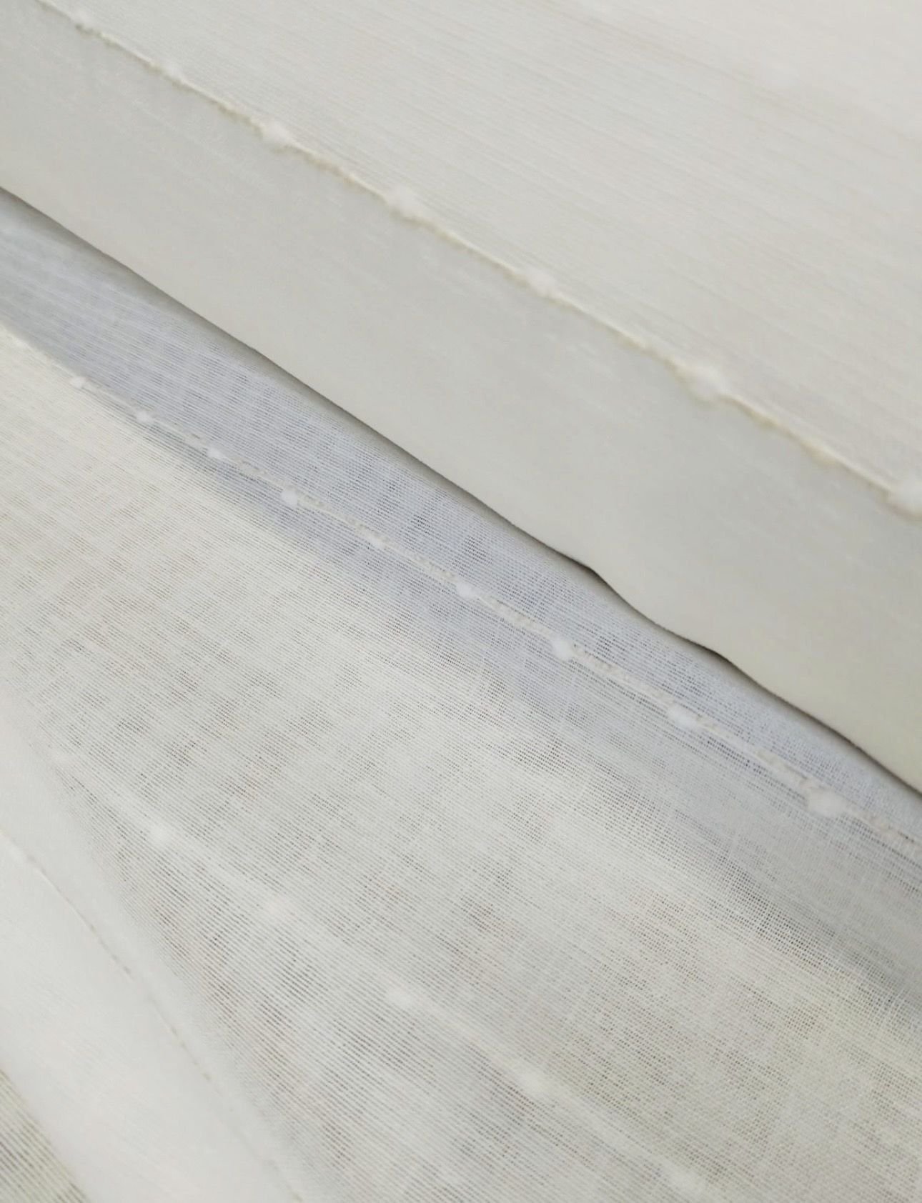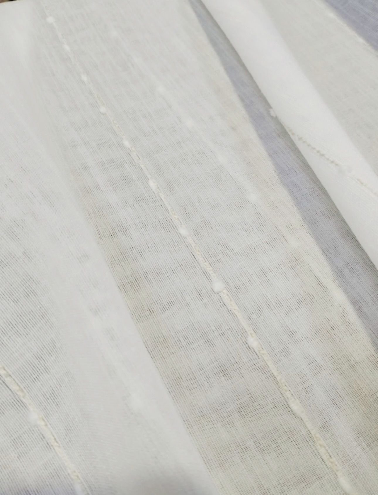 Tela de visillo a metros modelo Bueu fantasía clásico con un estampado liso con rayas y plumeti en tono blanco natural. Tela de poliéster con una caída y un tacto exquisito con una altura de 320 cm. Es una tela de visillo translúcida con buena caída para confección de cortinas. No encoje y puedes lavarla a máquina a 30º con un centrifugado suave. La tela ya viene acabada en uno de los orillos del ancho con un cordón de plomo, que sirve de peso, listo para utilizar como final del bajo de tus visillos, para decoraciones de hogar.