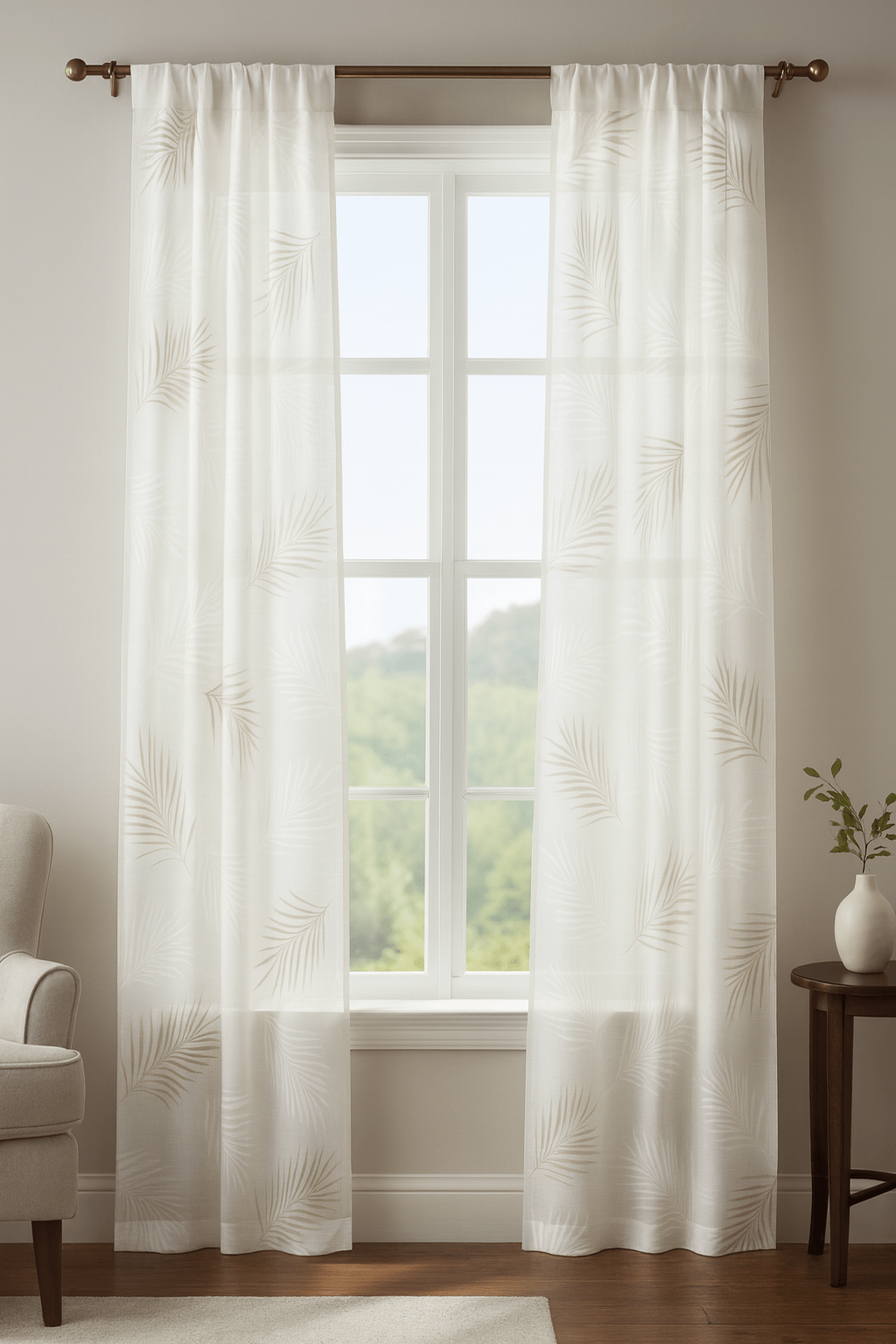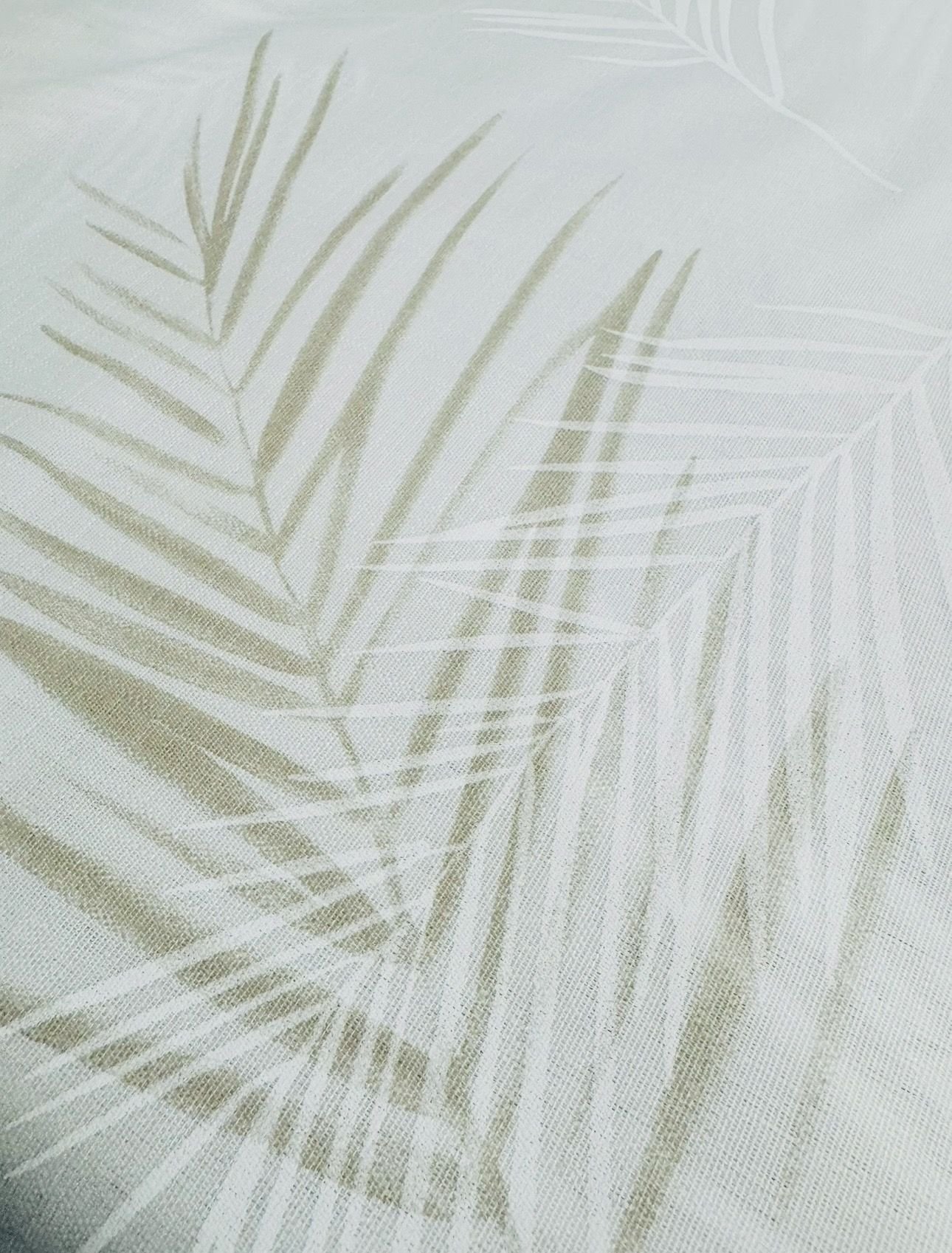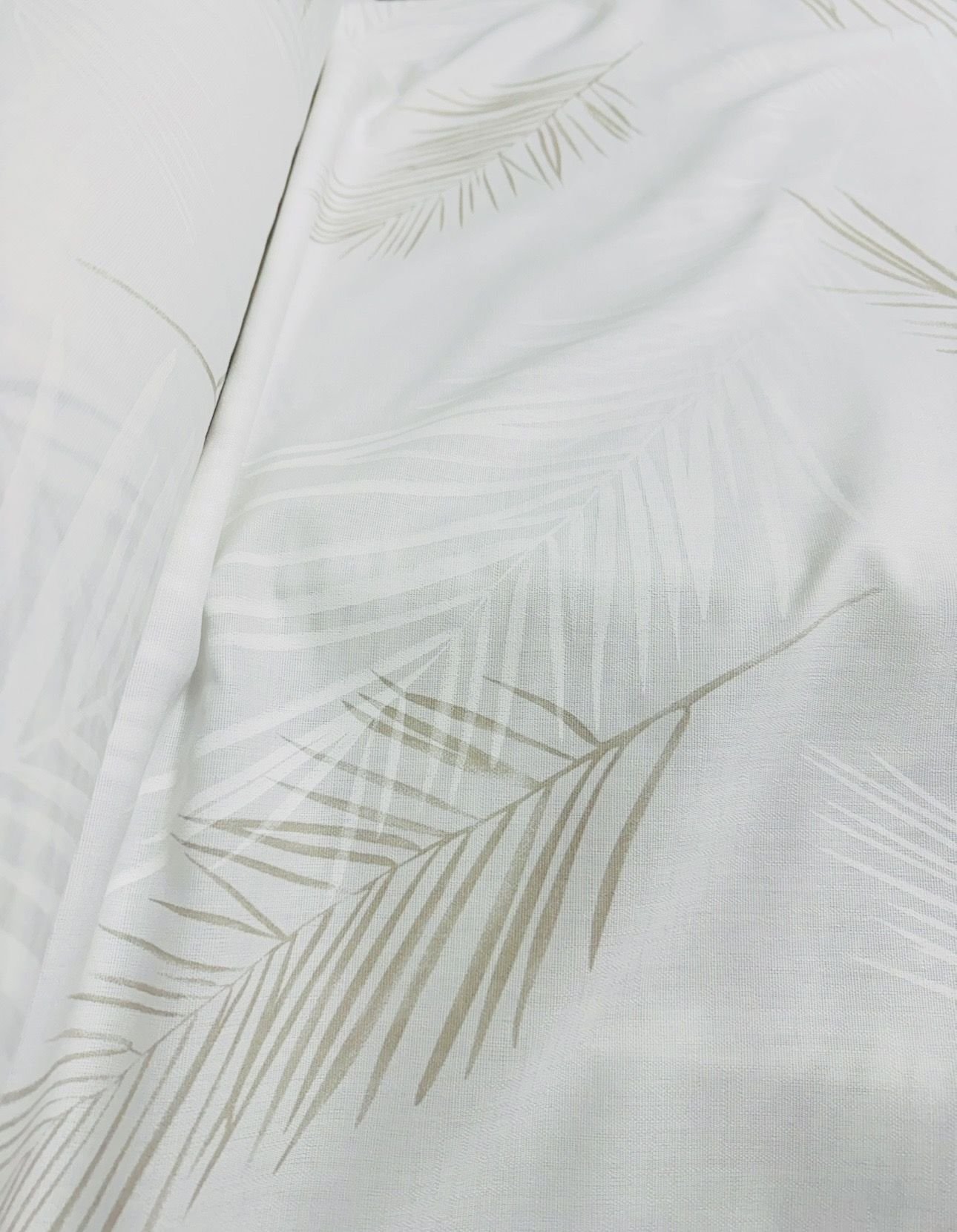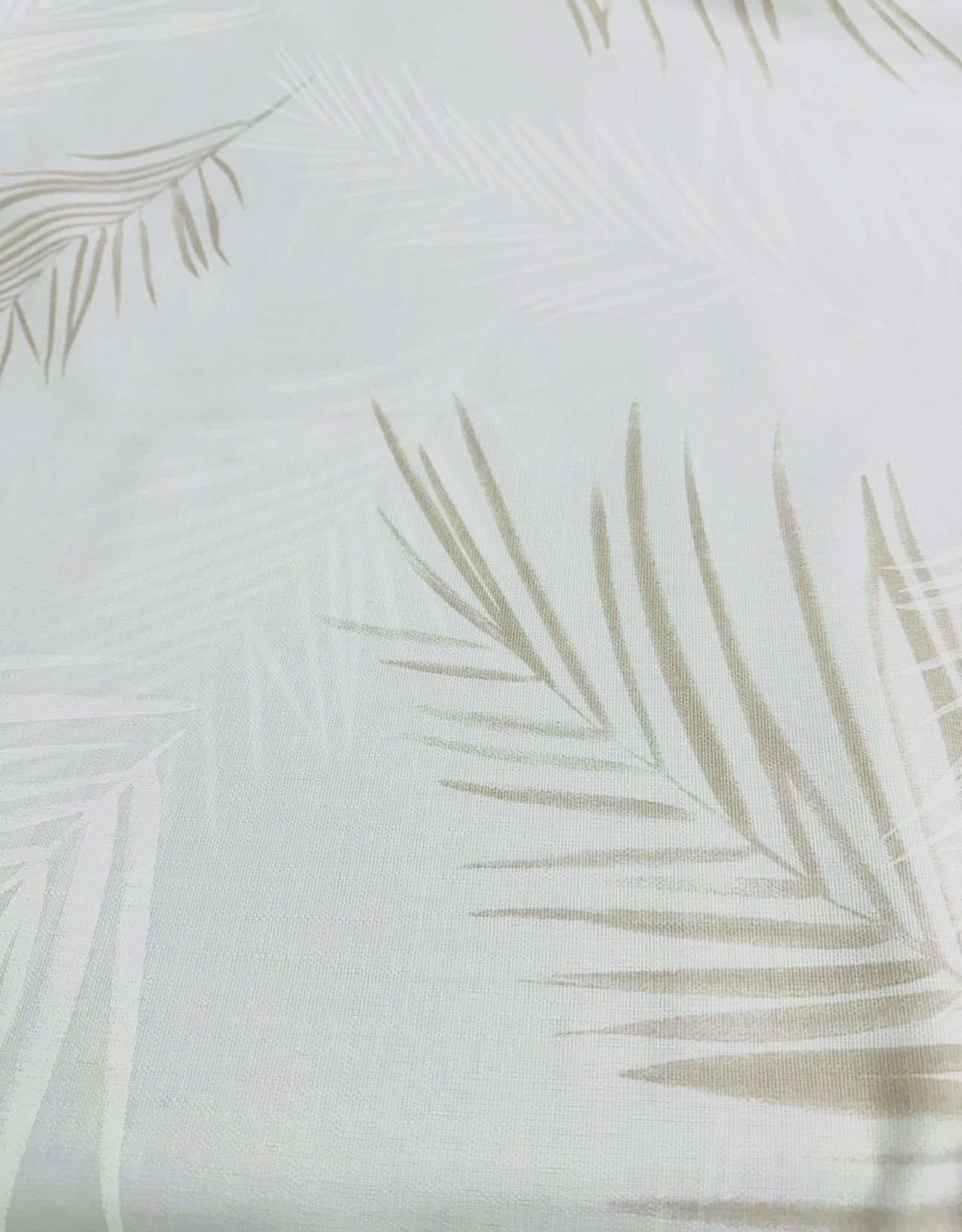 Tela de visillo a metros modelo Burgos C/4 N.º 108 natural clásico con un estampado liso en tono blanco natural con un dibujo de hojas de palmera en tonos blancos y tostados muy elegantes. Tela de poliéster con una caída y un tacto exquisito con una altura de 280 cm. Es una tela de visillo translúcida con buena caída para confección de cortinas. No encoje y puedes lavarla a máquina a 30º con un centrifugado suave. La tela ya viene acabada en uno de los orillos del ancho con un cordón de plomo, que sirve de peso, listo para utilizar como final del bajo de tus visillos, para decoraciones de hogar.