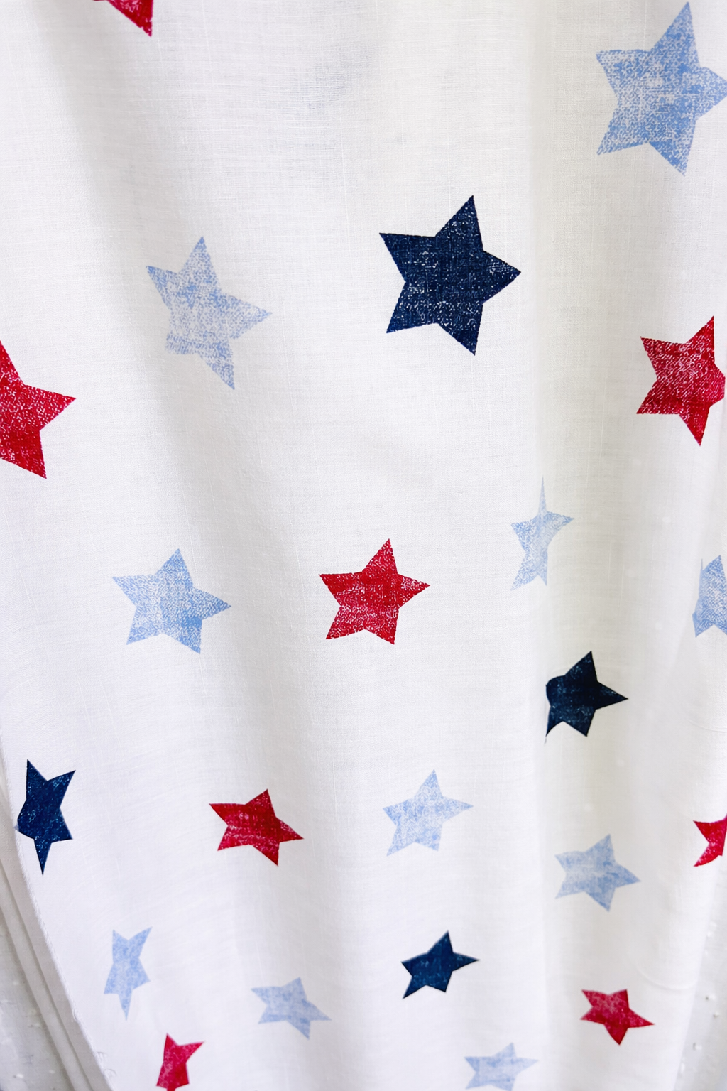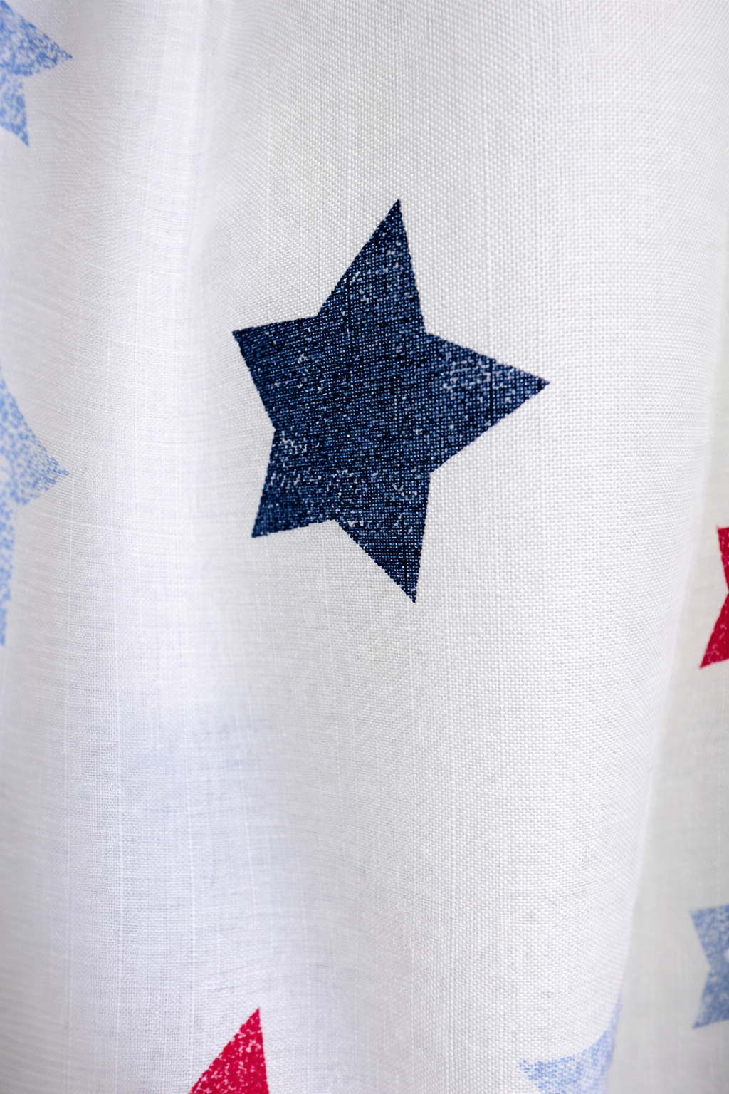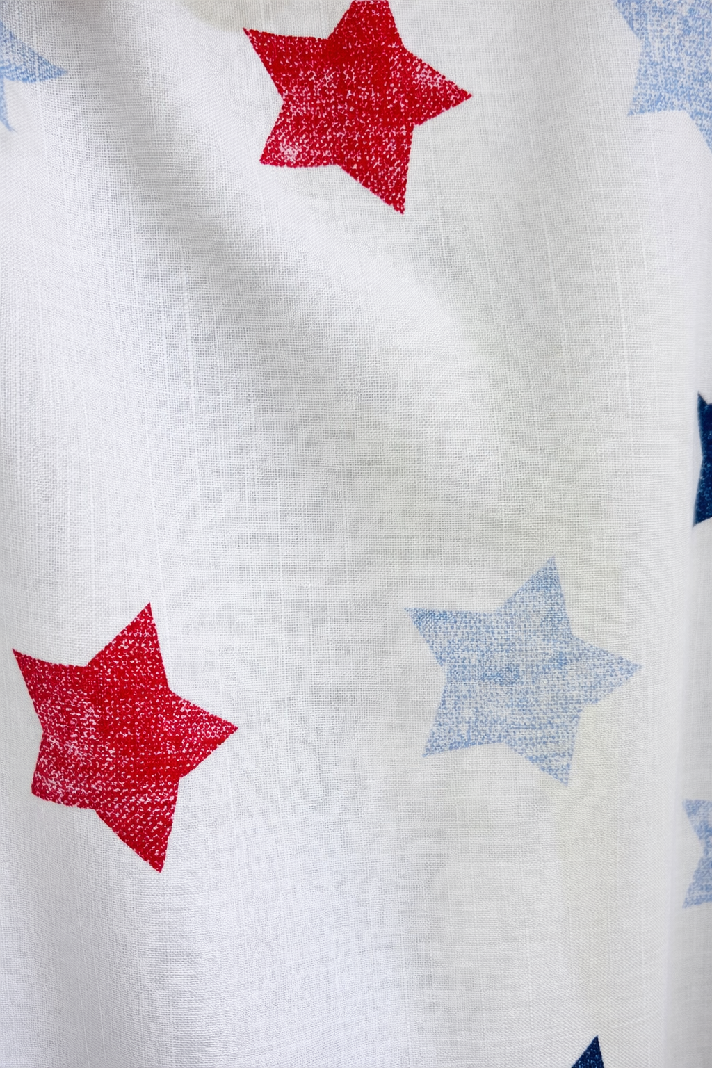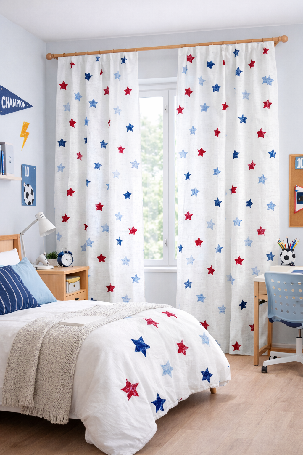 El visillo Cruz Oasis juvenil de estilo fresco y actual, confeccionado en tejido ligero tipo lino en color blanco natural. Decorado con estrellas en tono azul marino de efecto desgastado, aporta un aire moderno y desenfadado perfecto para dormitorios juveniles.. No encoje y puedes lavarla a máquina a 30º con un centrifugado suave. La tela ya viene acabada en uno de los orillos del ancho con un cordón de plomo, que sirve de peso, listo para utilizar como final del bajo de tus visillos, para decoraciones de hogar.