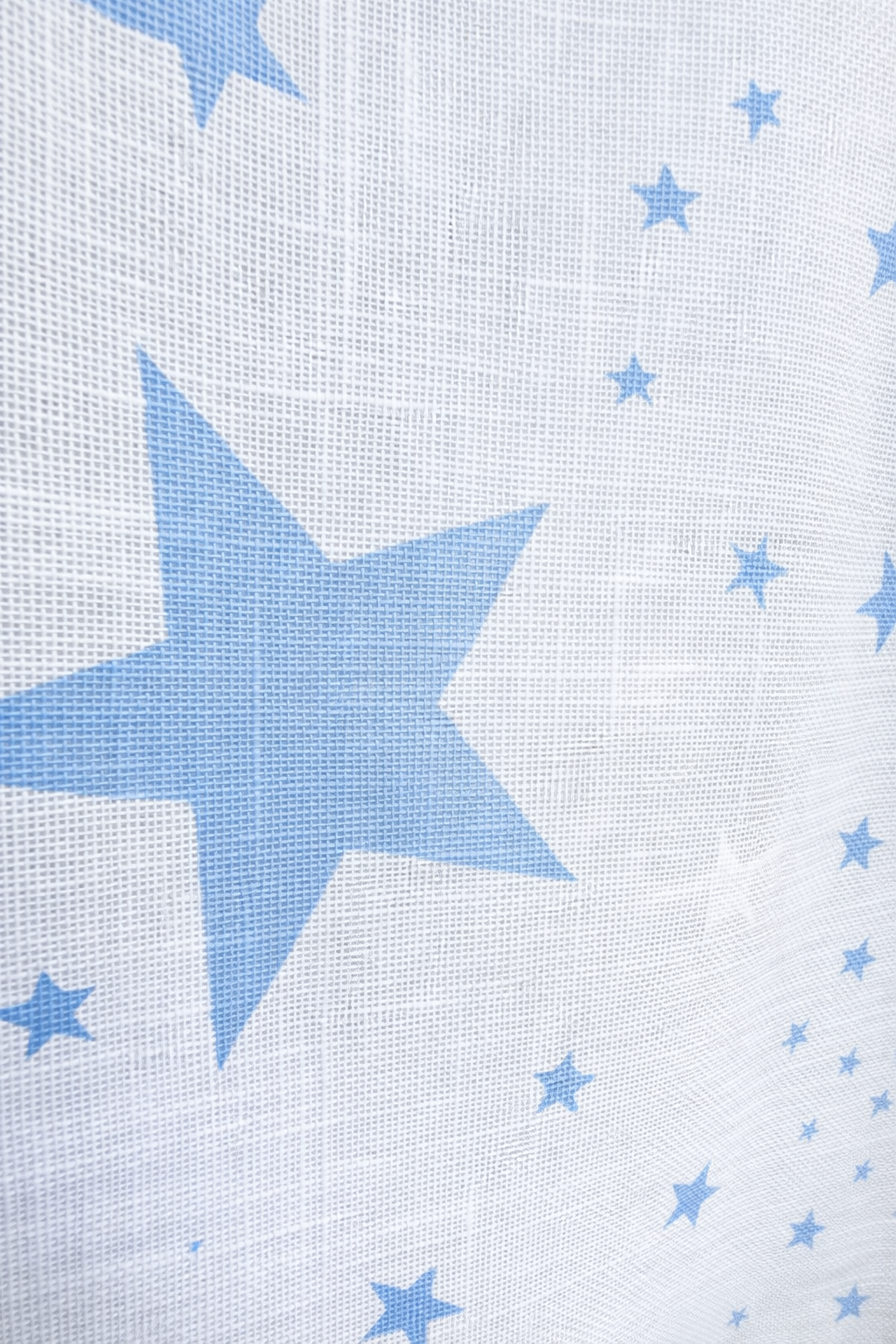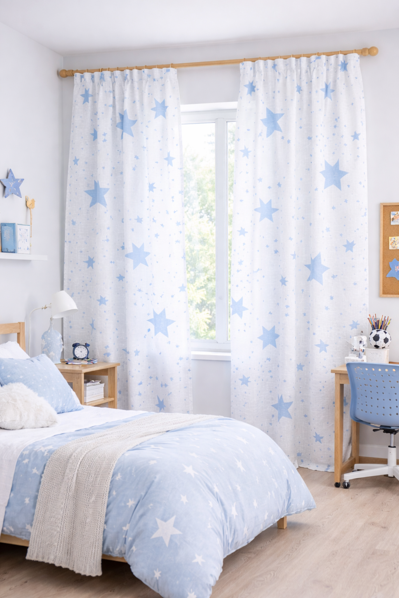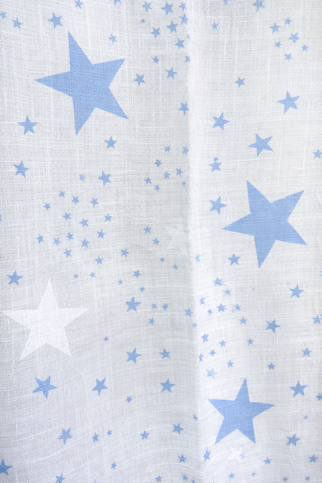 El visillo Galaxia Azul juvenil de estilo fresco y actual, confeccionado en tejido ligero tipo lino en color blanco natural. Decorado con estrellas en tono azul marino de efecto desgastado, aporta un aire moderno y desenfadado perfecto para dormitorios juveniles.. No encoje y puedes lavarla a máquina a 30º con un centrifugado suave. La tela ya viene acabada en uno de los orillos del ancho con un cordón de plomo, que sirve de peso, listo para utilizar como final del bajo de tus visillos, para decoraciones de hogar.