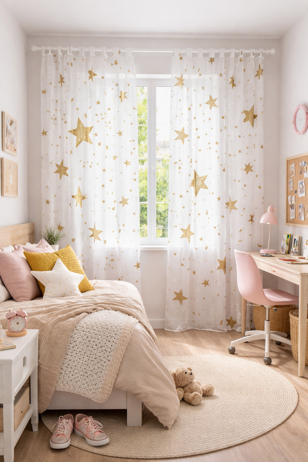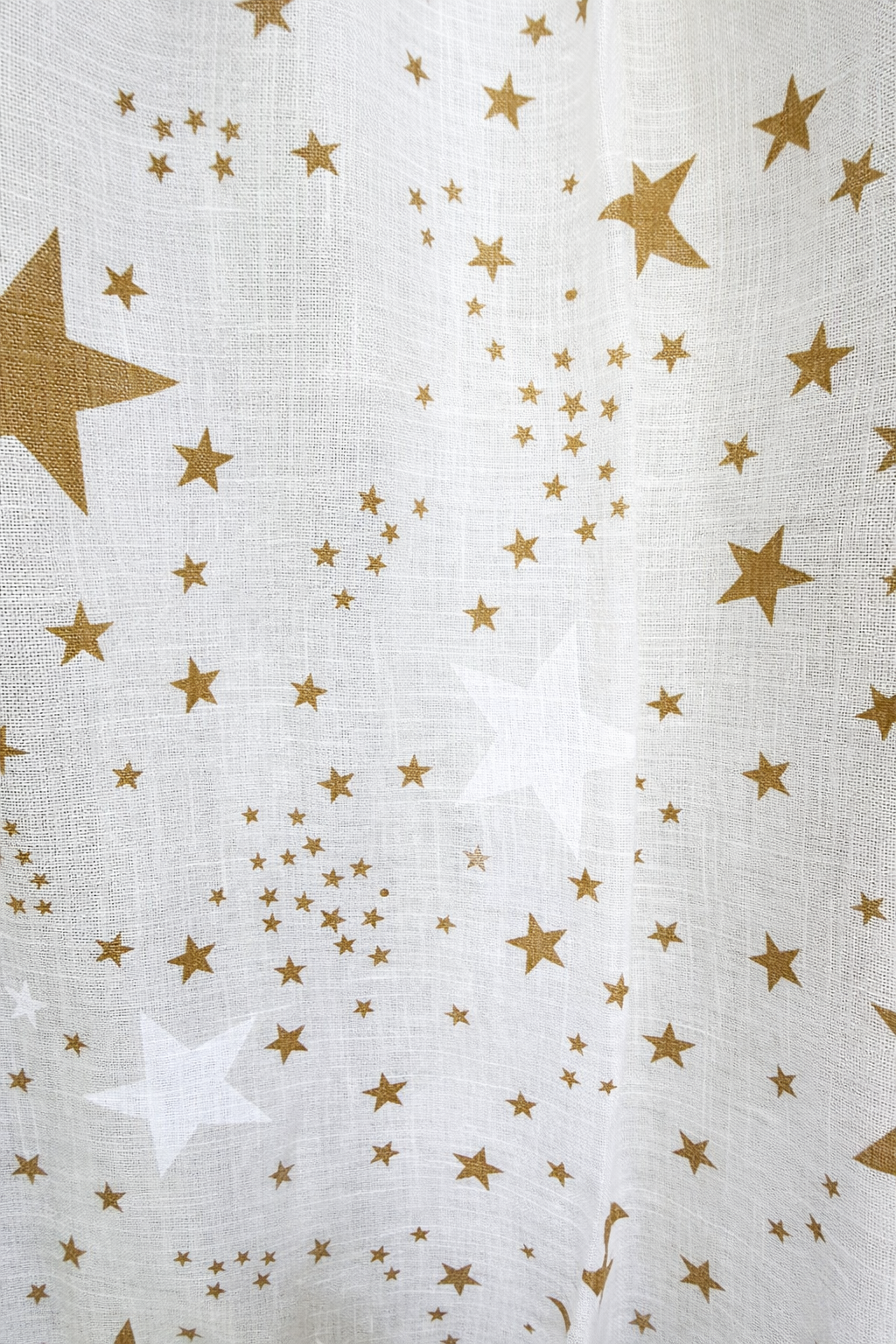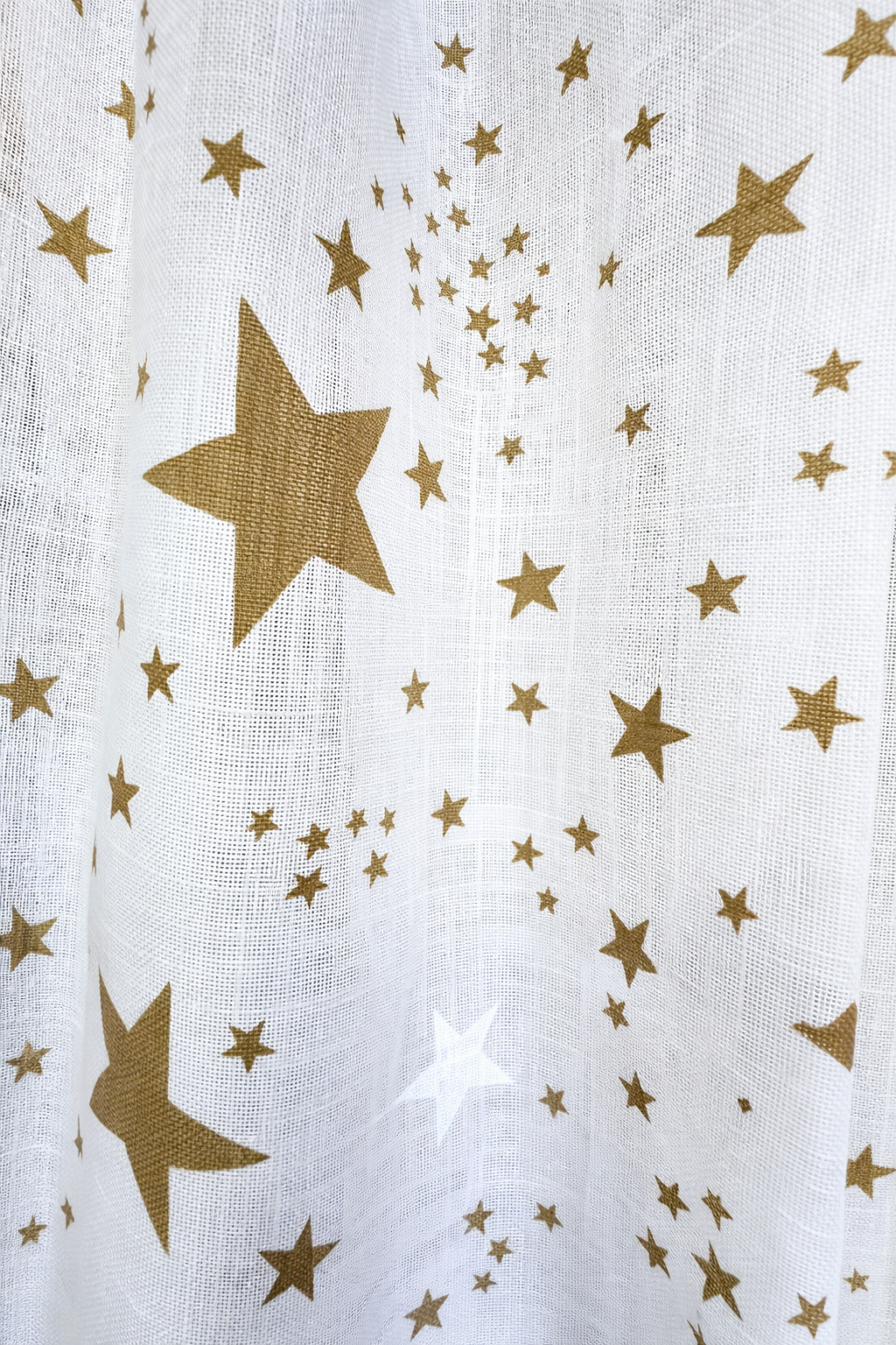 El visillo Galaxia Beige juvenil de estilo fresco y actual, confeccionado en tejido ligero tipo lino en color blanco natural. Decorado con estrellas en tono azul marino de efecto desgastado, aporta un aire moderno y desenfadado perfecto para dormitorios juveniles.. No encoje y puedes lavarla a máquina a 30º con un centrifugado suave. La tela ya viene acabada en uno de los orillos del ancho con un cordón de plomo, que sirve de peso, listo para utilizar como final del bajo de tus visillos, para decoraciones de hogar.