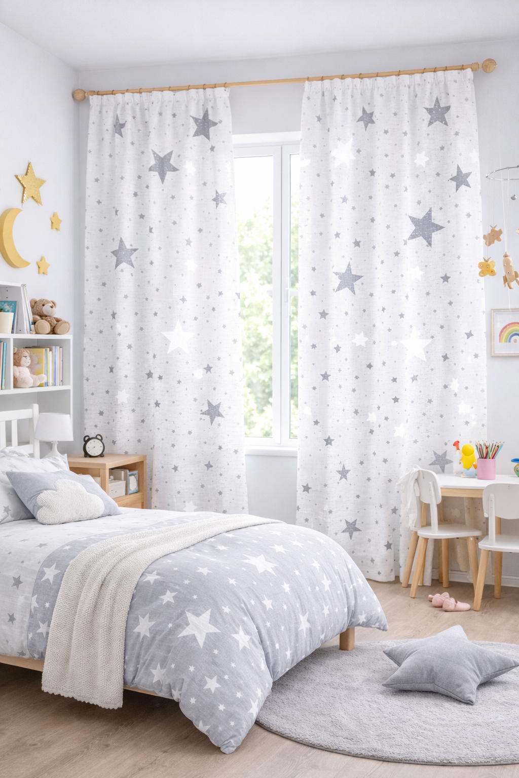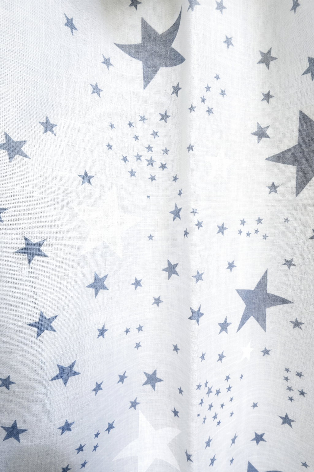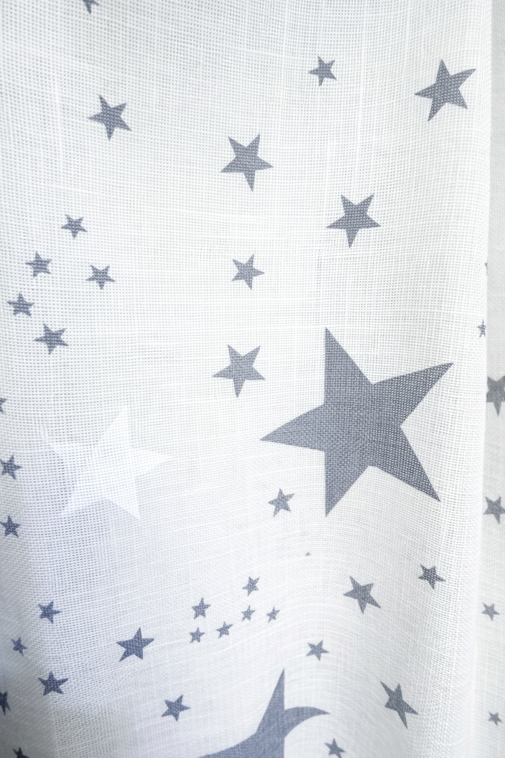 El visillo Galaxia Gris juvenil de estilo fresco y actual, confeccionado en tejido ligero tipo lino en color blanco natural. Decorado con estrellas en tono azul marino de efecto desgastado, aporta un aire moderno y desenfadado perfecto para dormitorios juveniles.. No encoje y puedes lavarla a máquina a 30º con un centrifugado suave. La tela ya viene acabada en uno de los orillos del ancho con un cordón de plomo, que sirve de peso, listo para utilizar como final del bajo de tus visillos, para decoraciones de hogar.