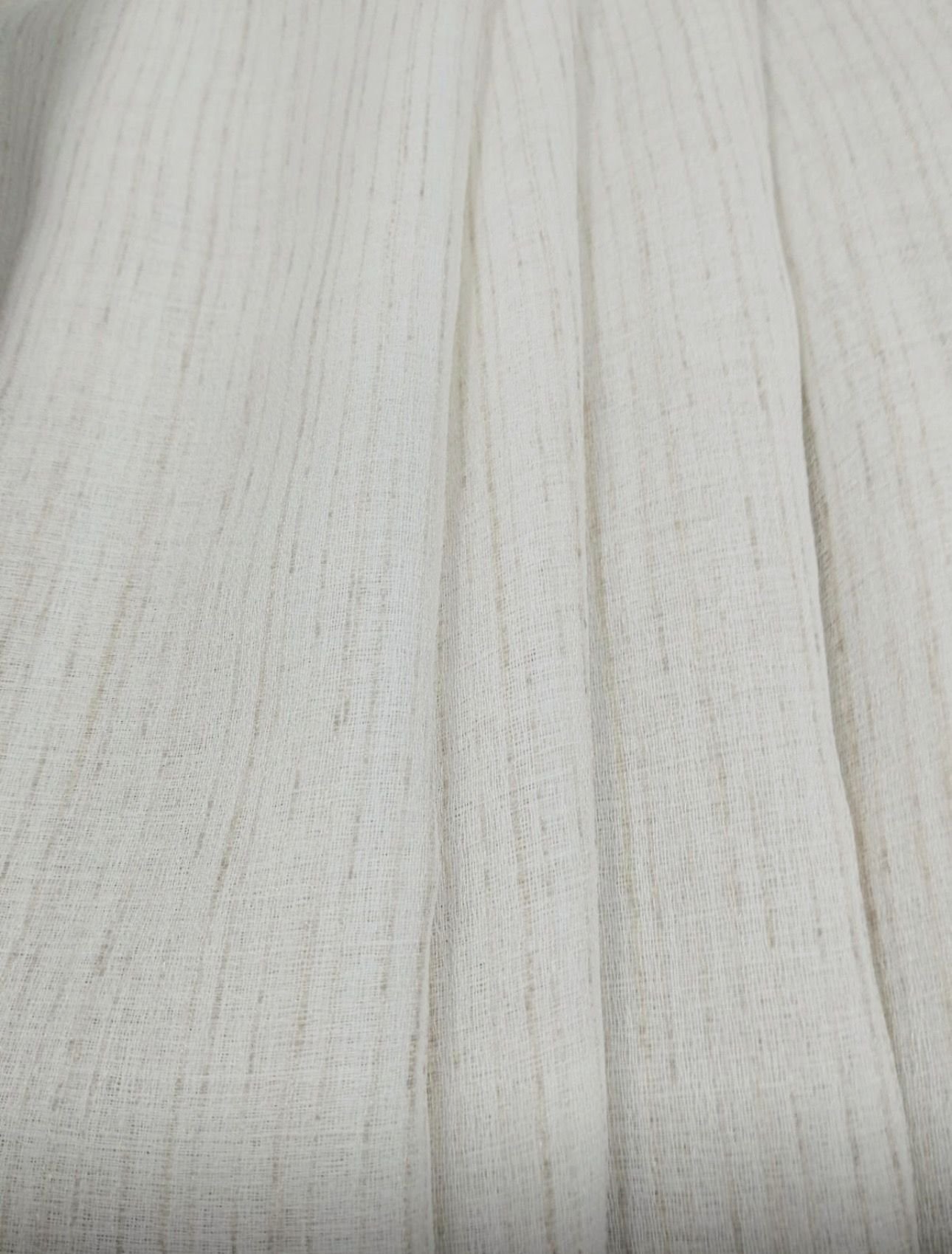 Tela de visillo a metros modelo K34 clásico con un estampado liso en tono blanco natural y jaspeado beige. Tela de poliéster con una caída y un tacto exquisito con una altura de 280 cm. Es una tela de visillo translúcida con buena caída para confección de cortinas. No encoje y puedes lavarla a máquina a 30º con un centrifugado suave. La tela ya viene acabada en uno de los orillos del ancho con un cordón de plomo, que sirve de peso, listo para utilizar como final del bajo de tus visillos, para decoraciones de hogar.