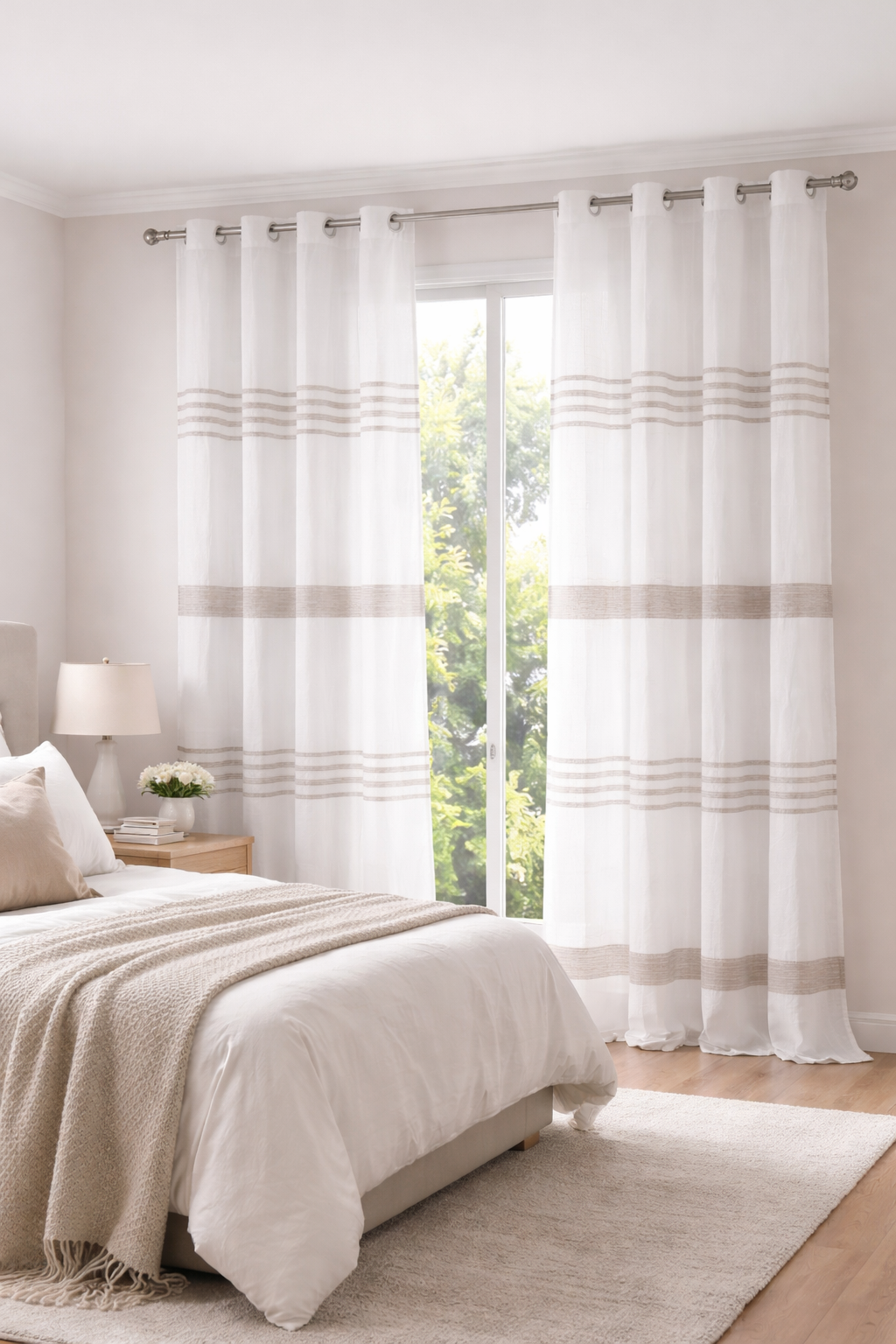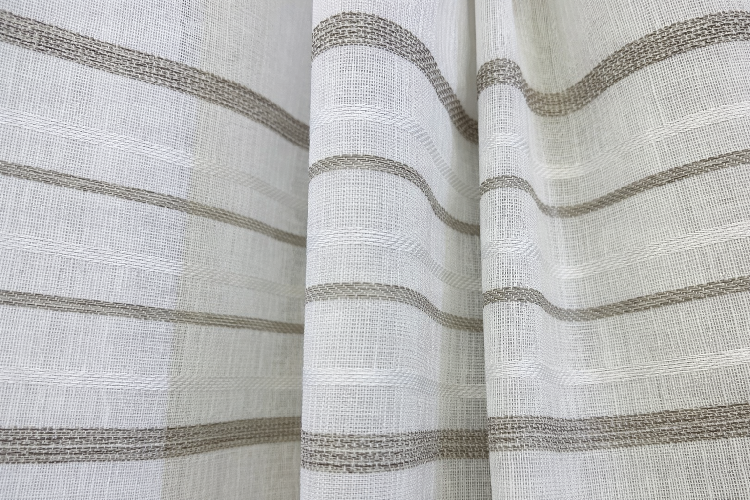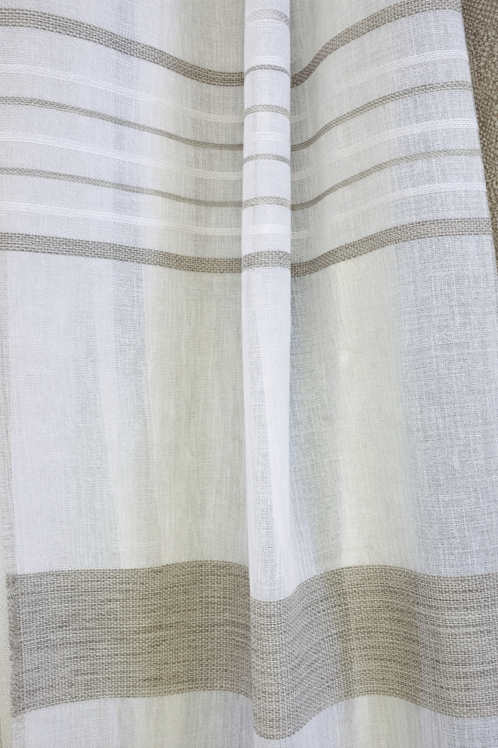 Tela de visillo a metros modelo Mans clásico con un estampado con cenefa en tonos beige, posición separada de las cenefas a 40 cm. Tela de poliéster con una caída y un tacto exquisito con una altura de 280 cm. Es una tela de visillo translúcida con buena caída para confección de cortinas. No encoje y puedes lavarla a máquina a 30º con un centrifugado suave. La tela ya viene acabada en uno de los orillos del ancho con un cordón de plomo, que sirve de peso, listo para utilizar como final del bajo de tus visillos, para decoraciones de hogar.