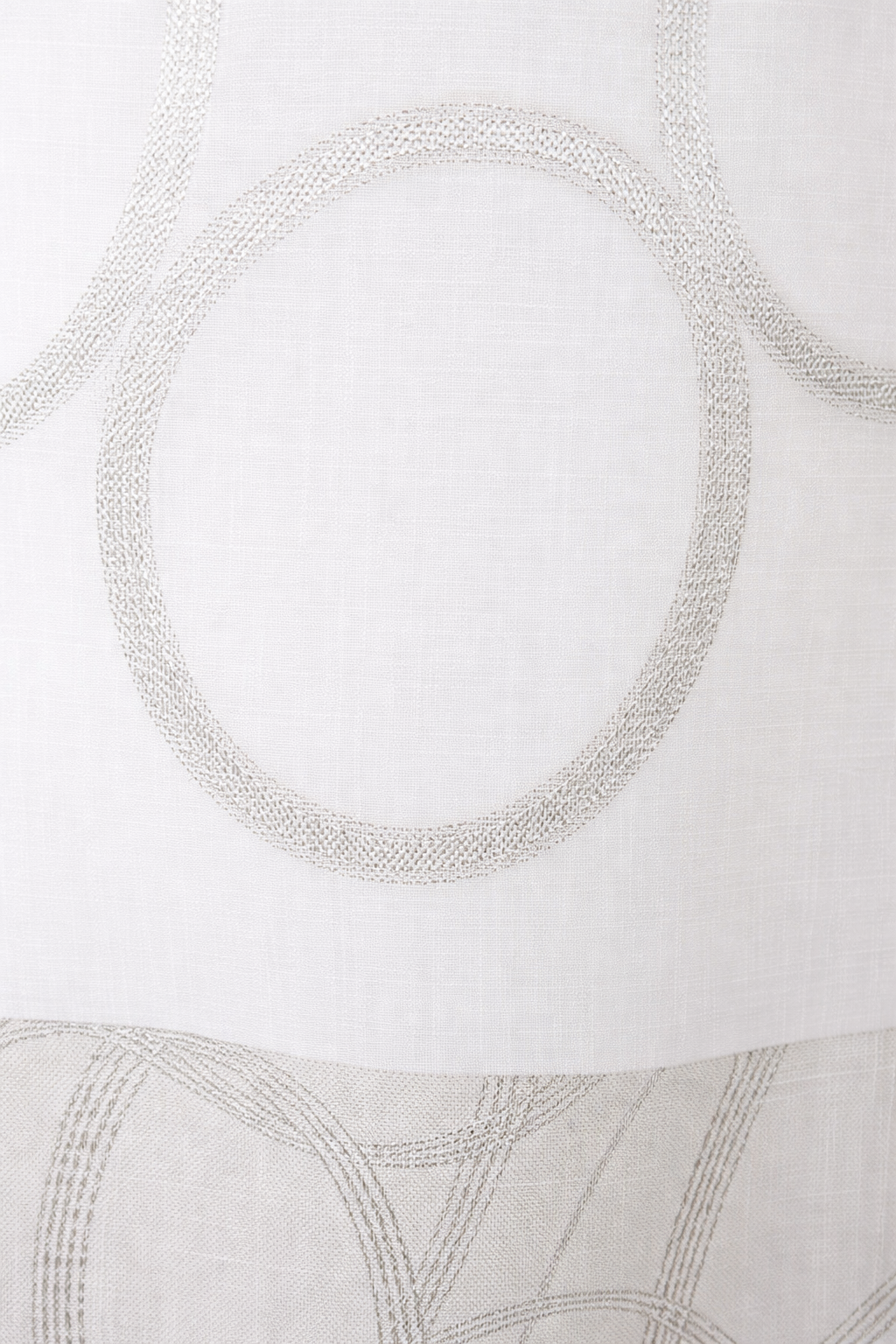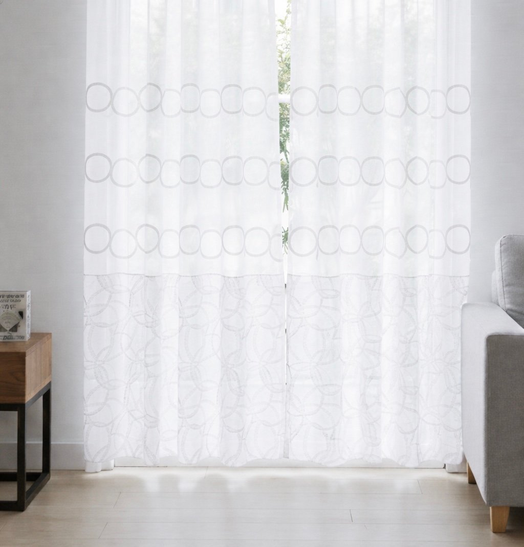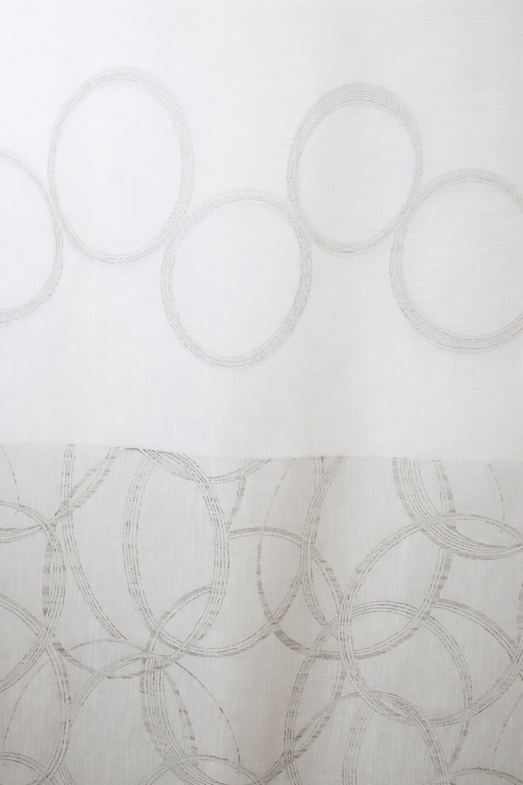 Tela de visillo a metros modelo Melani c2 con un estampado en espirales tonos grises y blancos. Tela de poliéster con una caída y un tacto exquisito con una altura de 300cm. Es una tela de visillo translúcida con buena caída para confección de cortinas. No encoje y puedes lavarla a máquina a 30º con un centrifugado suave. La tela ya viene acabada en uno de los orillos del ancho con un cordón de plomo, que sirve de peso, listo para utilizar como final del bajo de tus visillos, para decoraciones de hogar.