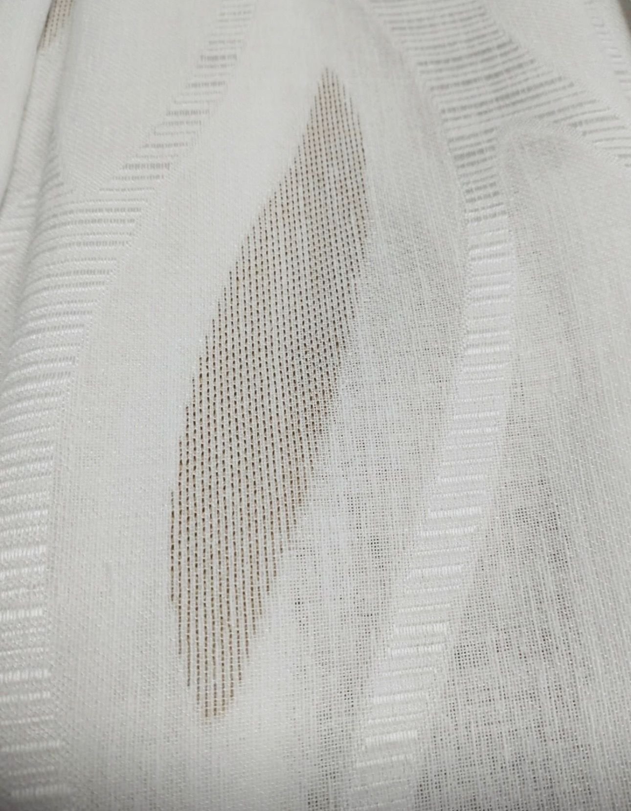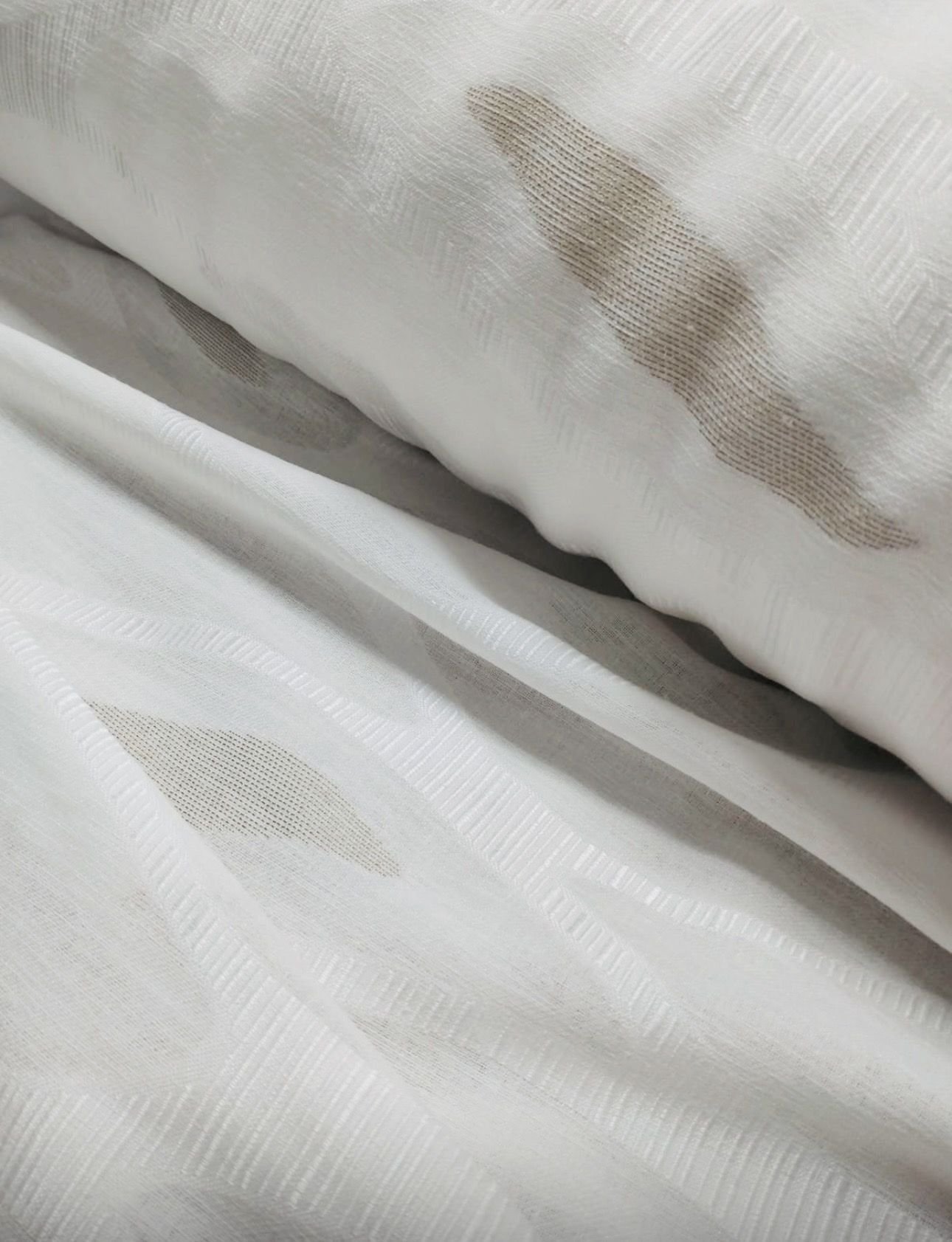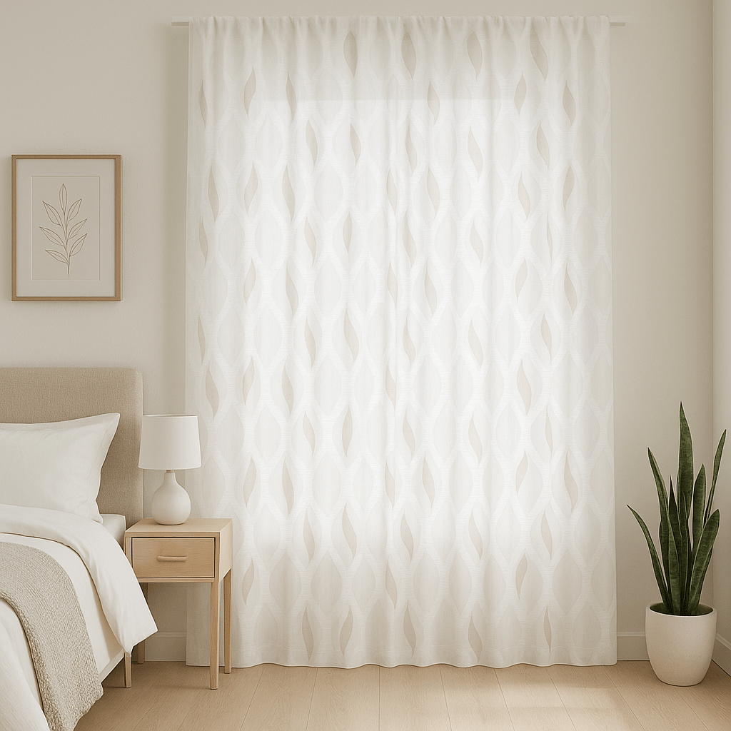 Tela de visillo a metros modelo Taigo clásico en blanco natural con un estampado bordado en beige y blanco haciendo un dibujo geométrico muy fino. Tela de poliéster con una caída y un tacto exquisito con una altura de 300 cm. Con dibujo orgánico marcado y efecto luminoso, perfecto para dormitorios modernos y acogedores.