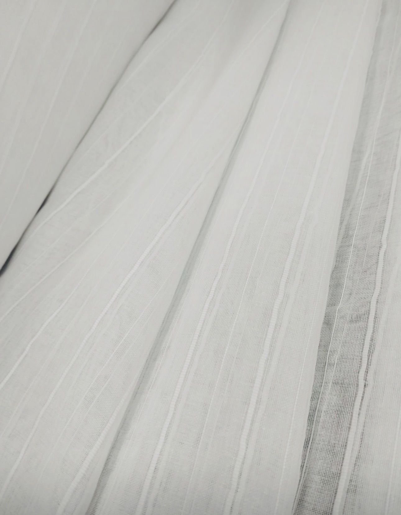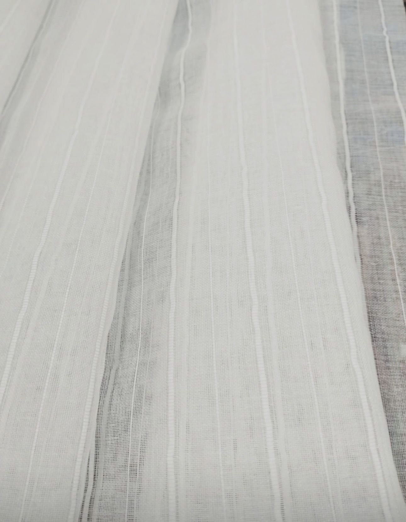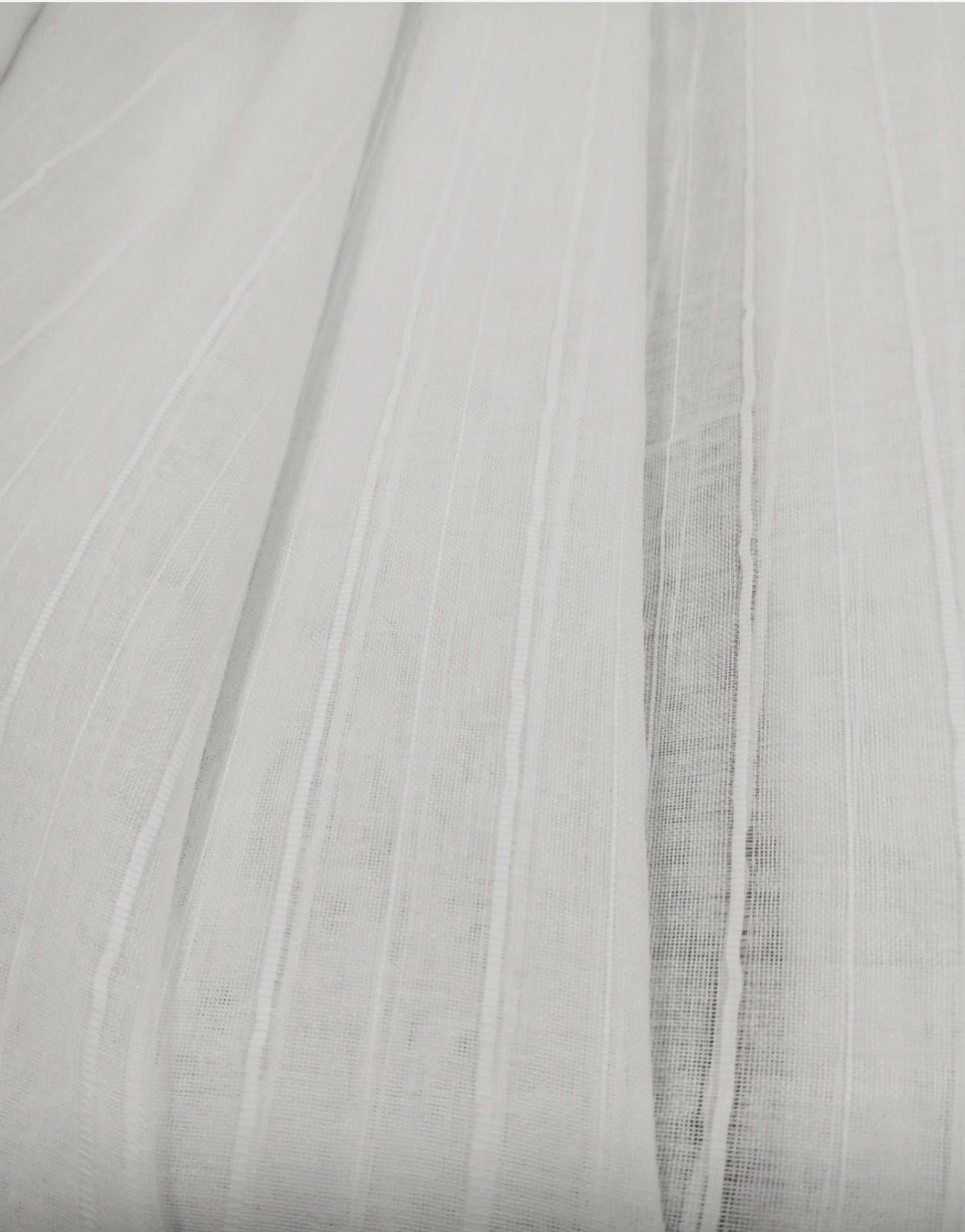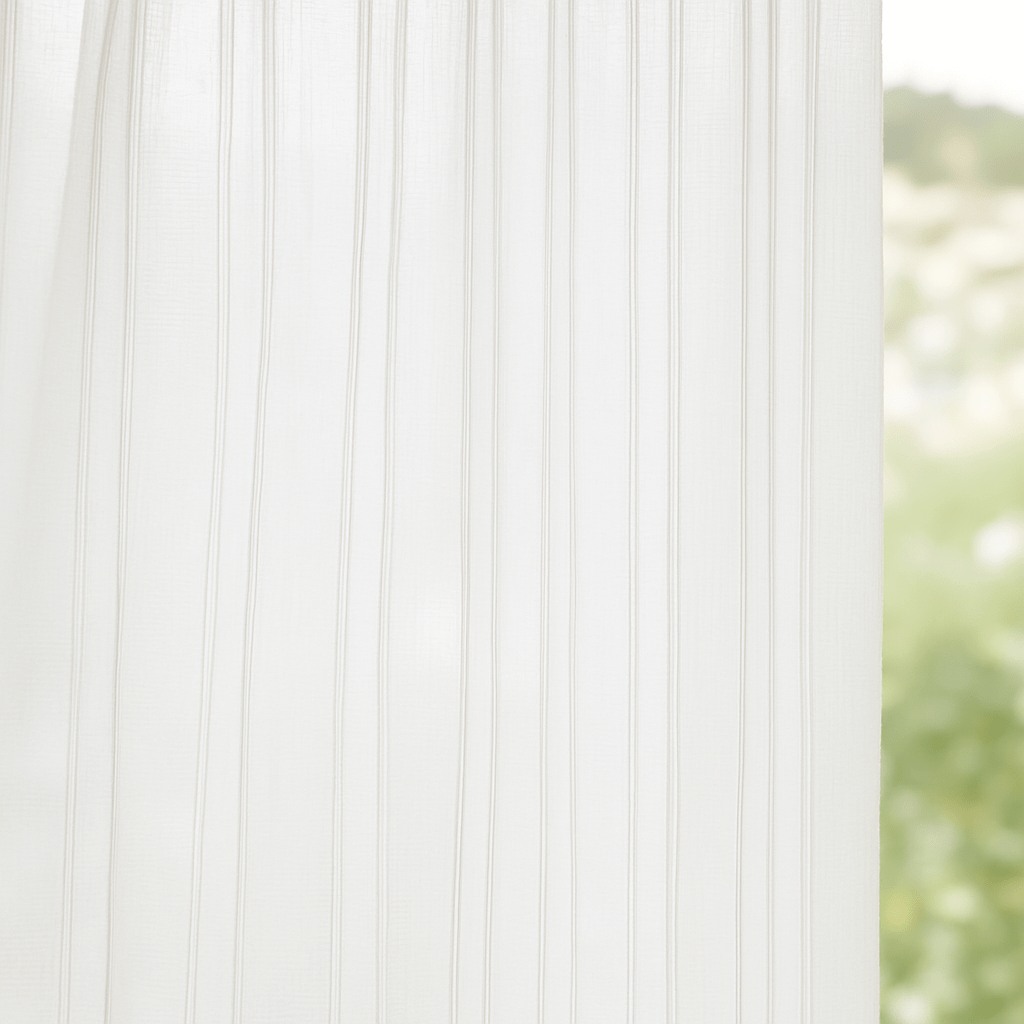Tela de visillo a metros modelo F5 natural clásico con un estampado liso en tono blanco natural y rayas verticales bordadas. Tela de poliéster con una caída y un tacto exquisito con una altura de 280 cm. Es una tela de visillo translúcida con buena caída para confección de cortinas. No encoje y puedes lavarla a máquina a 30º con un centrifugado suave. La tela ya viene acabada en uno de los orillos del ancho con un cordón de plomo, que sirve de peso, listo para utilizar como final del bajo de tus visillos, para decoraciones de hogar.