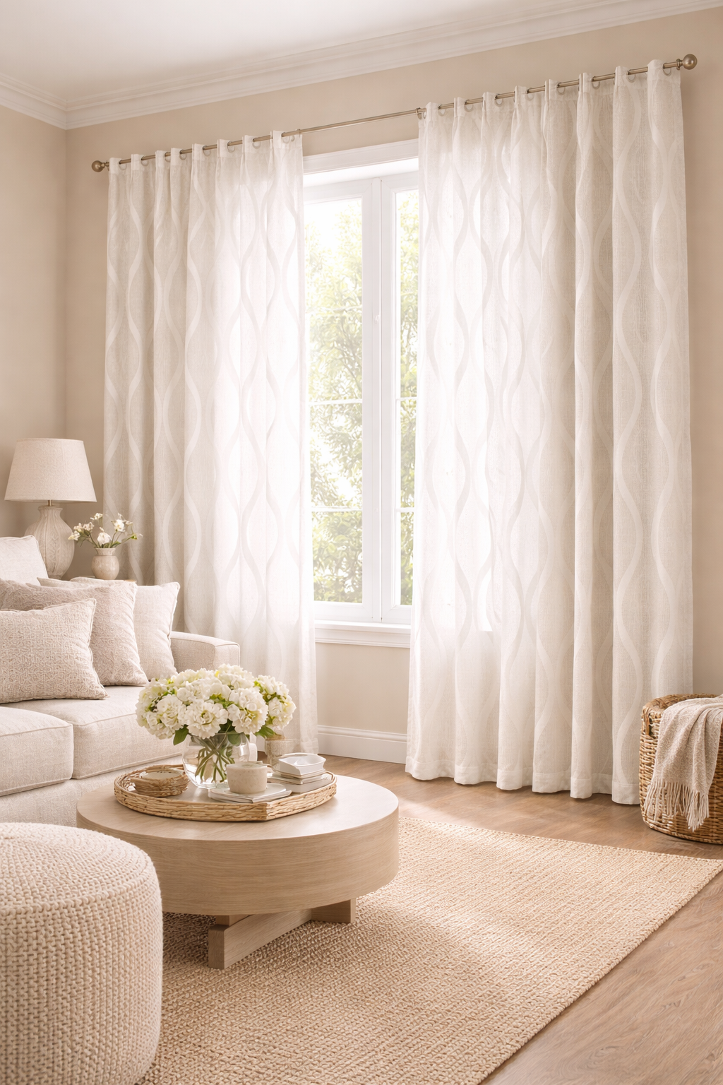 Tela de visillo a metros modelo Nexo c/6 con un estampado en tonos naturales y beige. Tela de poliéster 100% con una caída y un tacto exquisito con una altura de 300cm. Es una tela de visillo translúcida con buena caída para confección de cortinas. No encoje y puedes lavarla a máquina a 30º con un centrifugado suave. La tela ya viene acabada en uno de los orillos del ancho con un cordón de plomo, que sirve de peso, listo para utilizar como final del bajo de tus visillos. para decoraciones de Hogar.