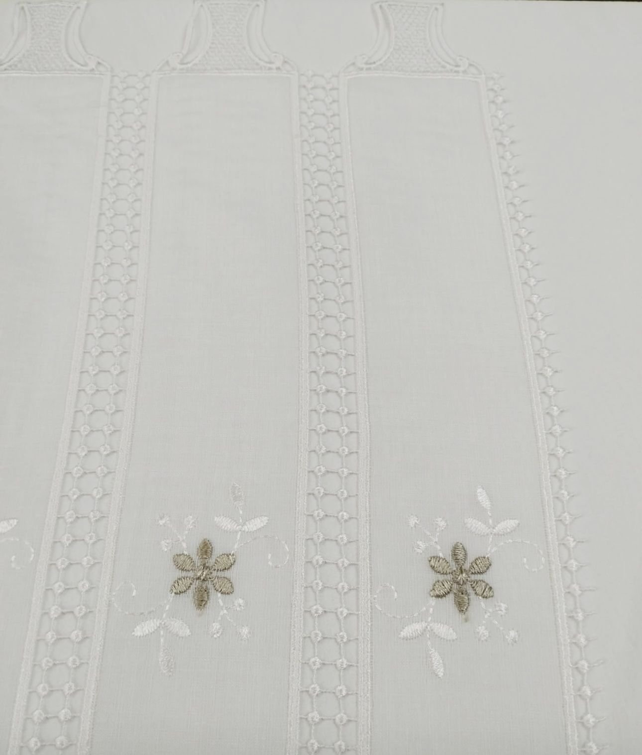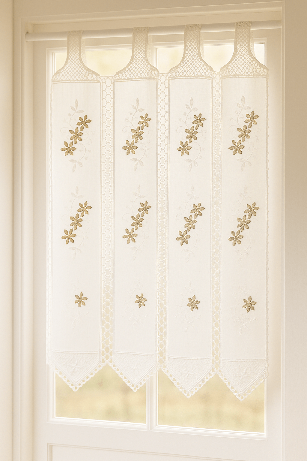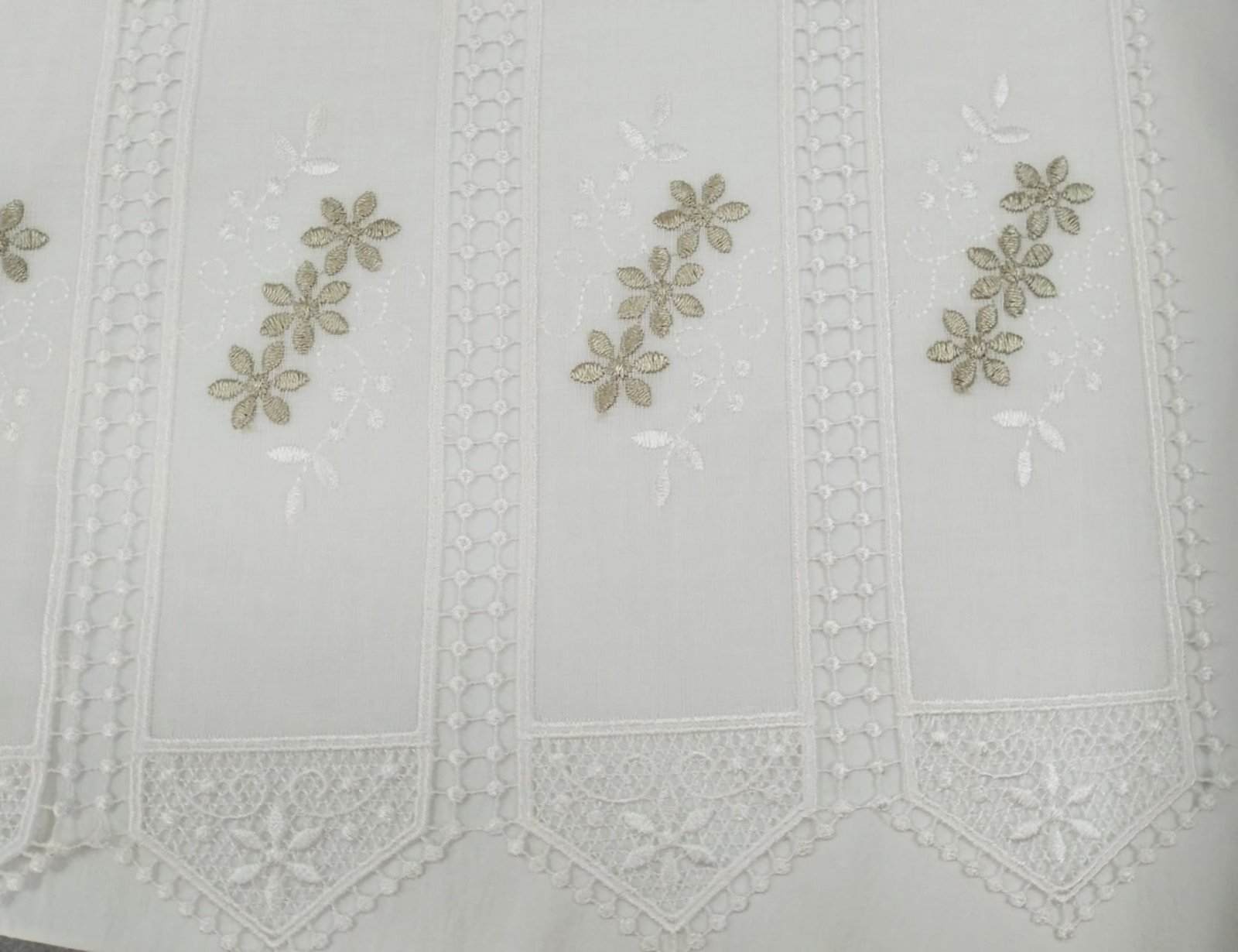 Visillo holandés con diseño clásico bordado. Tiene los ojales completamente acabados y está lista para colgar – estirada o fruncida.
