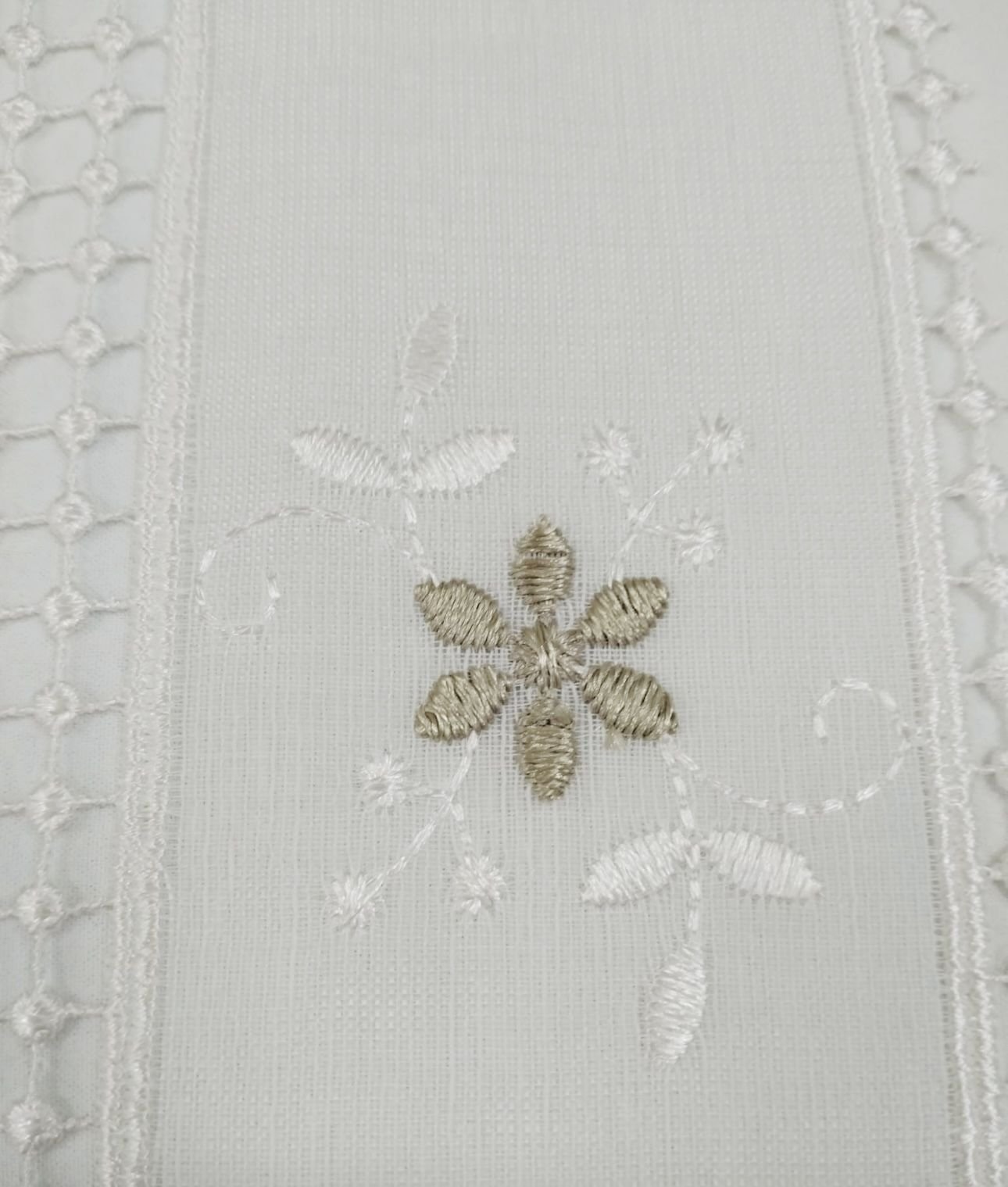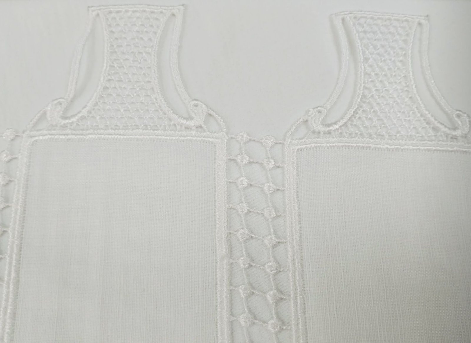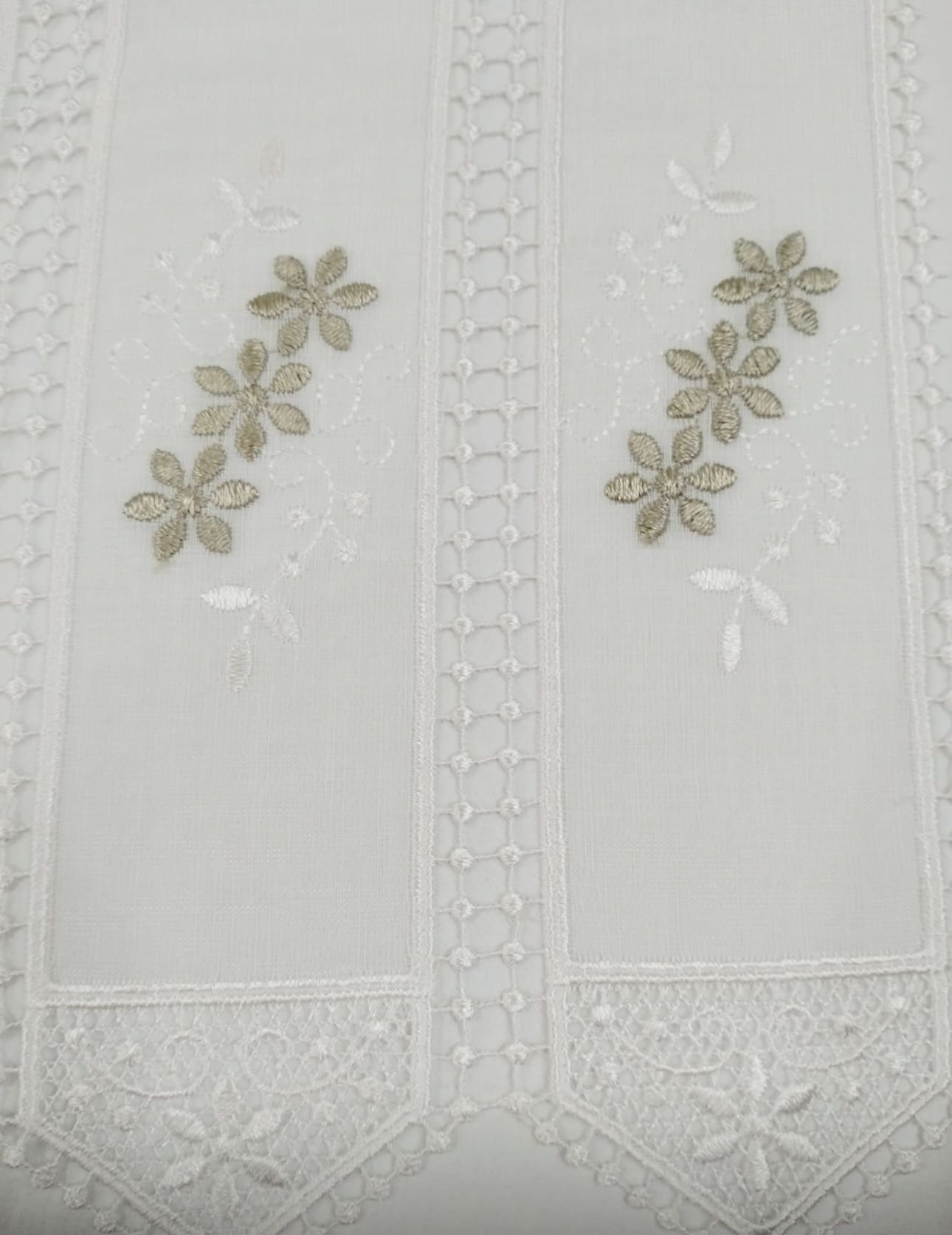 Visillo holandés con diseño clásico bordado. Tiene los ojales completamente acabados y está lista para colgar – estirada o fruncida.
