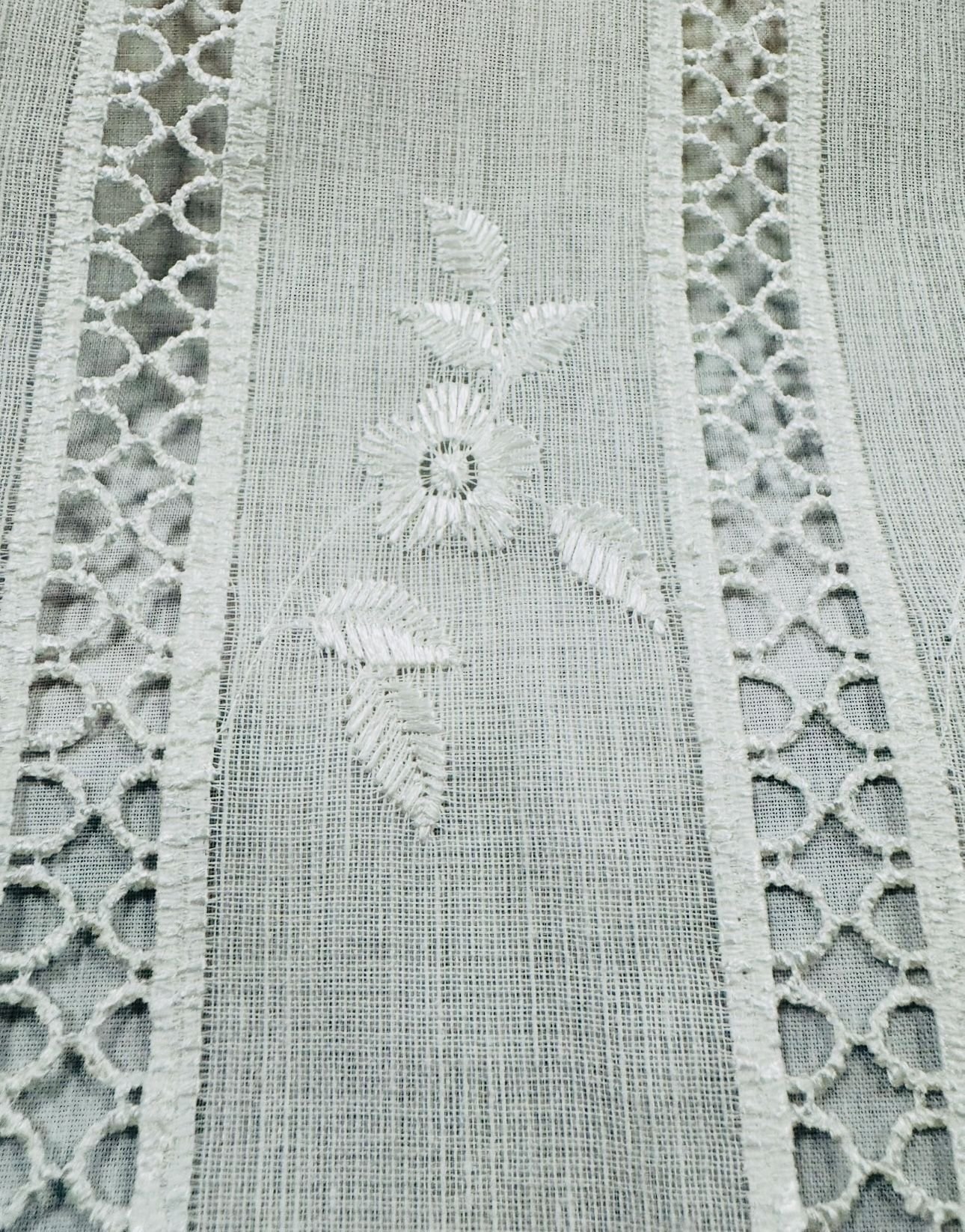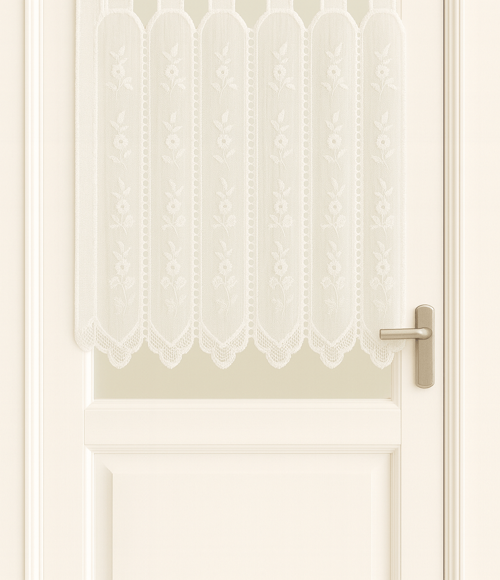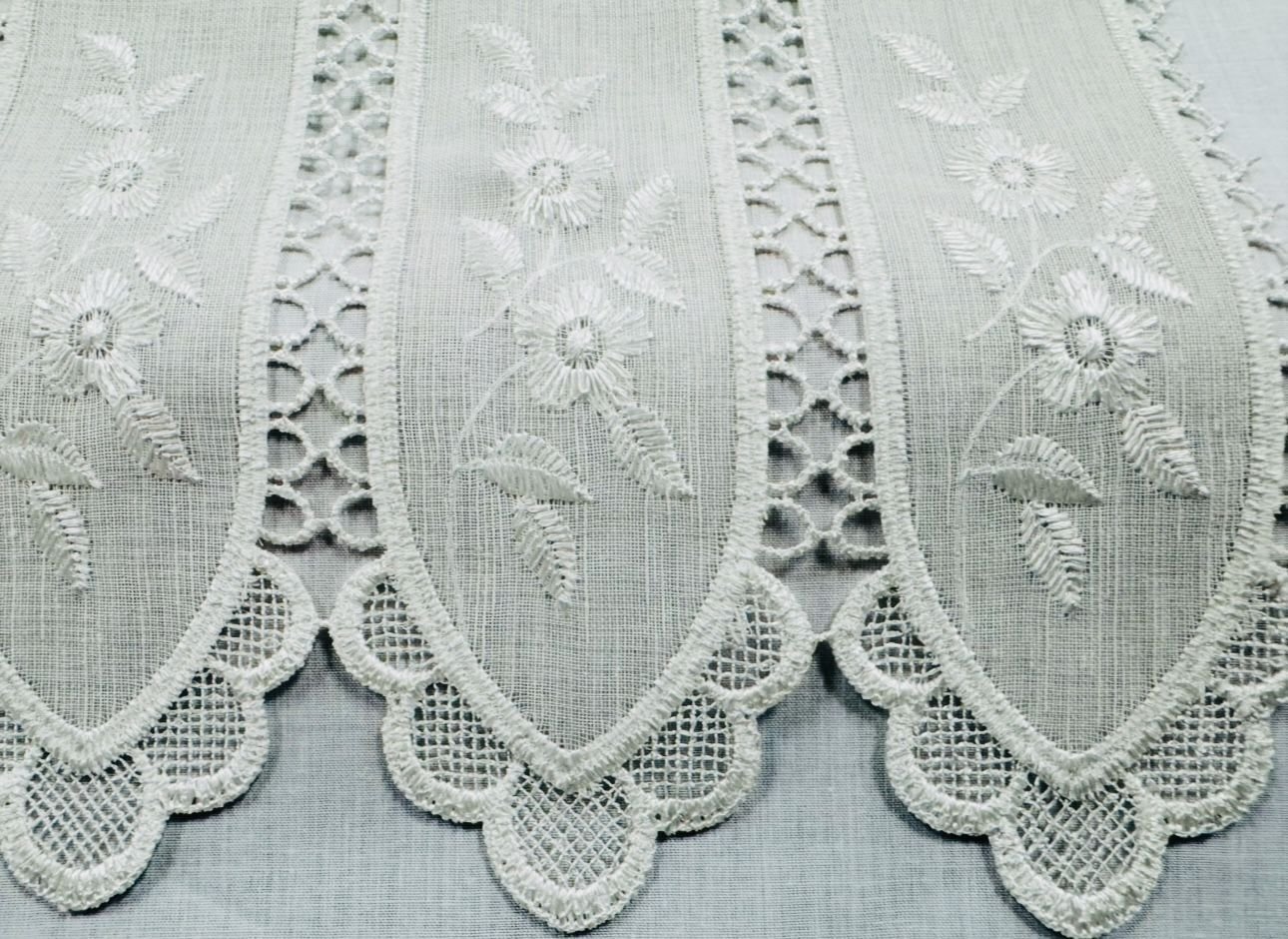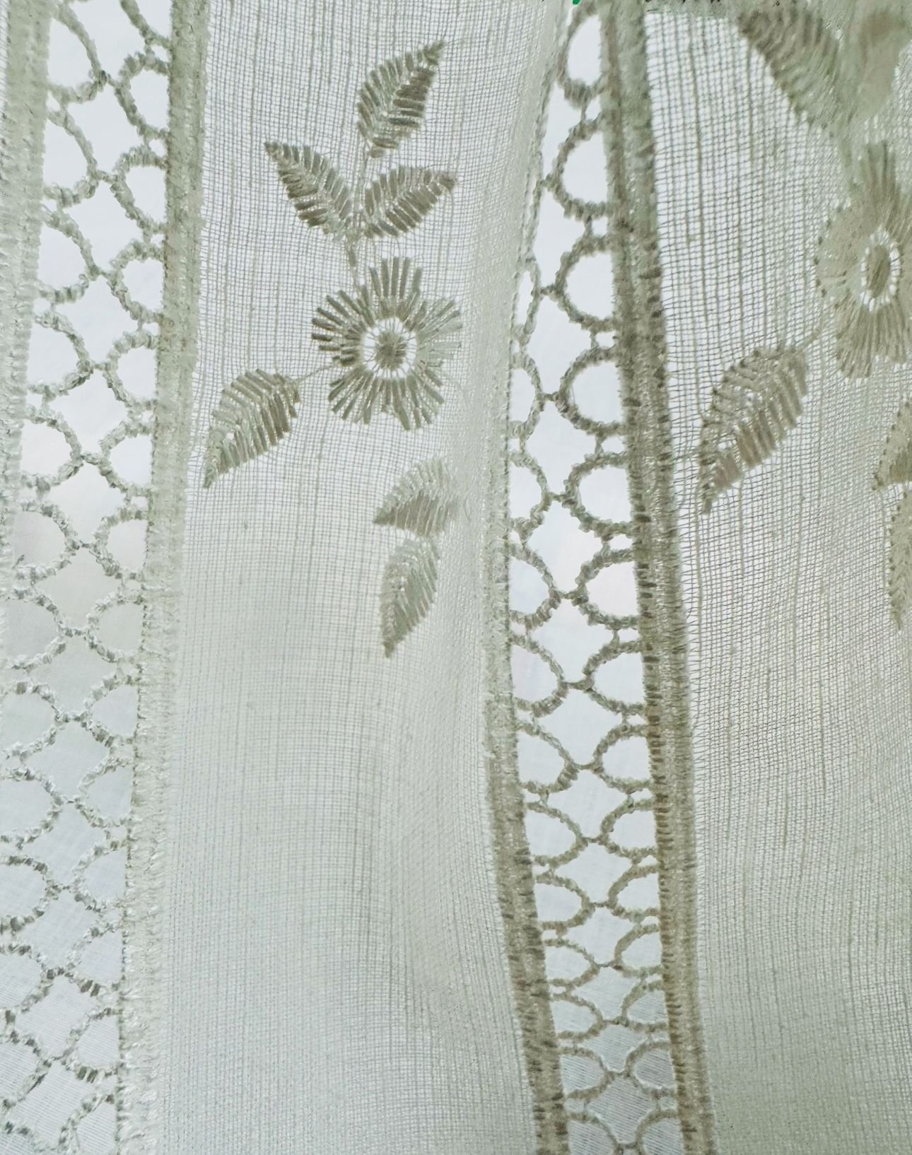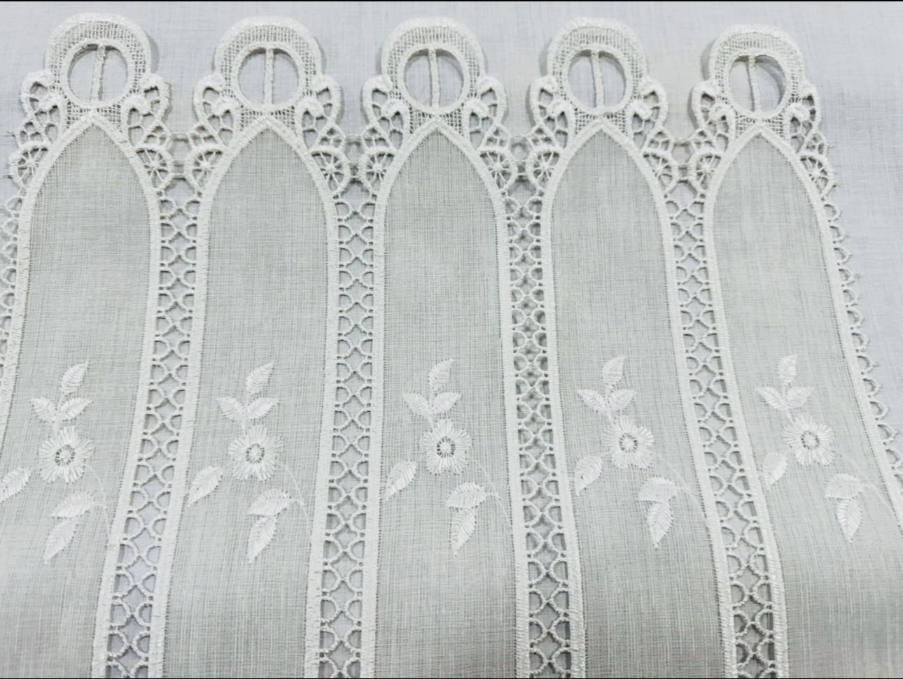 Visillo holandés con diseño clásico bordado. Tiene los ojales completamente acabados y está lista para colgar – estirada o fruncida.