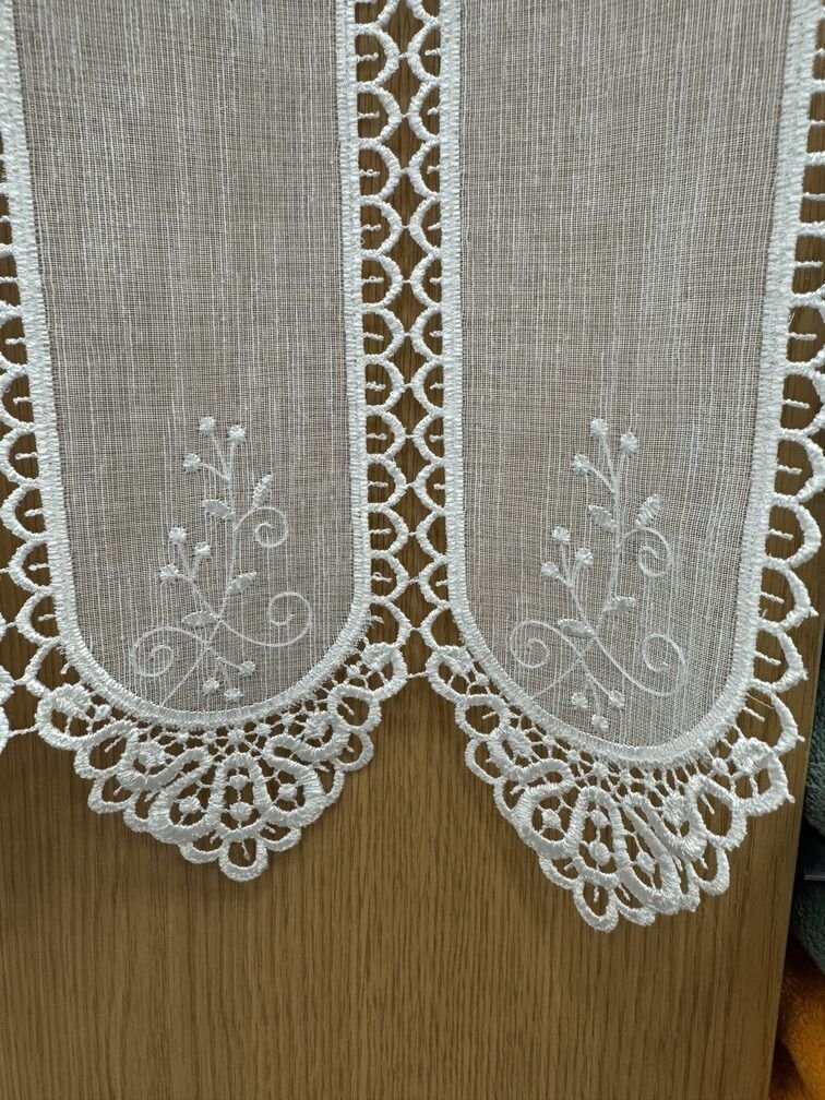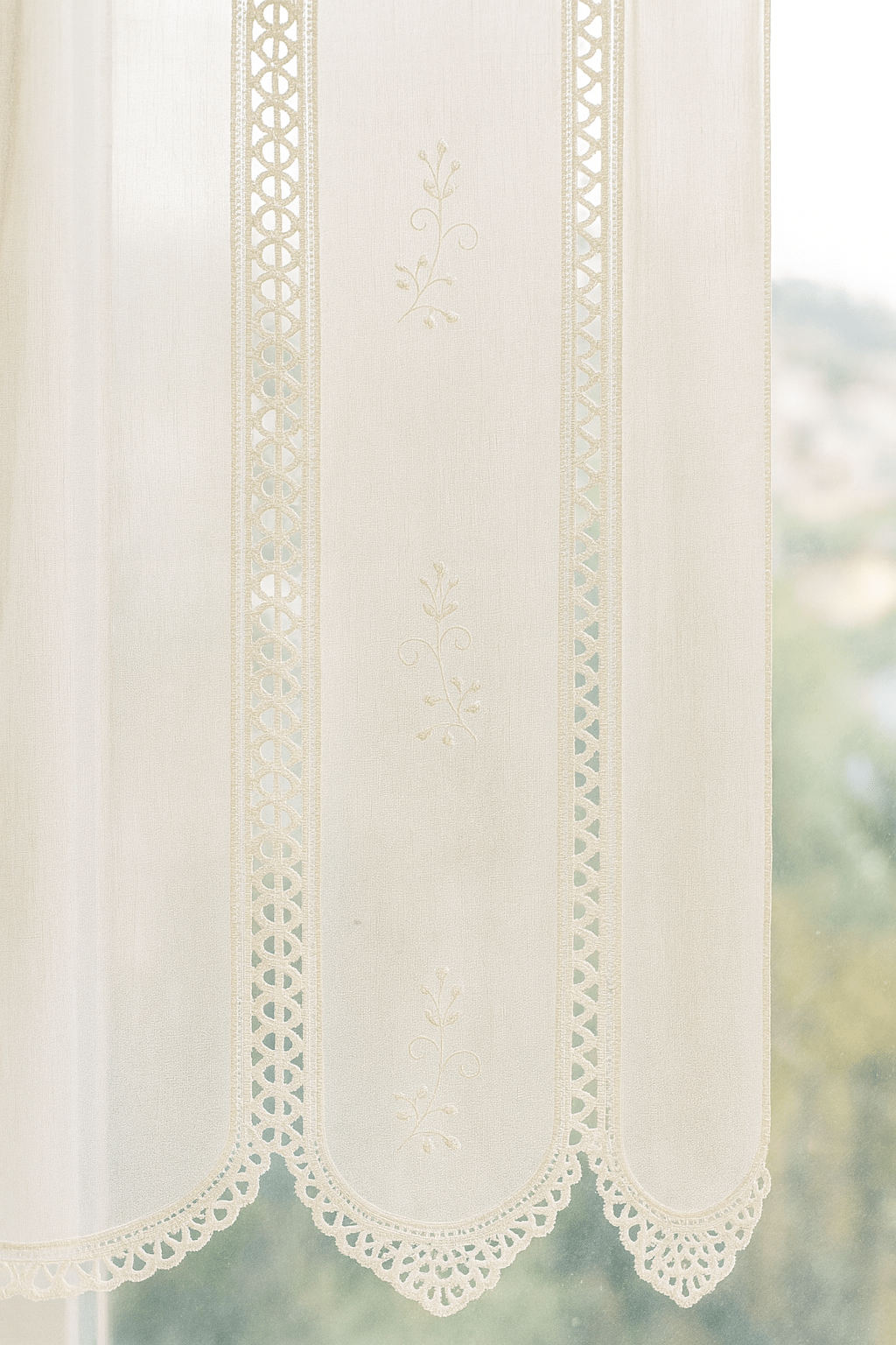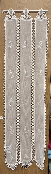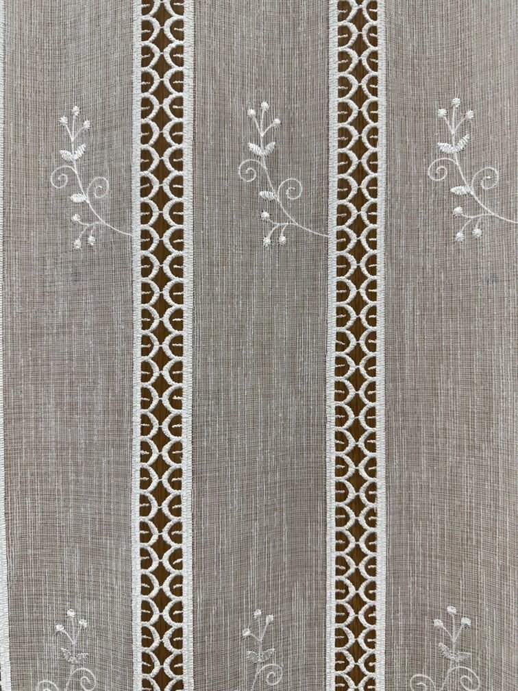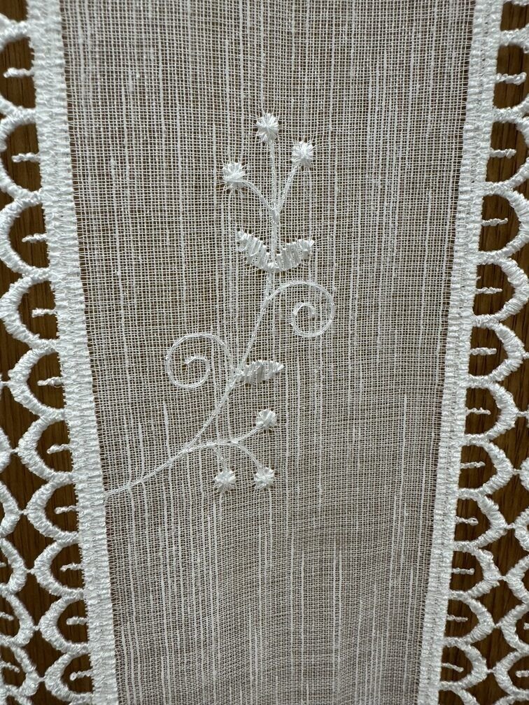 Visillo holandés con diseño clásico bordado. Tiene los ojales completamente acabados y está lista para colgar – estirada o fruncida.