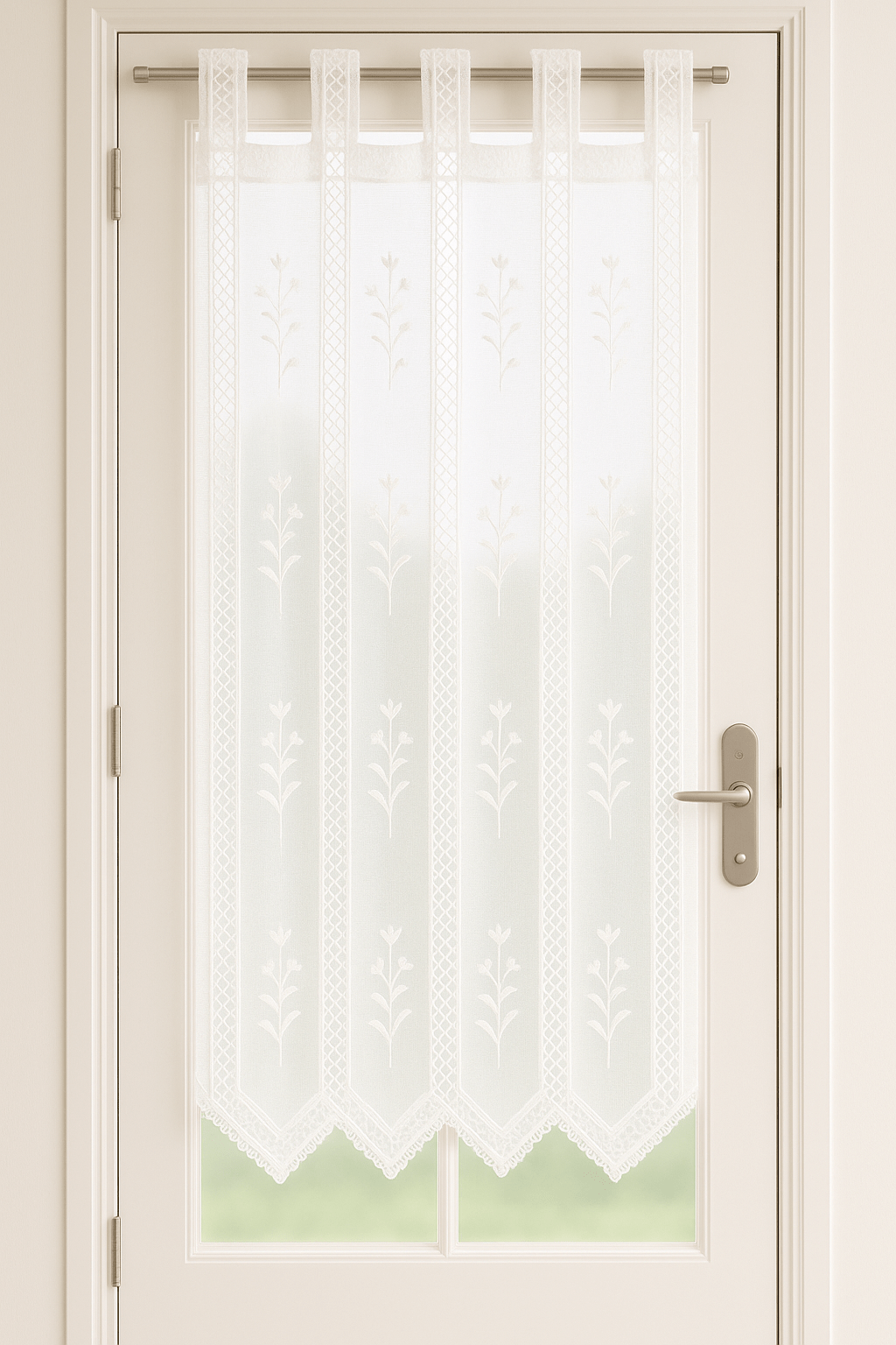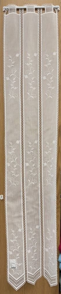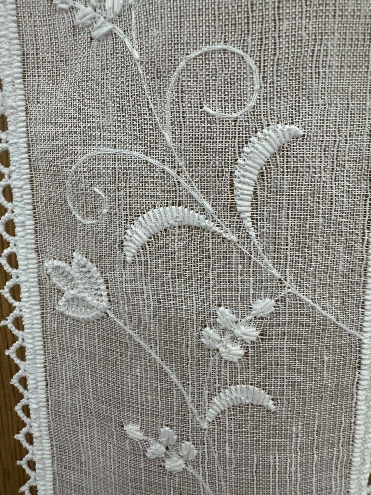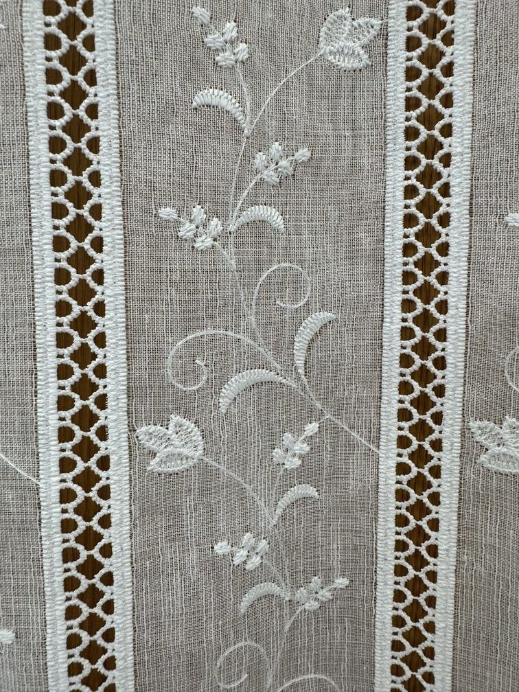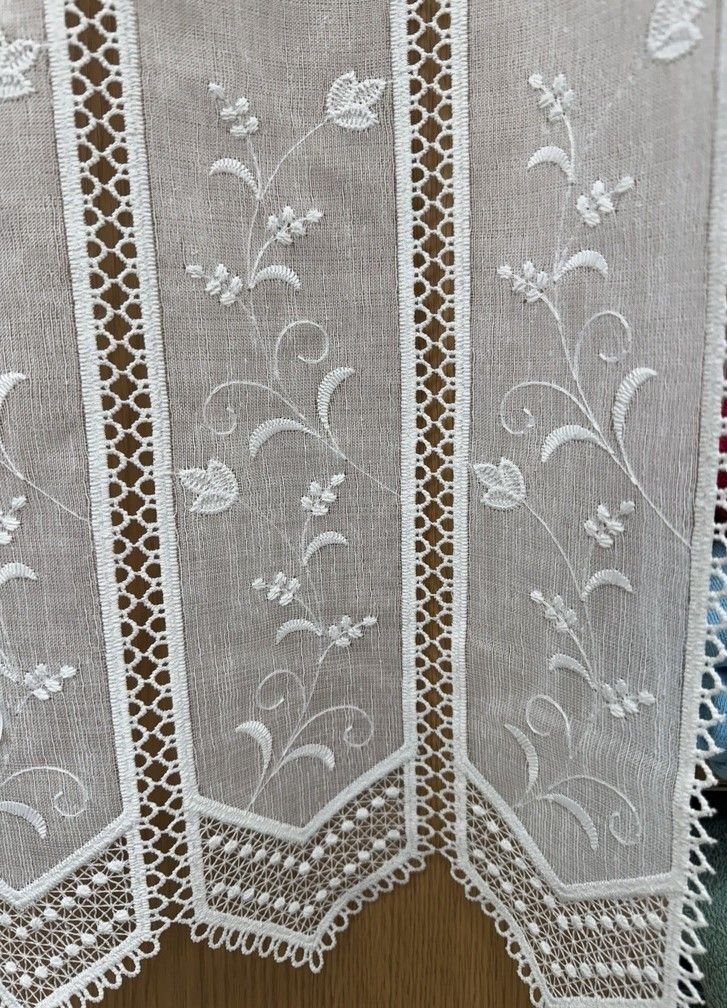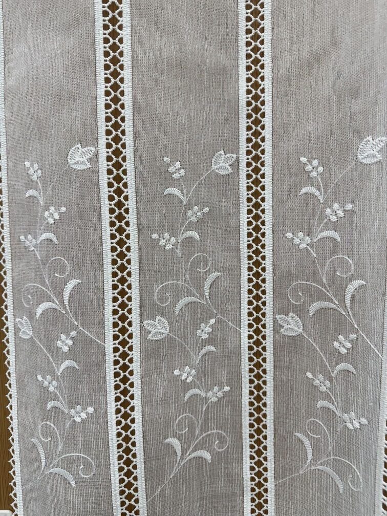 Visillo holandés con diseño clásico bordado. Tiene los ojales completamente acabados y está lista para colgar – estirada o fruncida.